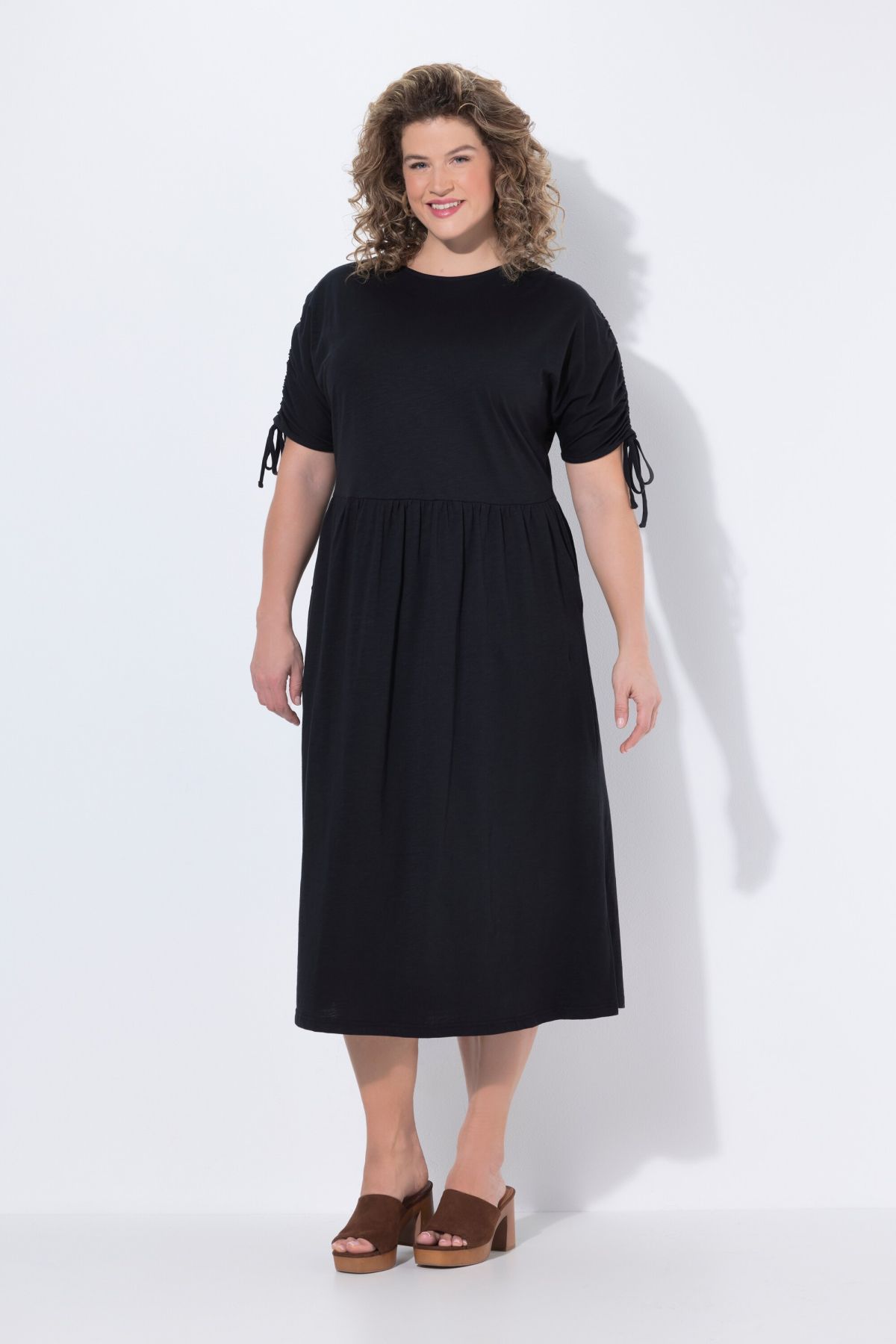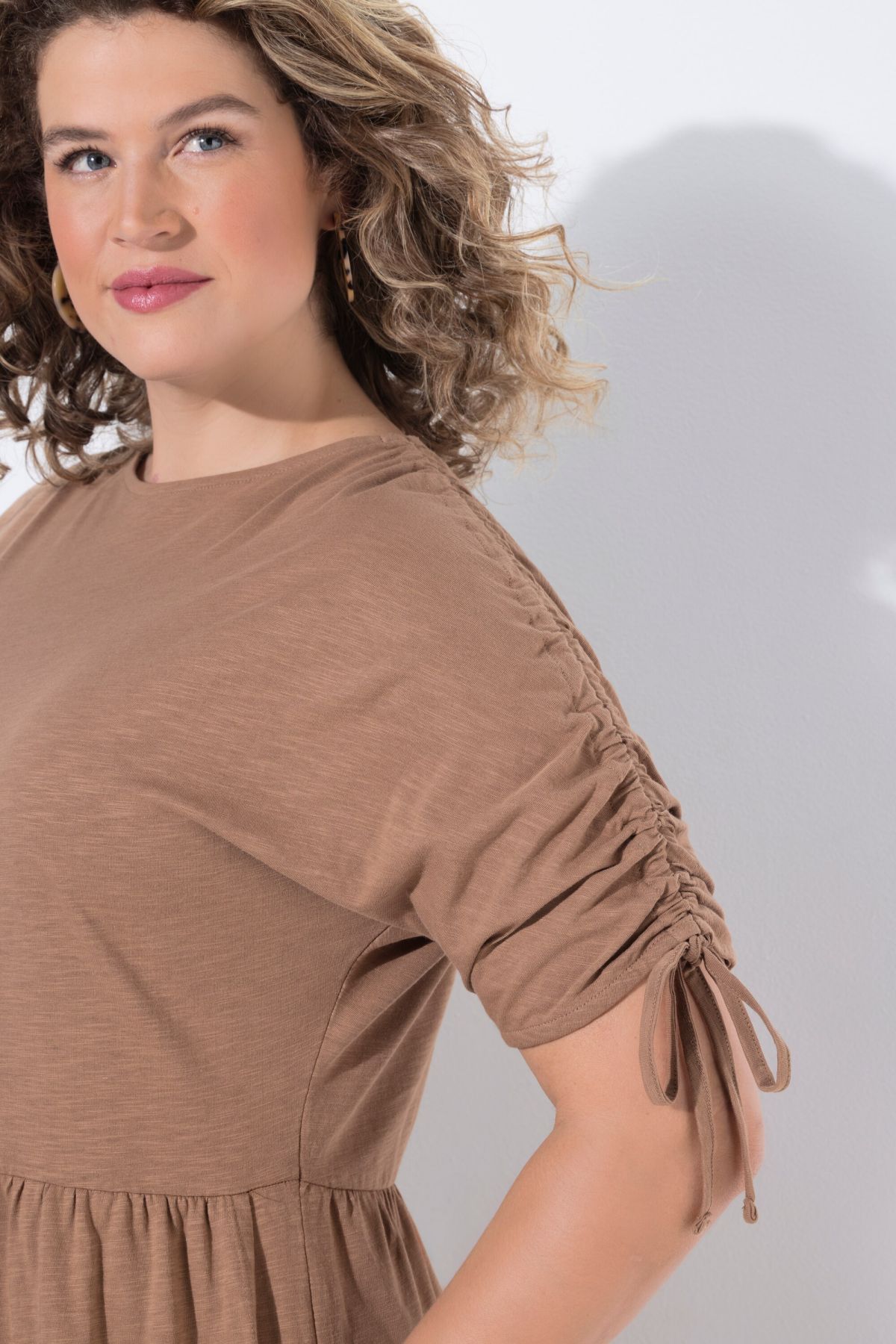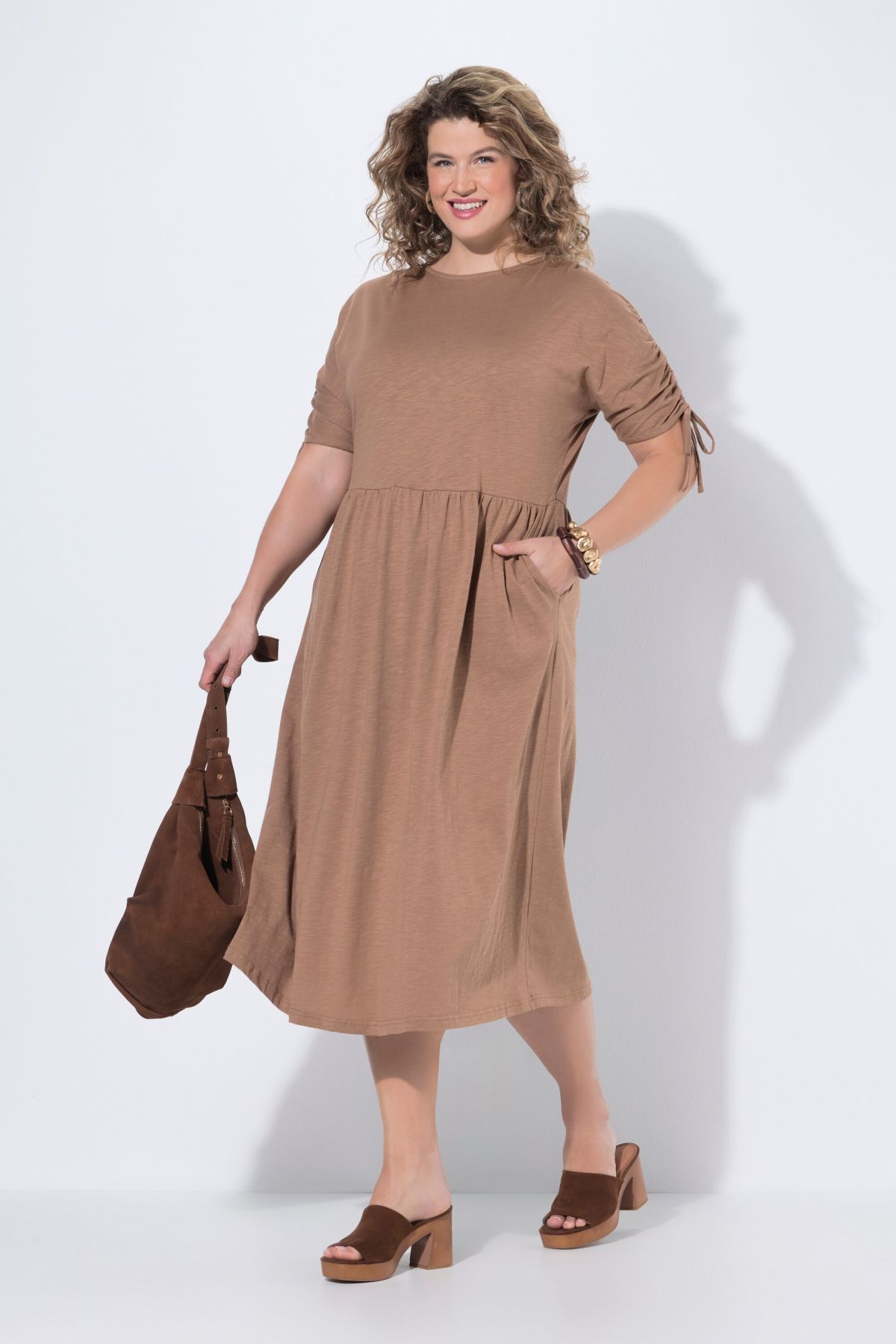 Épaules basses, petits cordons à froncer au bas des manches, Col rond, Coupe évasée et taille élastique, Poches sur les côtés, Coton bio durable, Long. env. 120 cm.