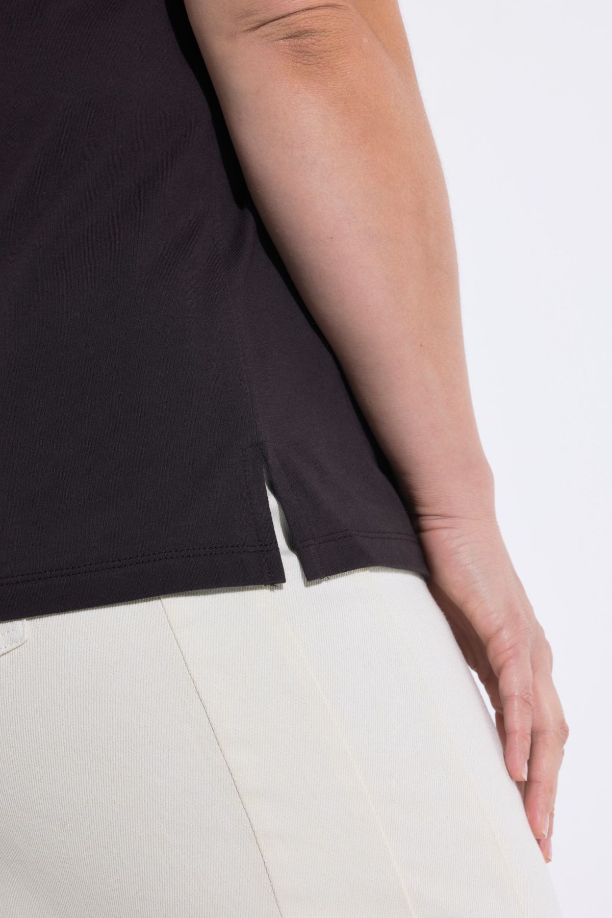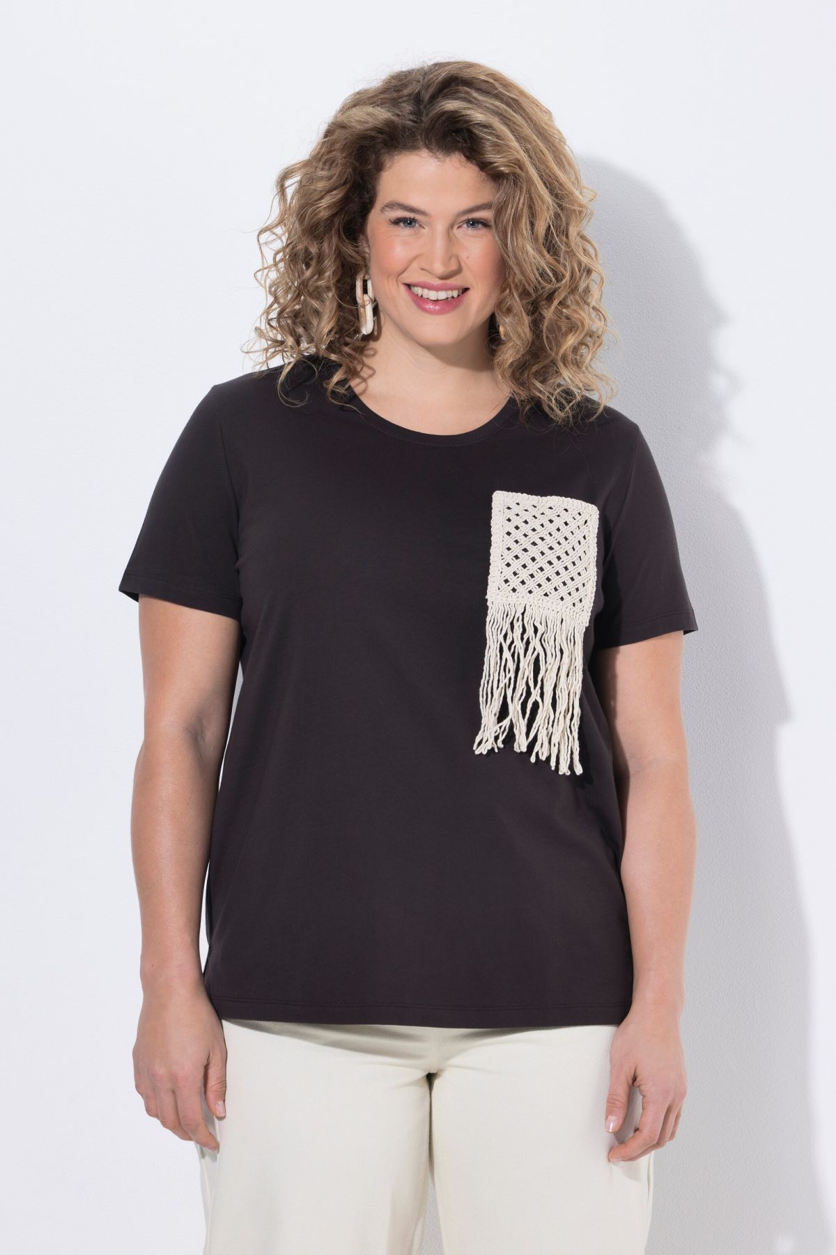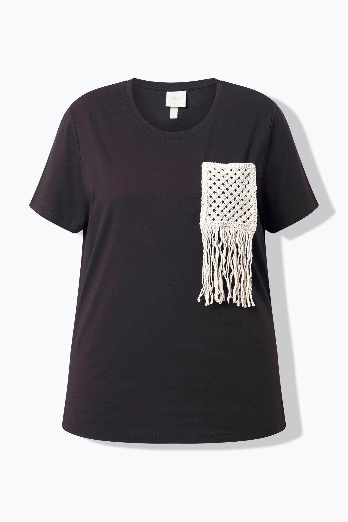Poche poitrine en crochet de couleur contrastante, avec franges, Col rond, Coupe confortable, fentes sur les côtés, Manches courtes, Coton bio durable, Long. selon taille env. 68-76 cm.