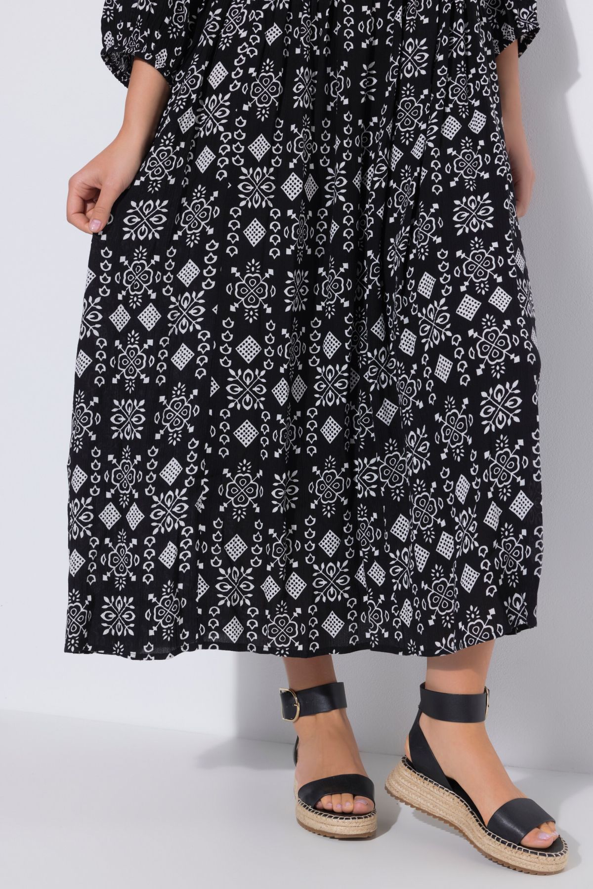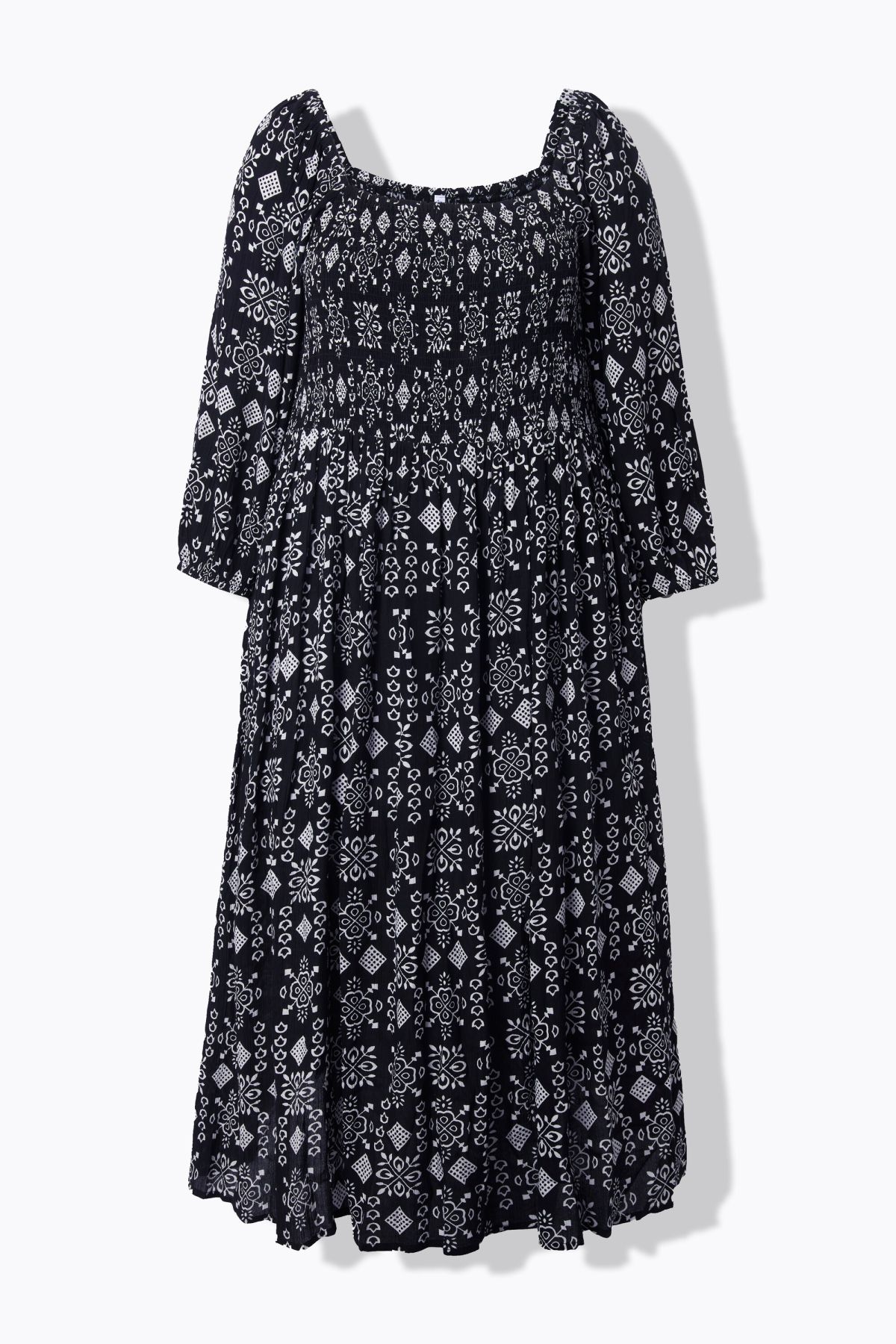 Imprimé tendance, Décolleté carré, Coupe évasée, tissu smocké élastique jusqu'à la taille, Manches 3/4 raglan avec extrémité smockée élastique, Crêpe de viscose doux et confortable, Long. env. 110 cm.