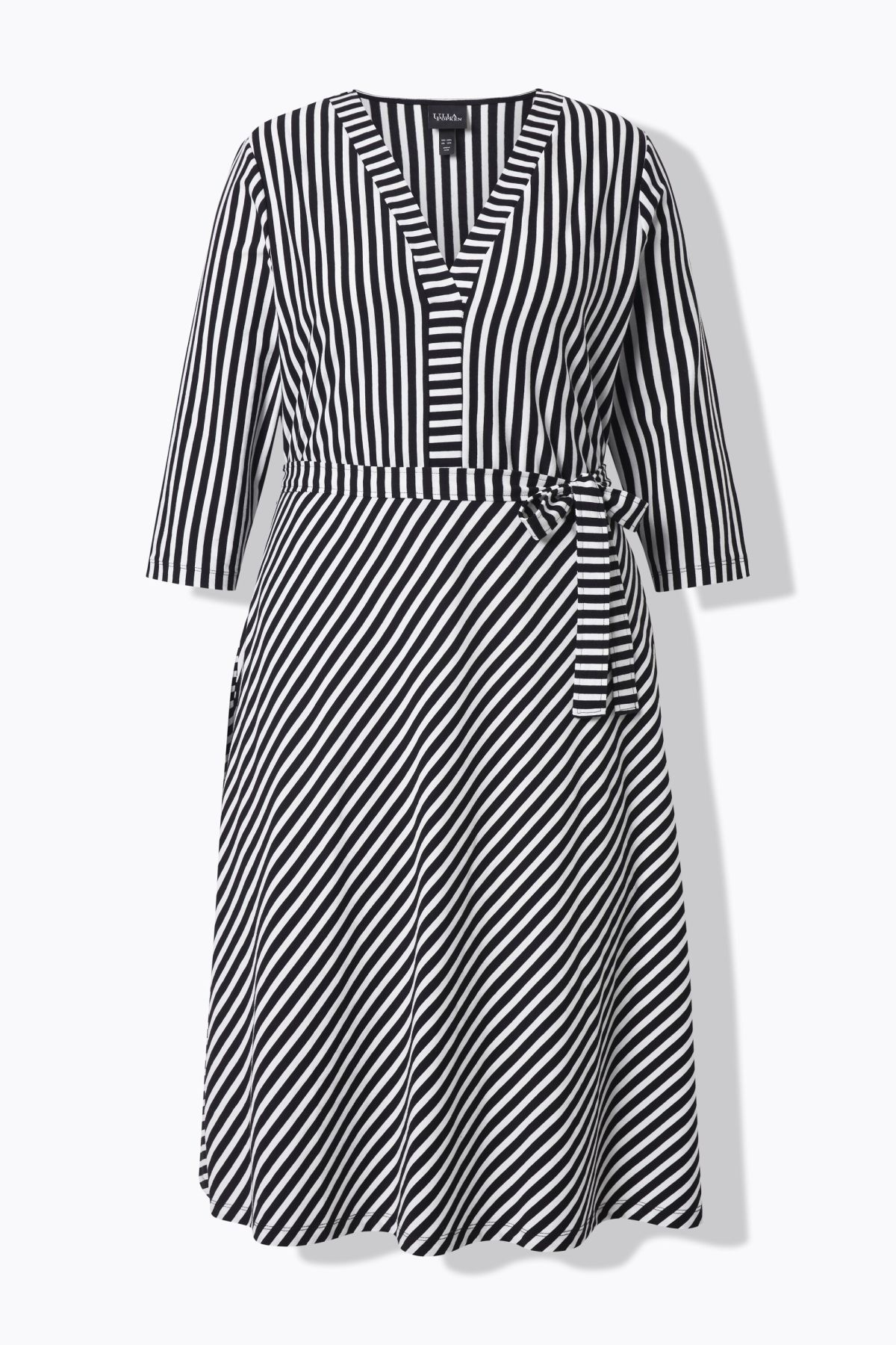 Jersey agréablement extensible, motif à rayures, Décolleté en V avec large bordure, Coupe évasée, base ample et confortable, ceinture à nouer sur le côté, Poches latérales réservées dans la couture, Coton naturel enrichi en élasthanne, Long. env. 114