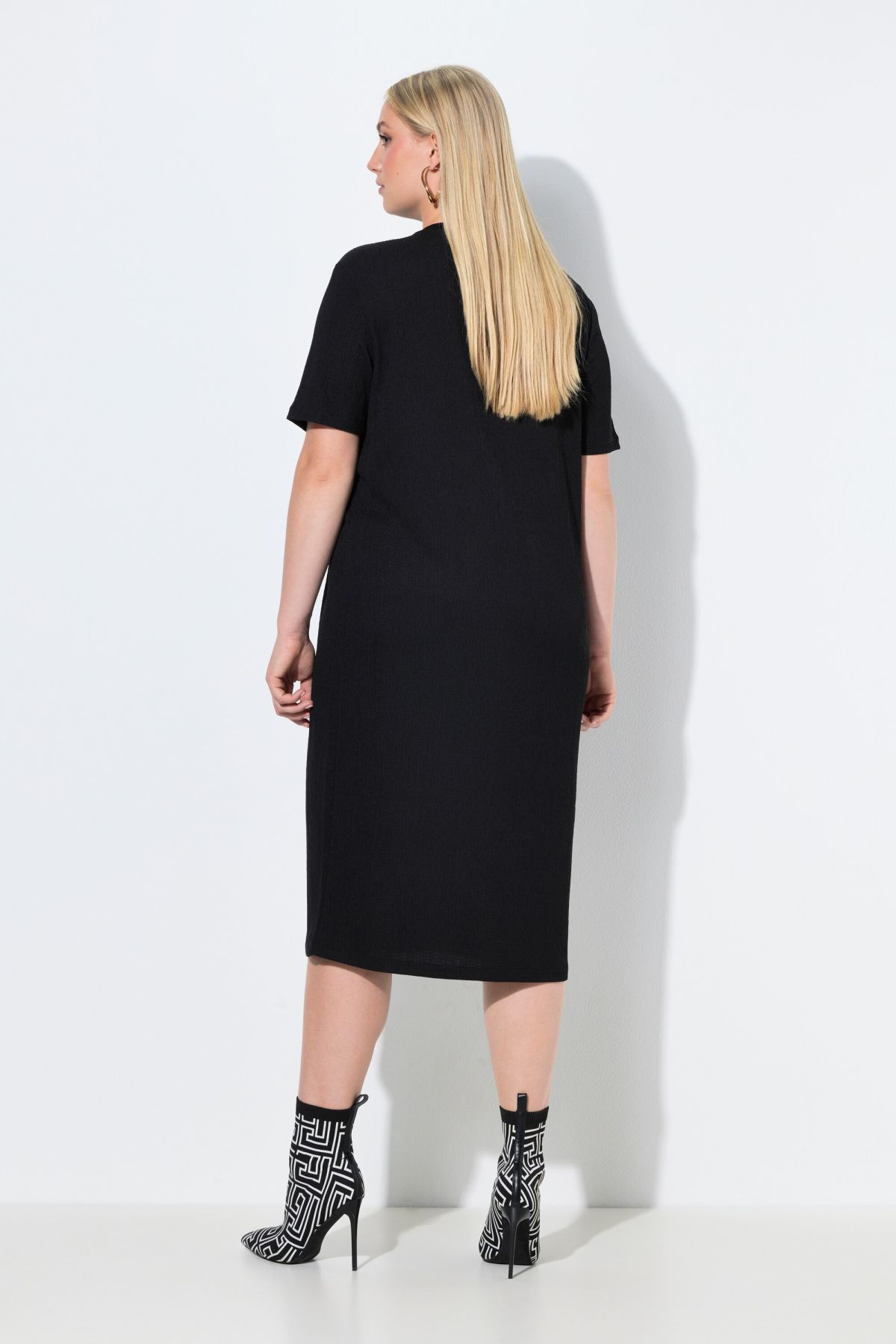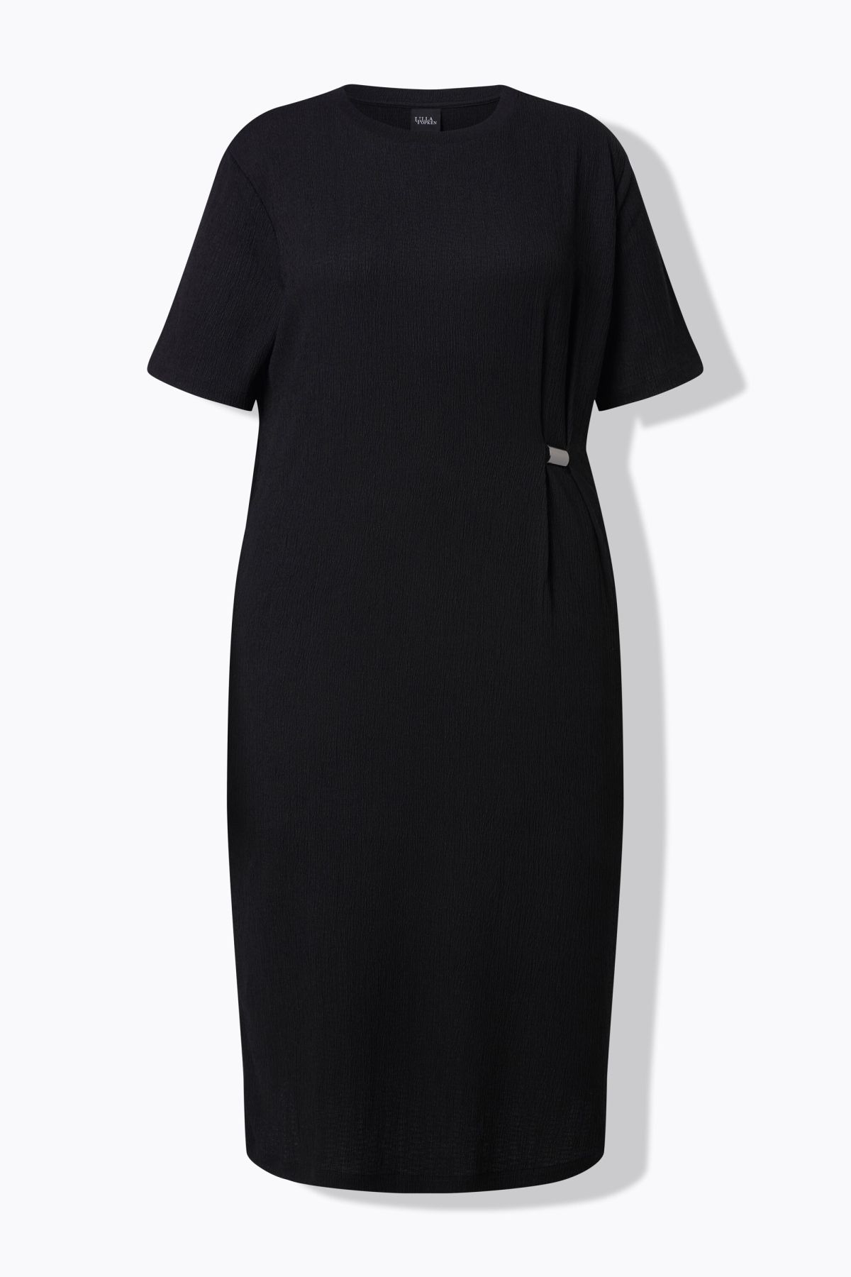 Tissu élégamment texturé, Décolleté rond, Drapé avec petit accessoire métallique, Modèle oversize décontracté, Manches courtes, Long. env. 117 cm.