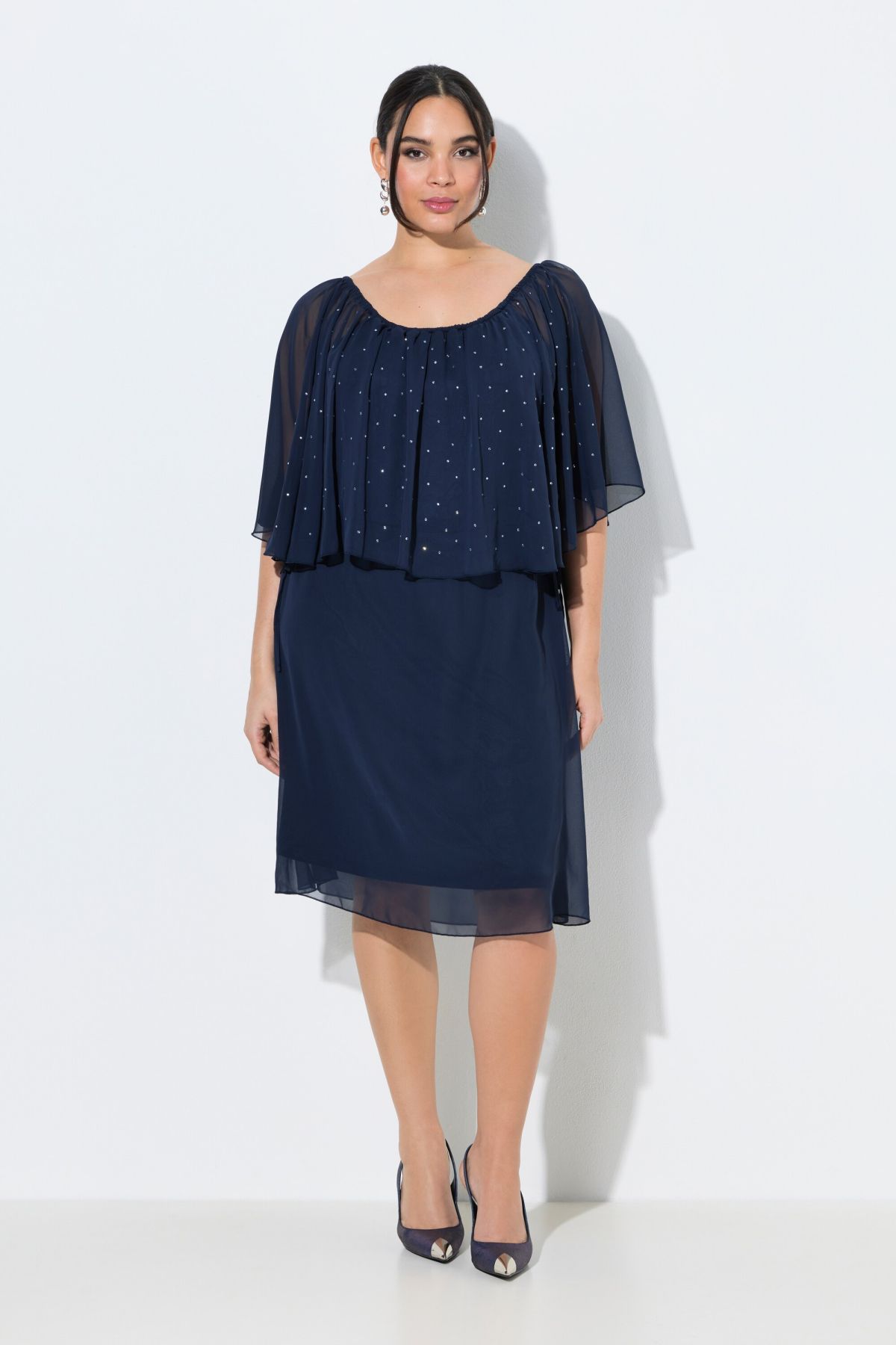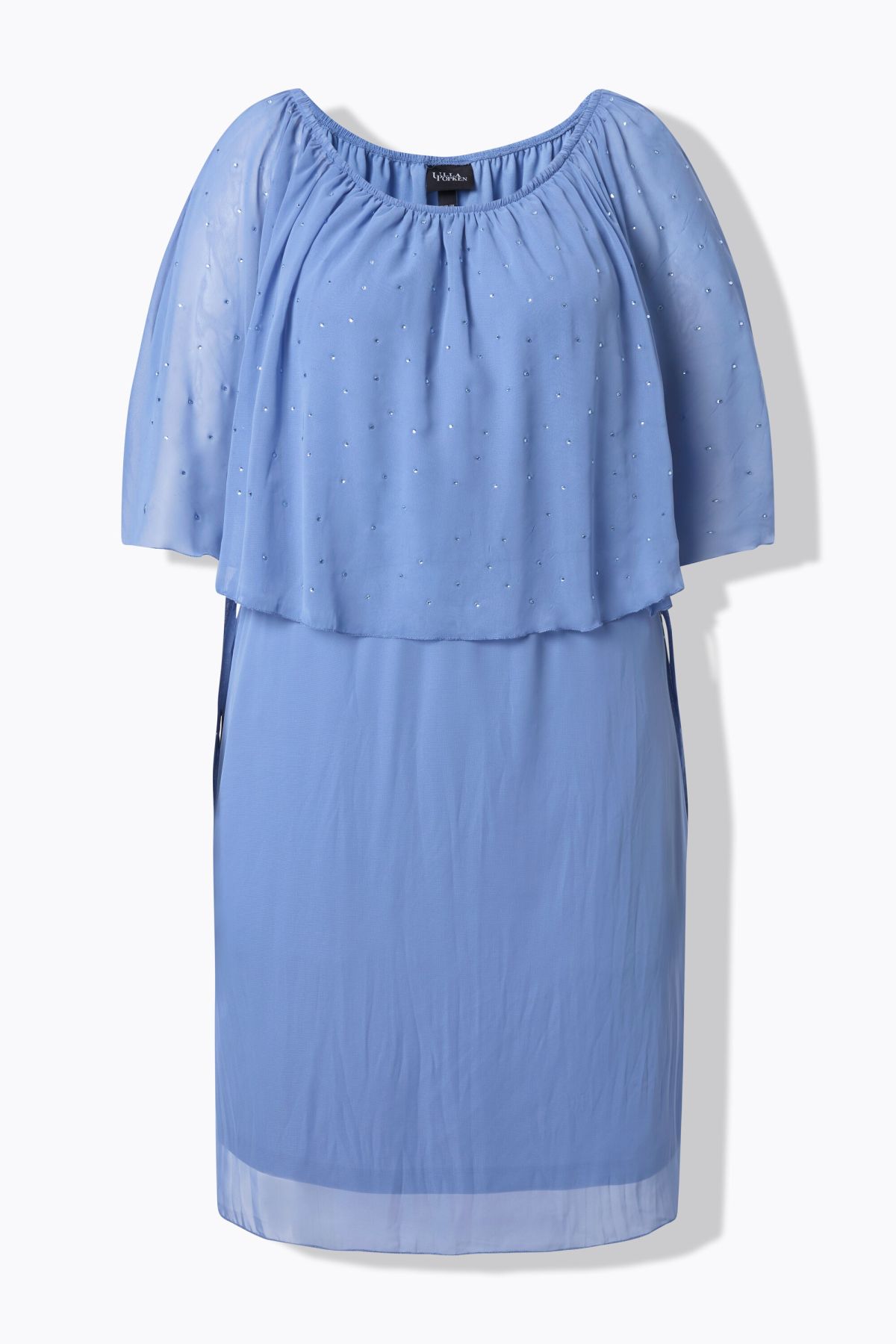 Large voile en mousseline sur la partie haute, avec petites pierres fantaisie, Décolleté Carmen élastique, Peut également se porter épaules dénudées, Cordon sous tunnel à la taille, pouvant se régler sur le côté, Coupe évasée, base ample et confortable, L