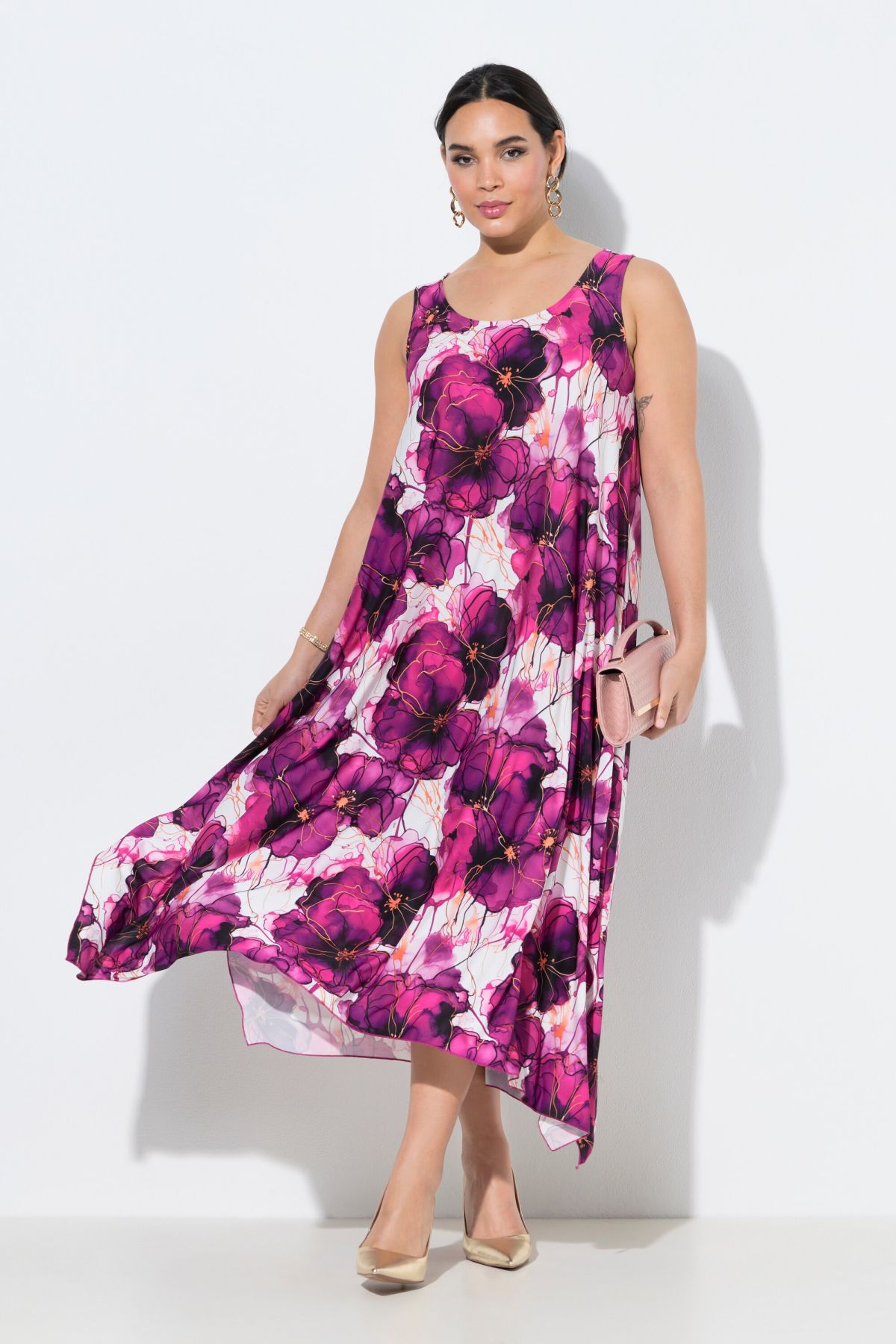 Imprimé grandes fleurs colorées, Décolleté rond, Jupe tulipe se terminant en pointe sur les côtés, Modèle sans manches, Jersey agréablement élastique, Long. env. 120 cm.
