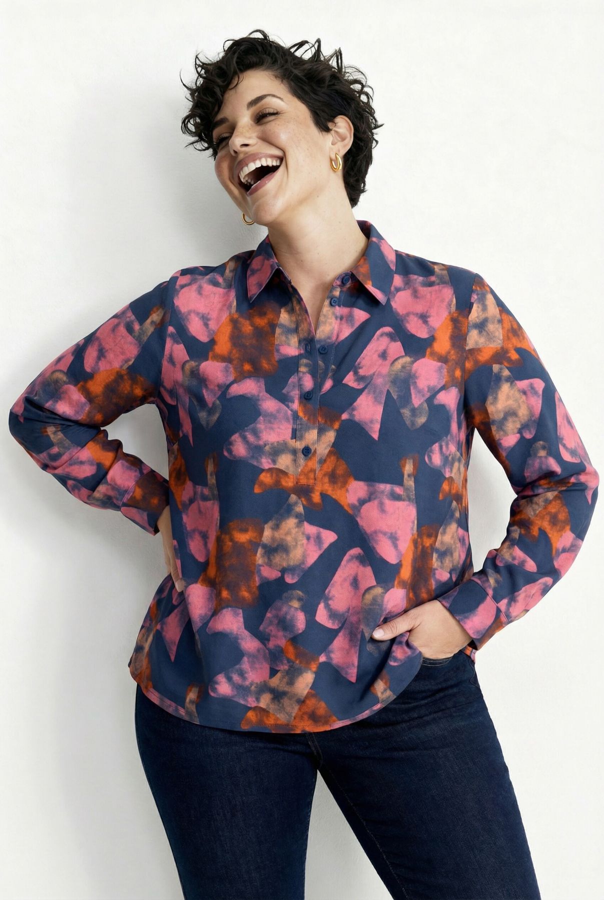 Tunique col montant et manches longues, imprimé graphique, coupe évasée