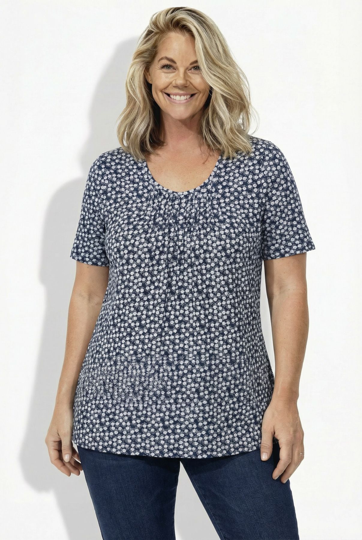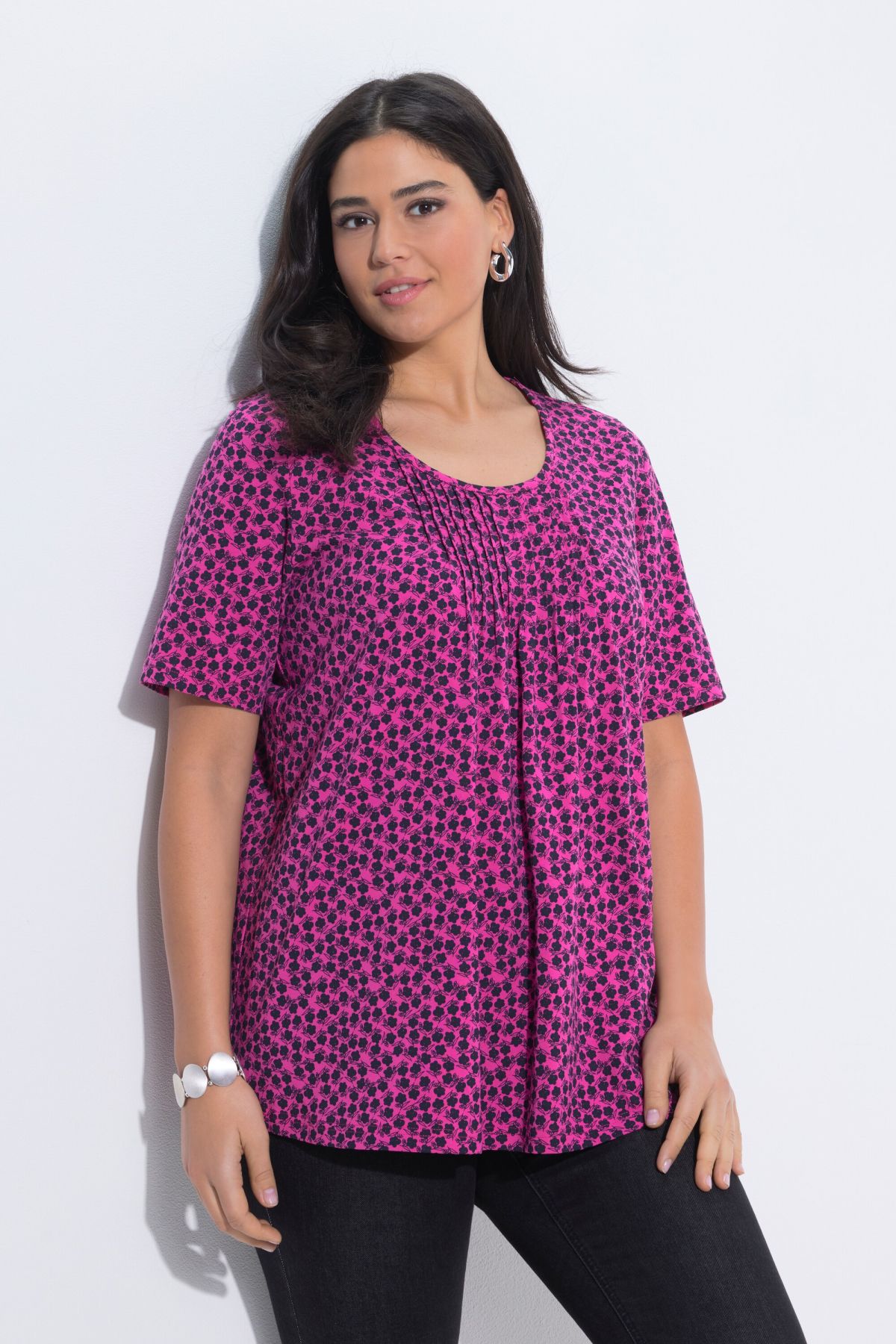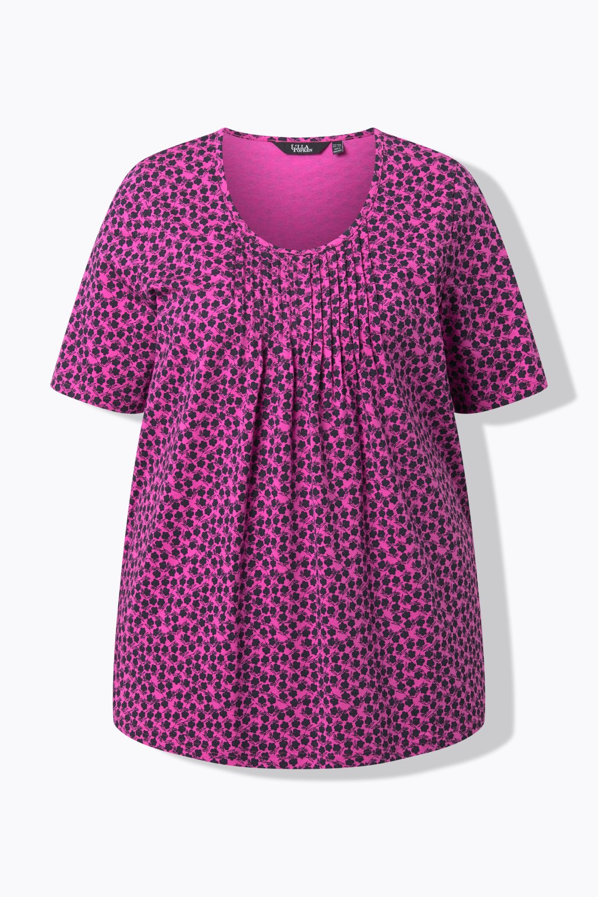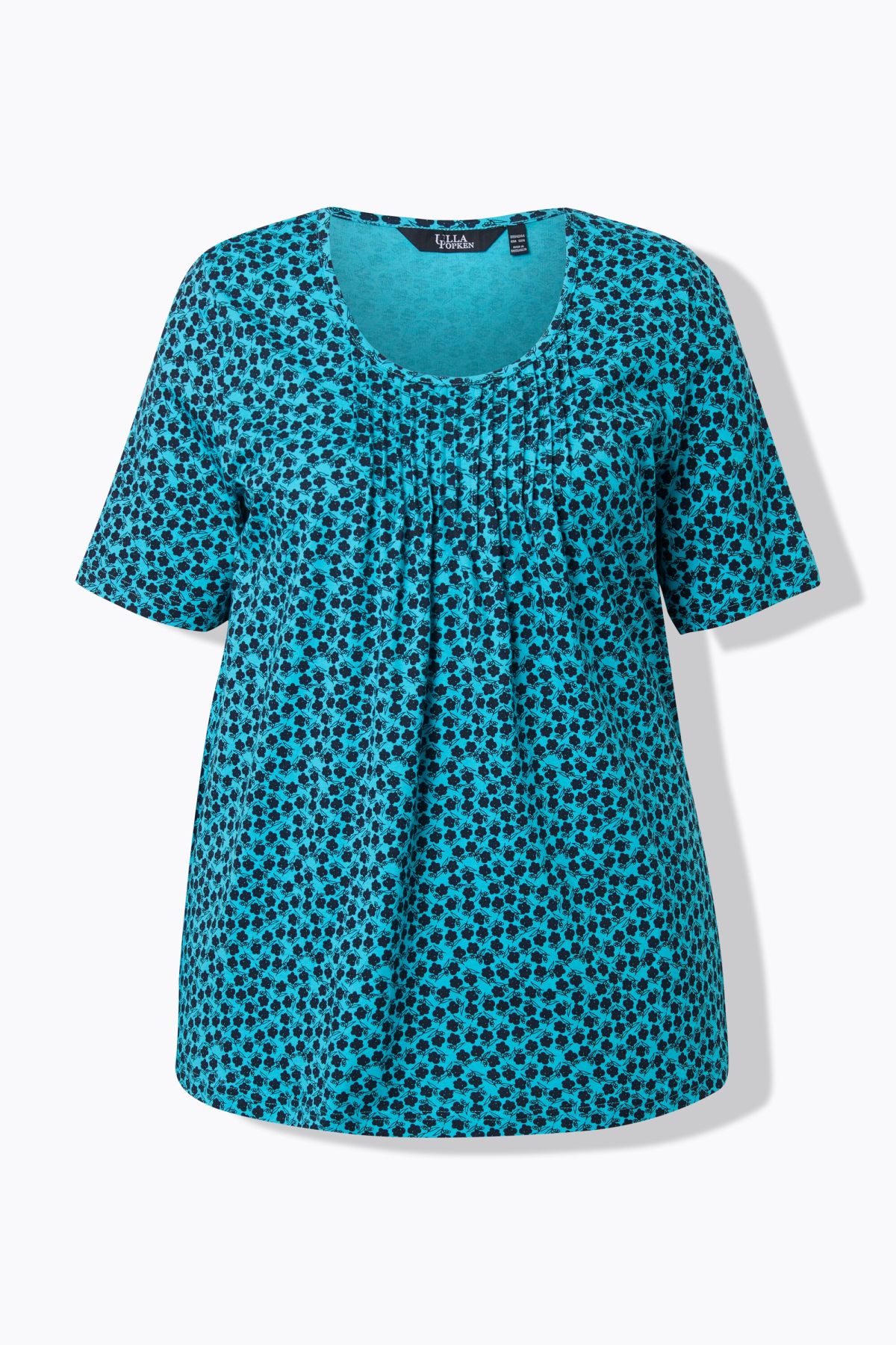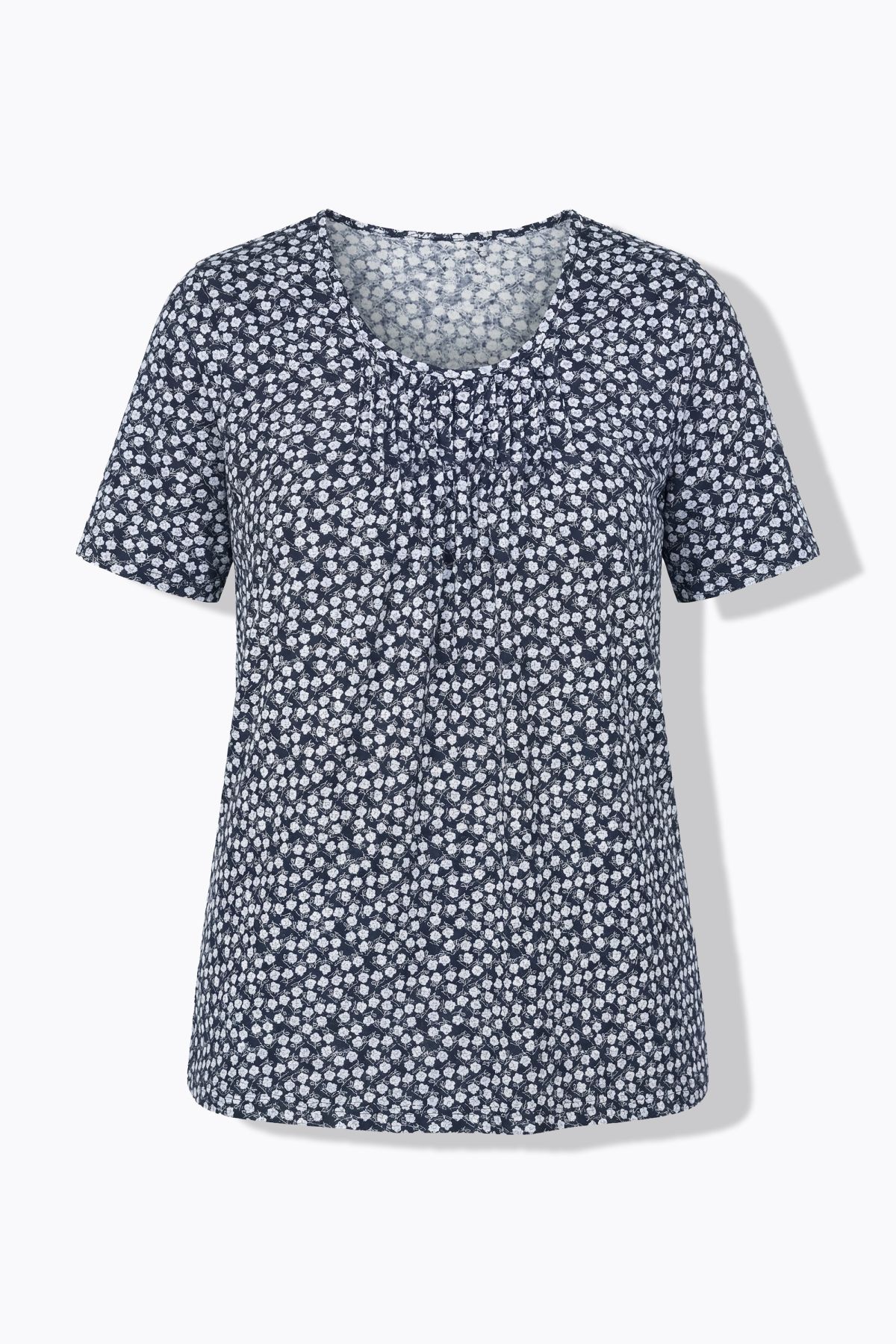 Jersey doux et confortable, petit motif, Col rond avec jolis plis fantaisie, Coupe évasée, base ample et confortable, Manches courtes, Pur coton, Long. selon taille env. 72-76 cm.