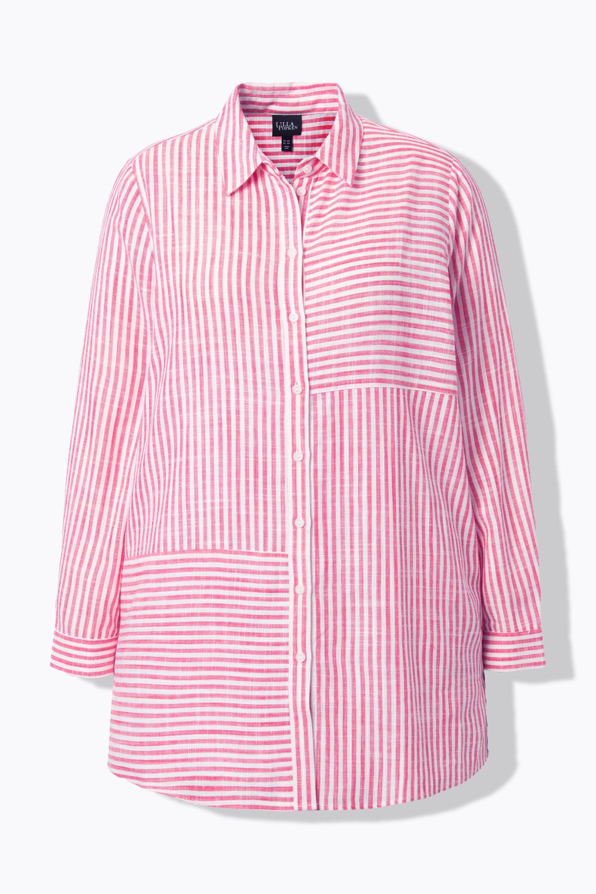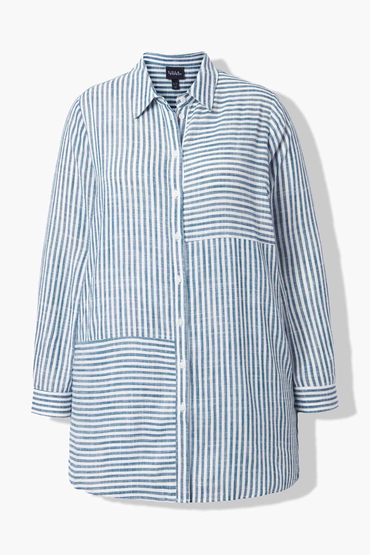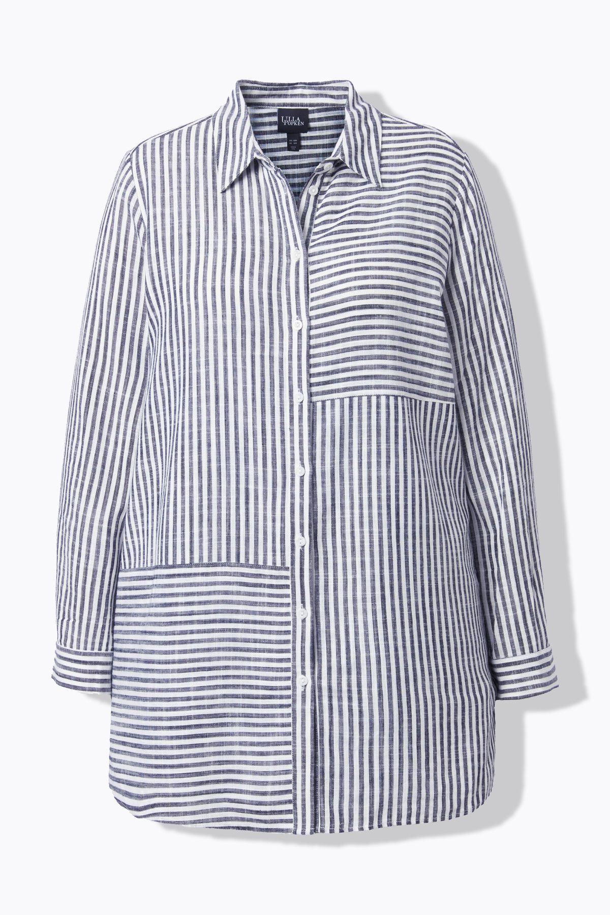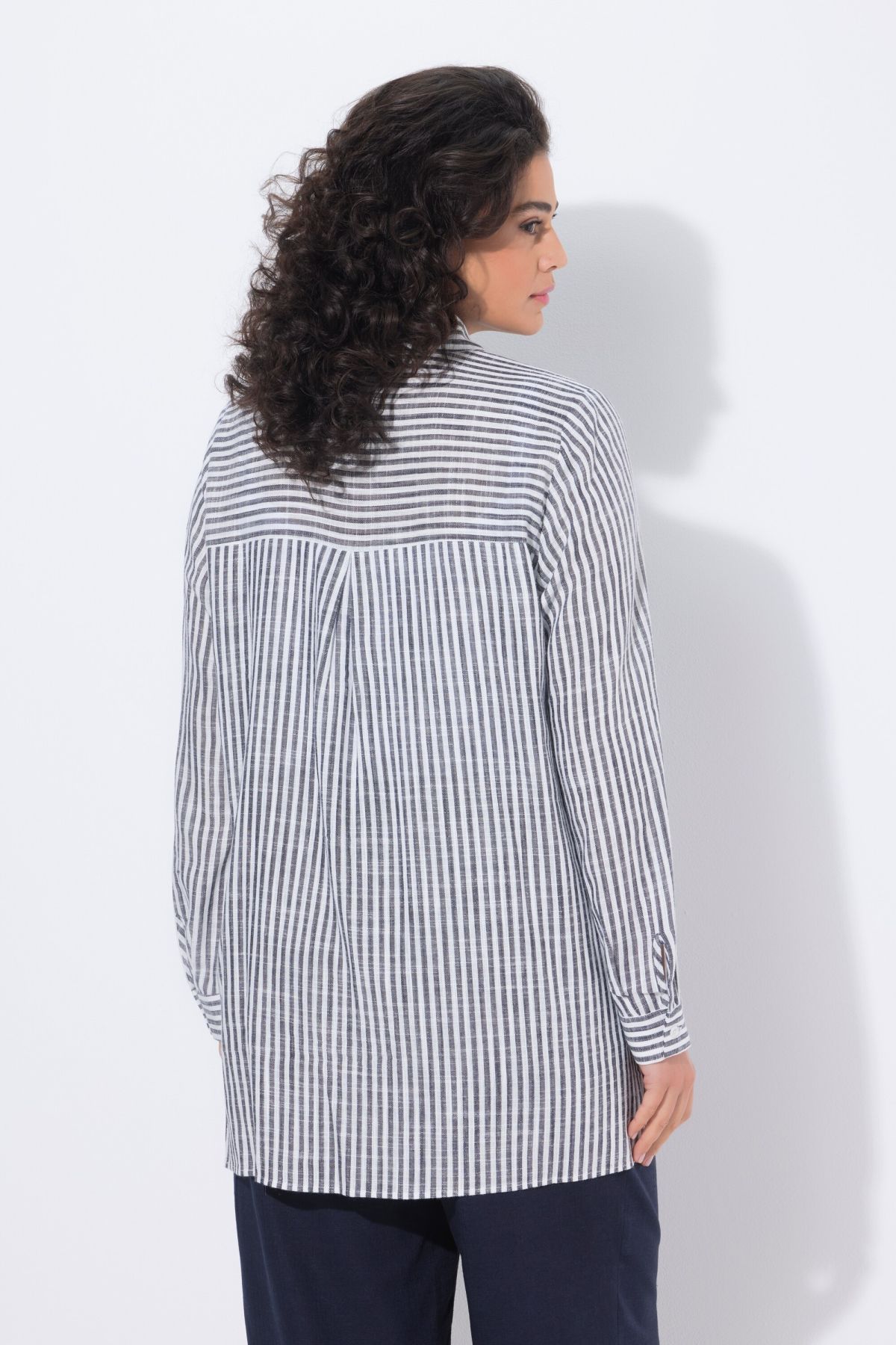 Jeu de rayures tendance, Modèle classique avec col chemise et patte de boutonnage, Base arrondie avec fente sur les côtés, Manches longues avec poignets, Mélange lin-viscose de grande qualité, Long. selon taille env. 80-84 cm.