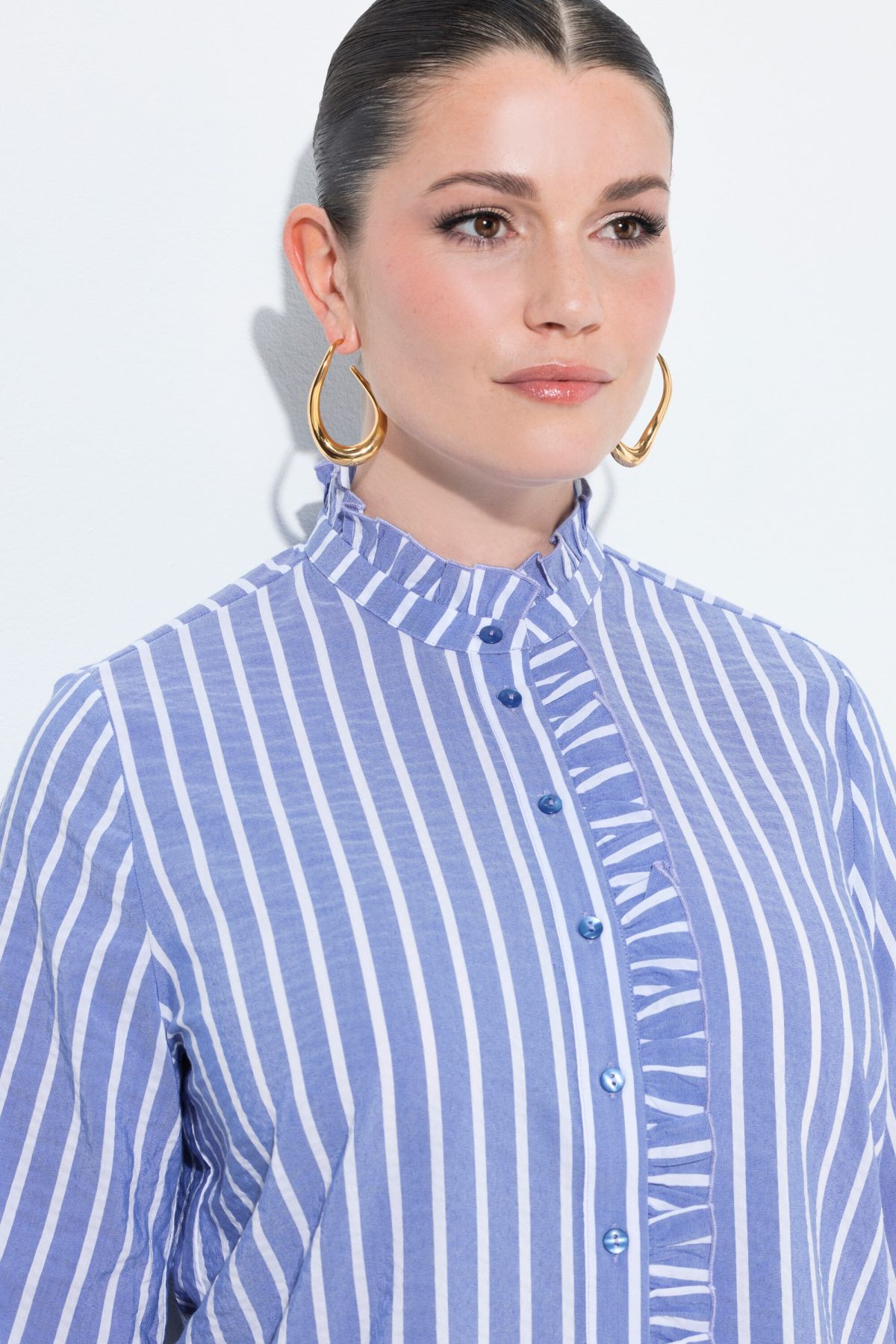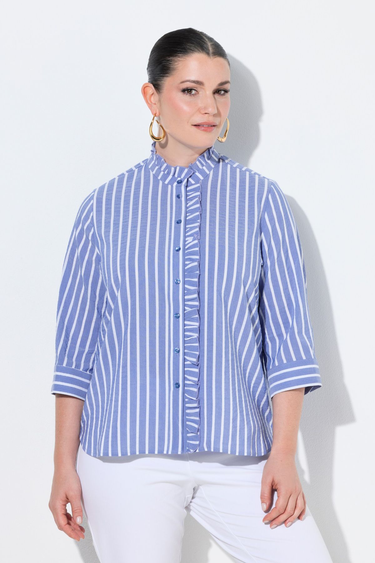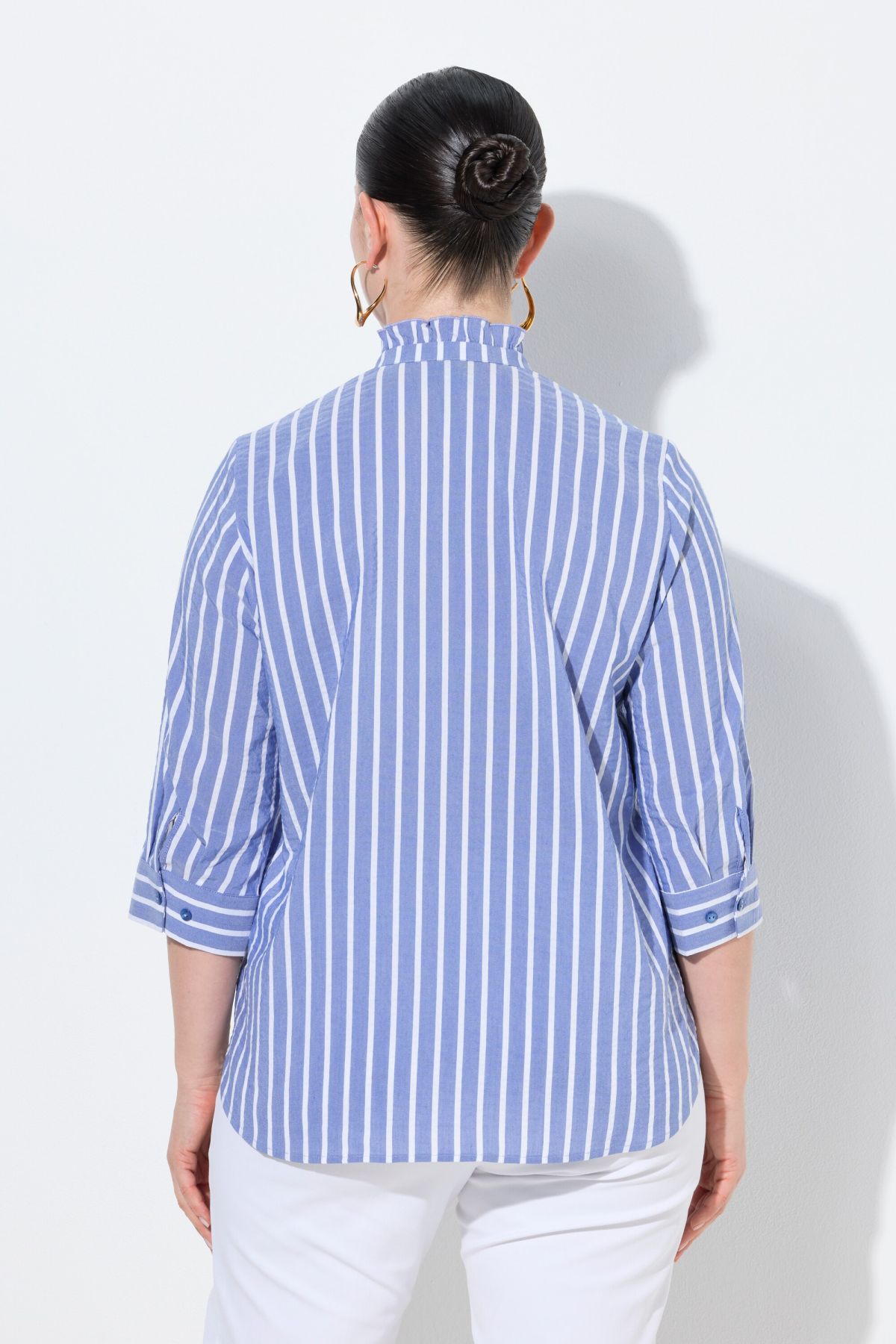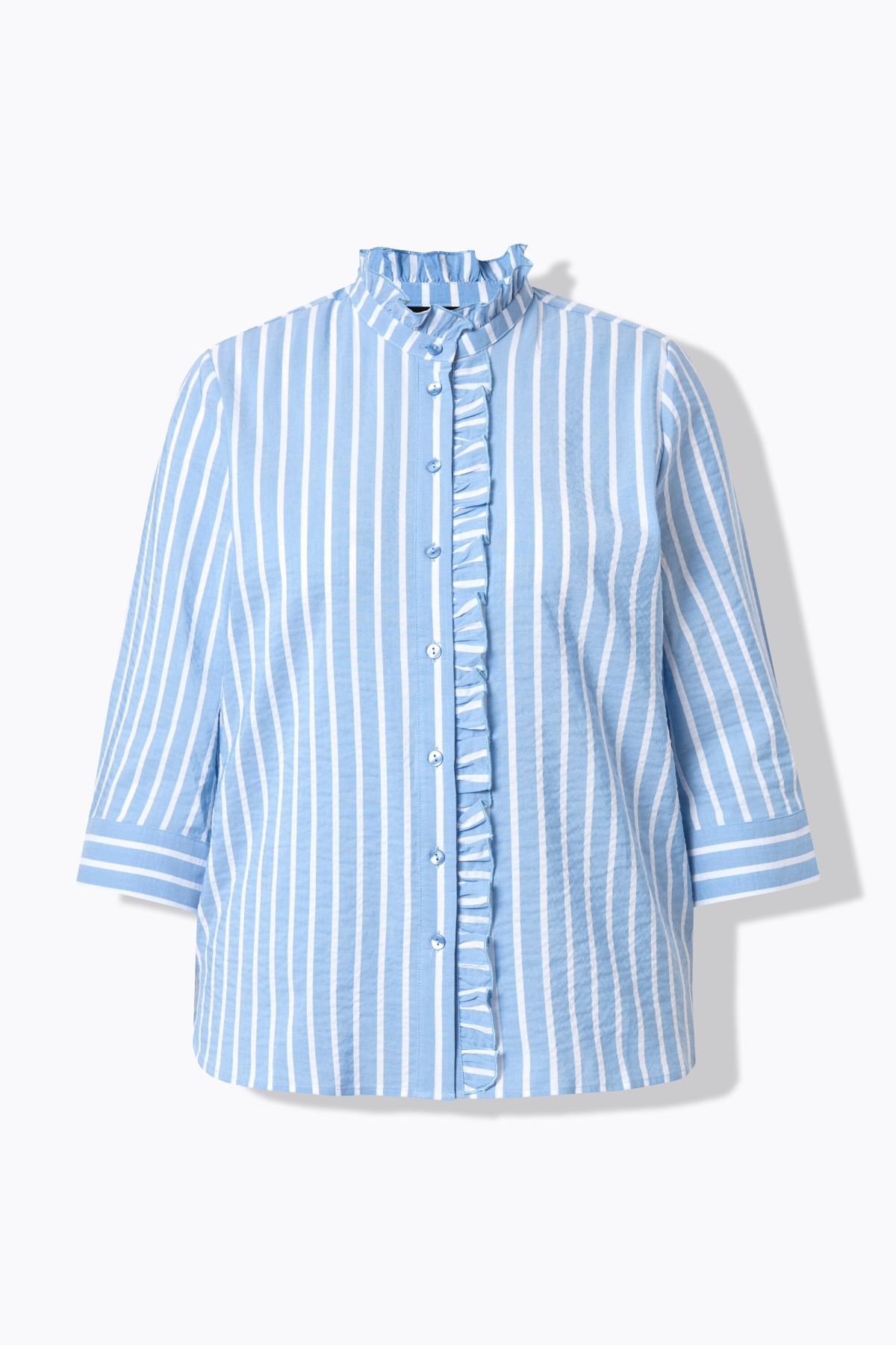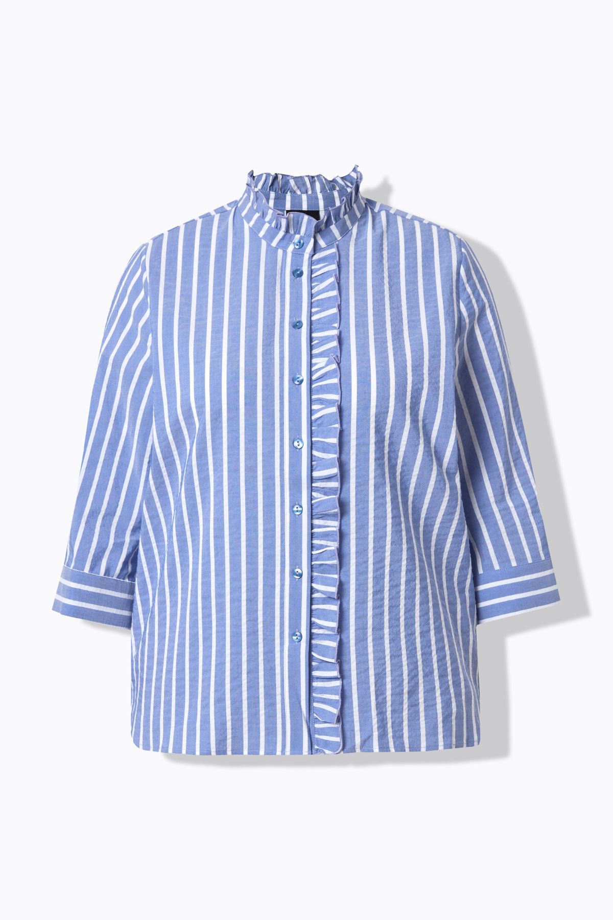 Tissu Seersucker texturé et extensible, Col montant et patte de boutonnage avec ruchés, Coupe évasée confortable, avec fentes sur les côtés, Base légèrement arrondie, Manches 3/4 avec poignets, Long. selon taille env. 72-76 cm.