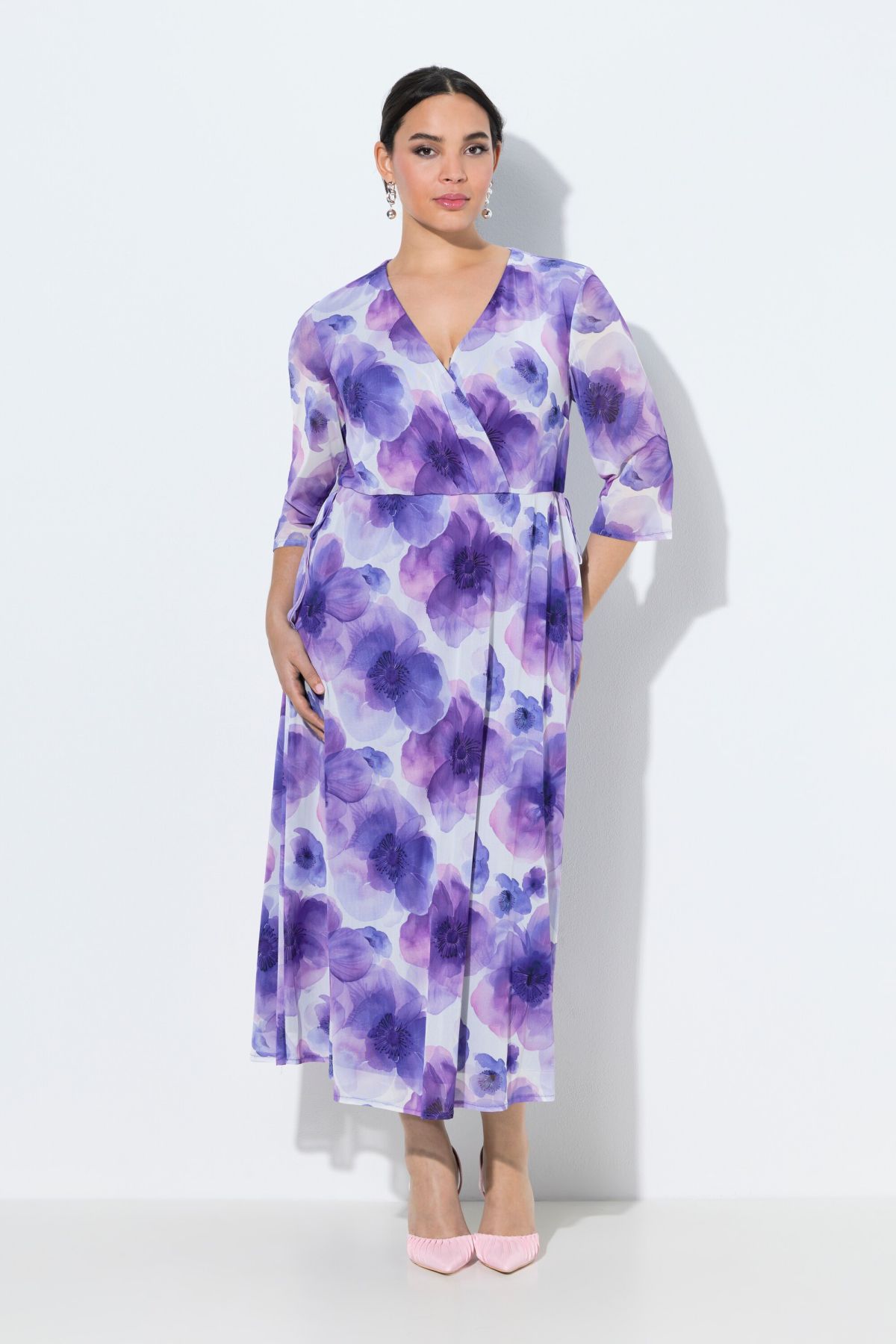Voile en tulle très léger, motif grandes fleurs, Décolleté en V, effet cache-cœur, Petit cordon de serrage de chaque côté de la taille, Manches courtes et amples, Fond de robe en jersey opaque, Long. env. 125 cm.