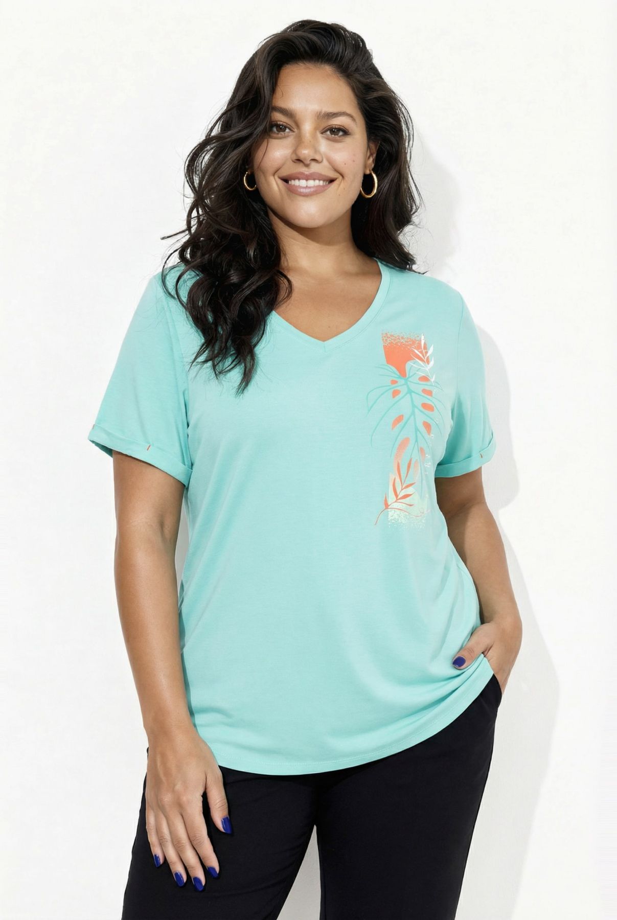 Imprimé fantaisie sur le devant, Traitement antibactérien - évite les odeurs indésirables, Modèle oversize décontracté, Manches courtes, bords roulottés cousus, Base arrondie avec fentes sur les côtés, Long. selon taille env. 72-76 cm.