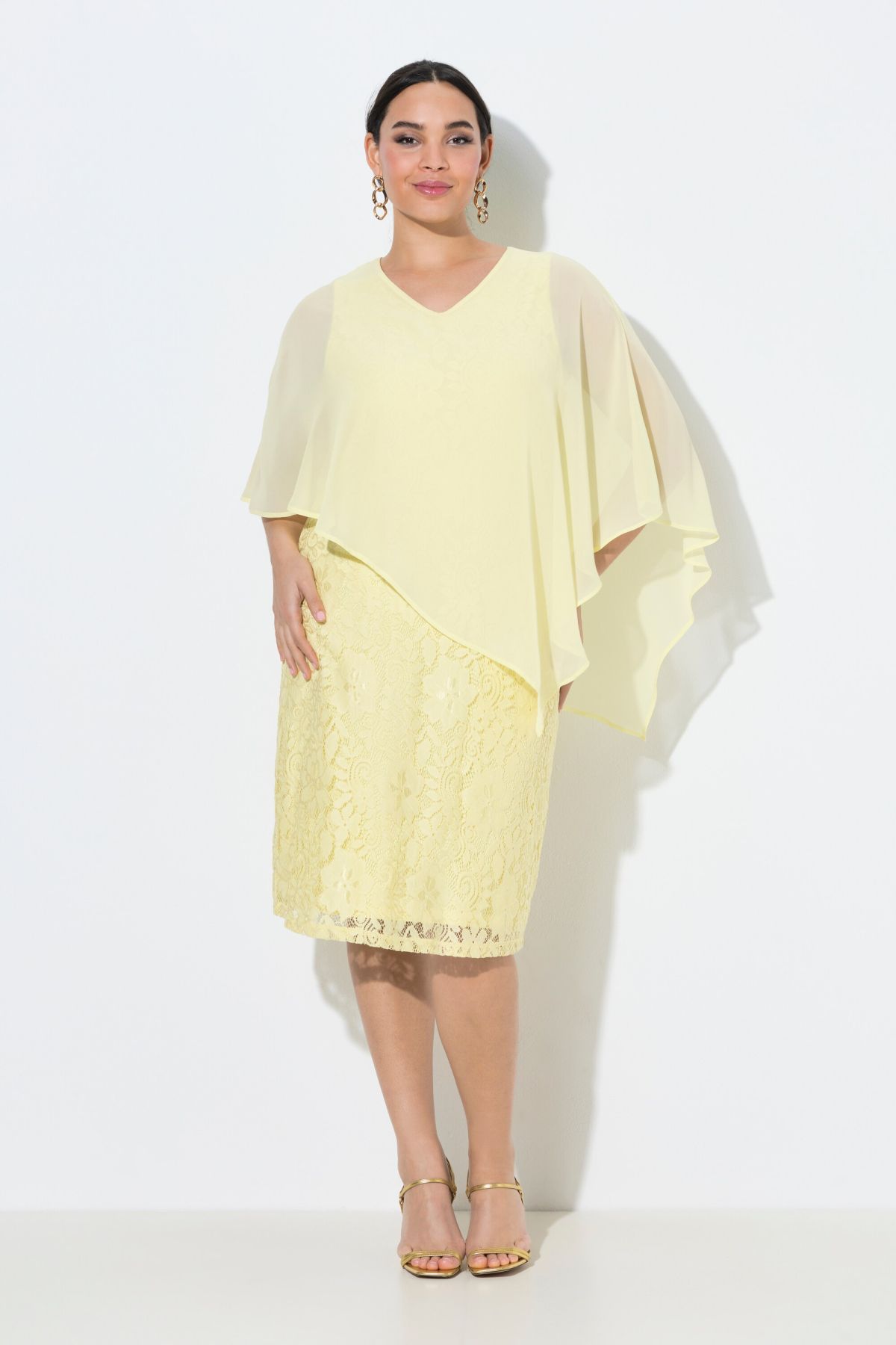 Voile en mousseline ample et asymétrique, dentelle raffinée, Décolleté en V, Coupe évasée courte, Fausses manches 3/4, Doublure opaque, Long. env. 105-109 cm.