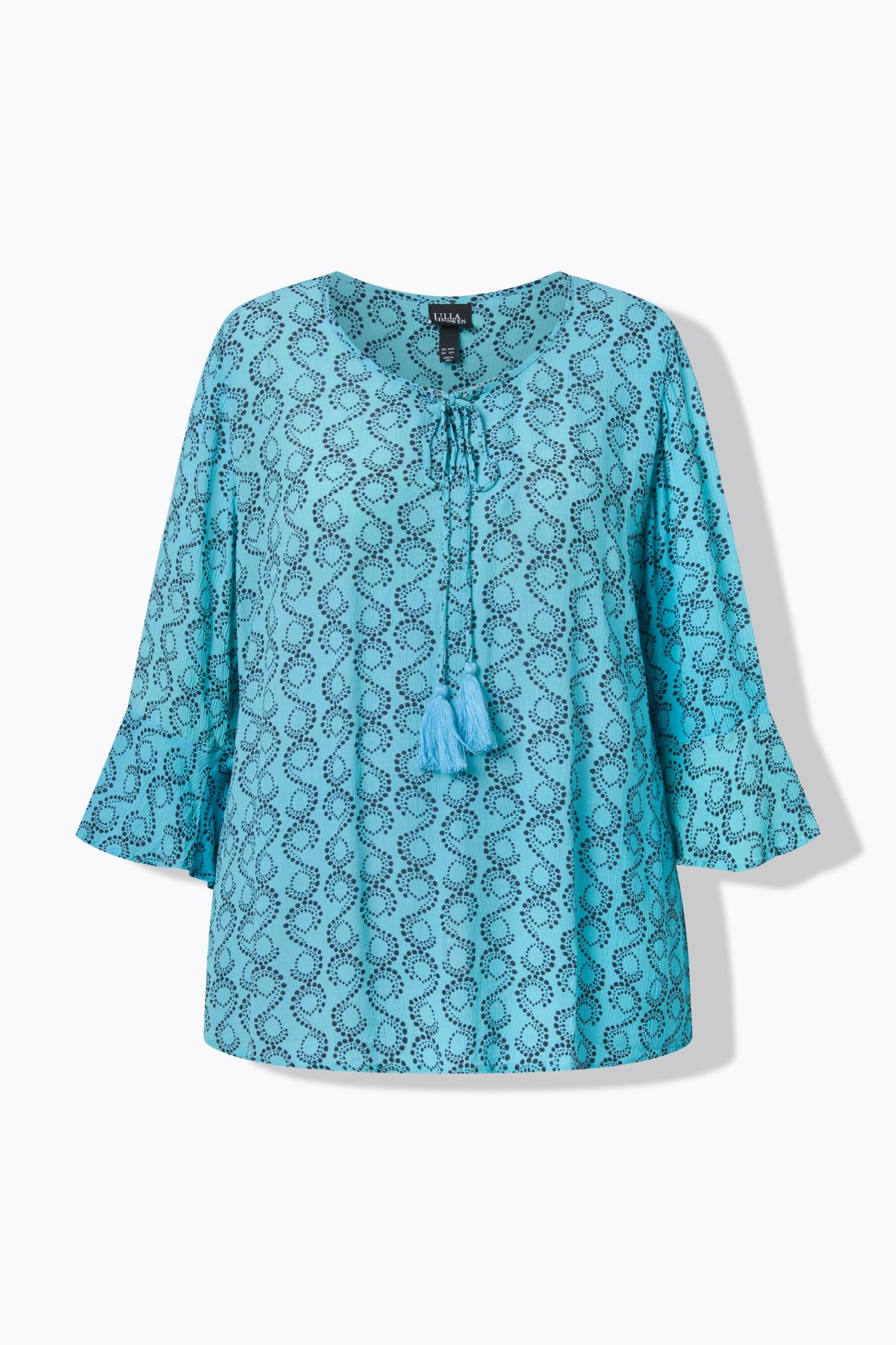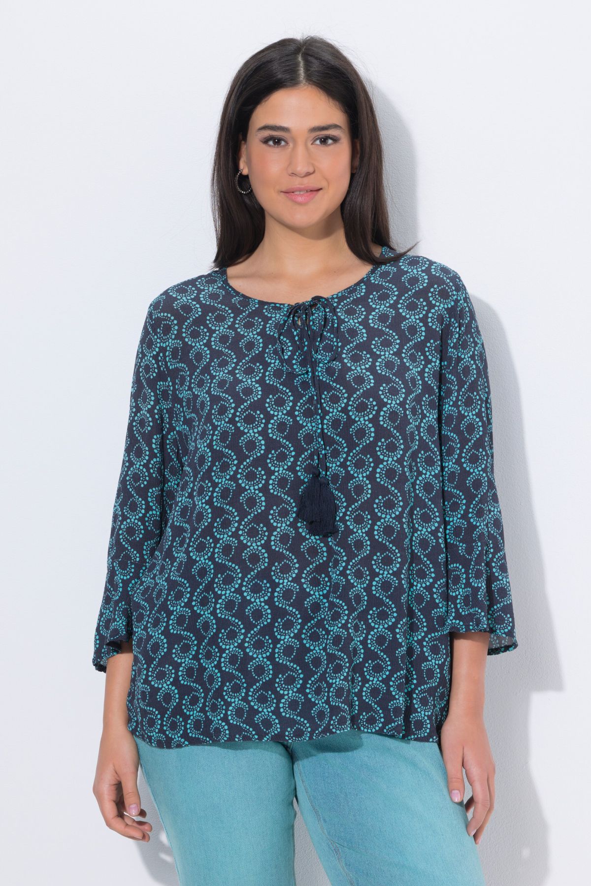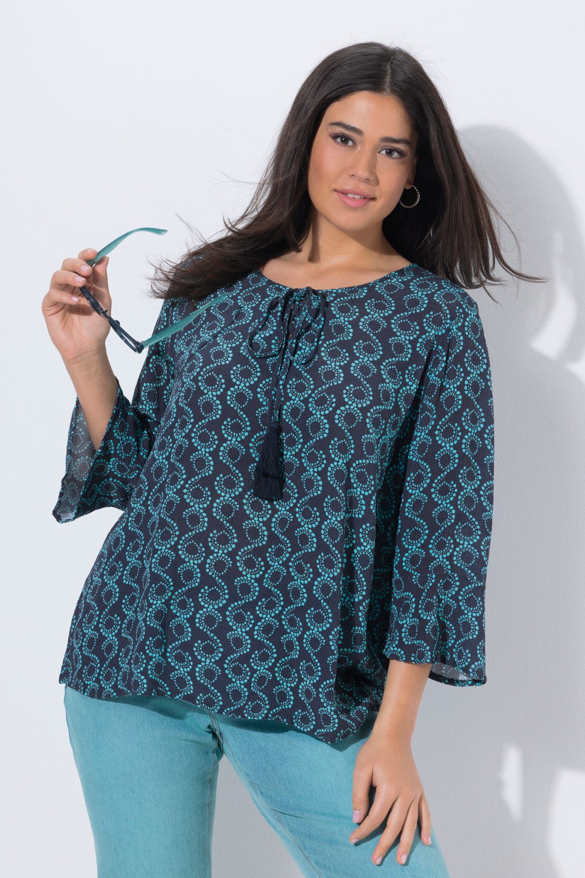 Tissu crêpe doux et confortable, imprimé tendance, Col tunisien avec cordon de serrage à pompons, Coupe évasée confortable, large volant à la base, Manches 3/4 à volant, Viscose douce et confortable, au tombé fluide, Long. selon taille env. 68-76&nbs
