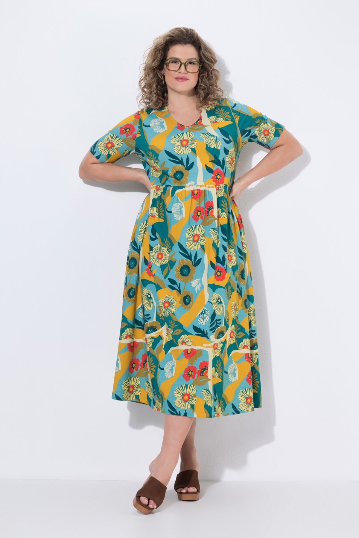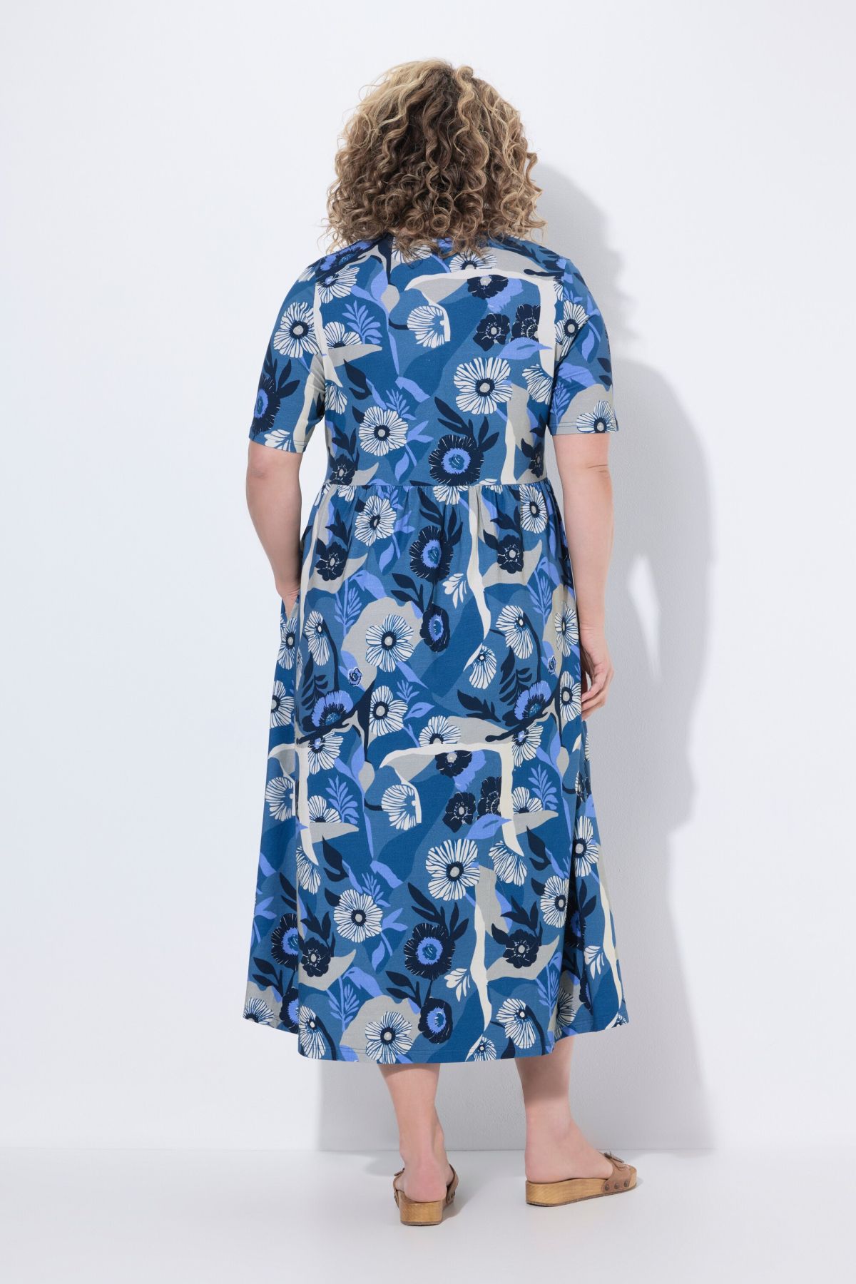 Jersey doux et confortable, imprimé floral, Décolleté rond, Haut près du corps et jupe évasée, Poches latérales réservées dans la couture, Coton bio durable, Long. env. 126 cm.