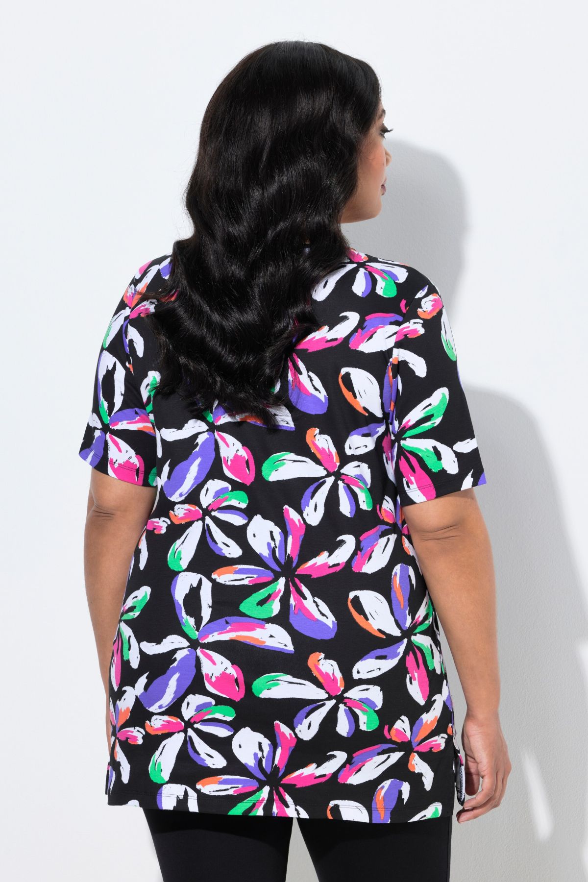 Charmant motif floral, Col tunisien, Coupe droite confortable (plus longue que la normale), avec fentes sur les côtés, Manches courtes, Pur coton, Long. selon taille env. 81-85 cm.