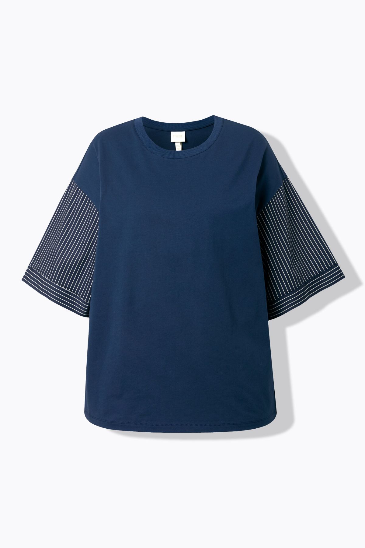 Jeu de matières - jersey et tissu à rayures, Décolleté rond, Modèle oversize décontracté, Manches 3/4 droites, Coton bio durable, Long. selon taille env. 68-72 cm.