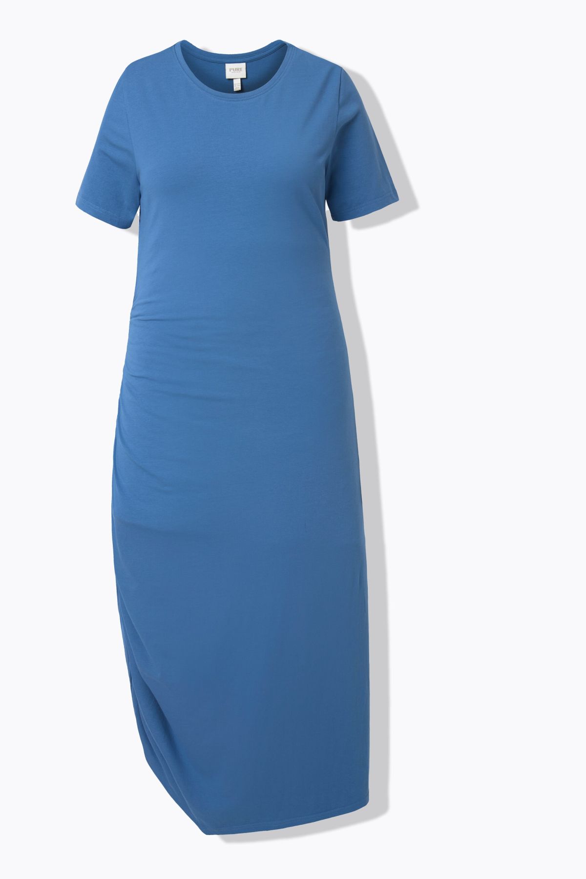 Jersey agréablement élastique, Décolleté rond, Drapé féminin sur le côté droit de la jupe, Base asymétrique, Coton bio durable, avec teneur en élasthanne, Long. env. 130 cm.