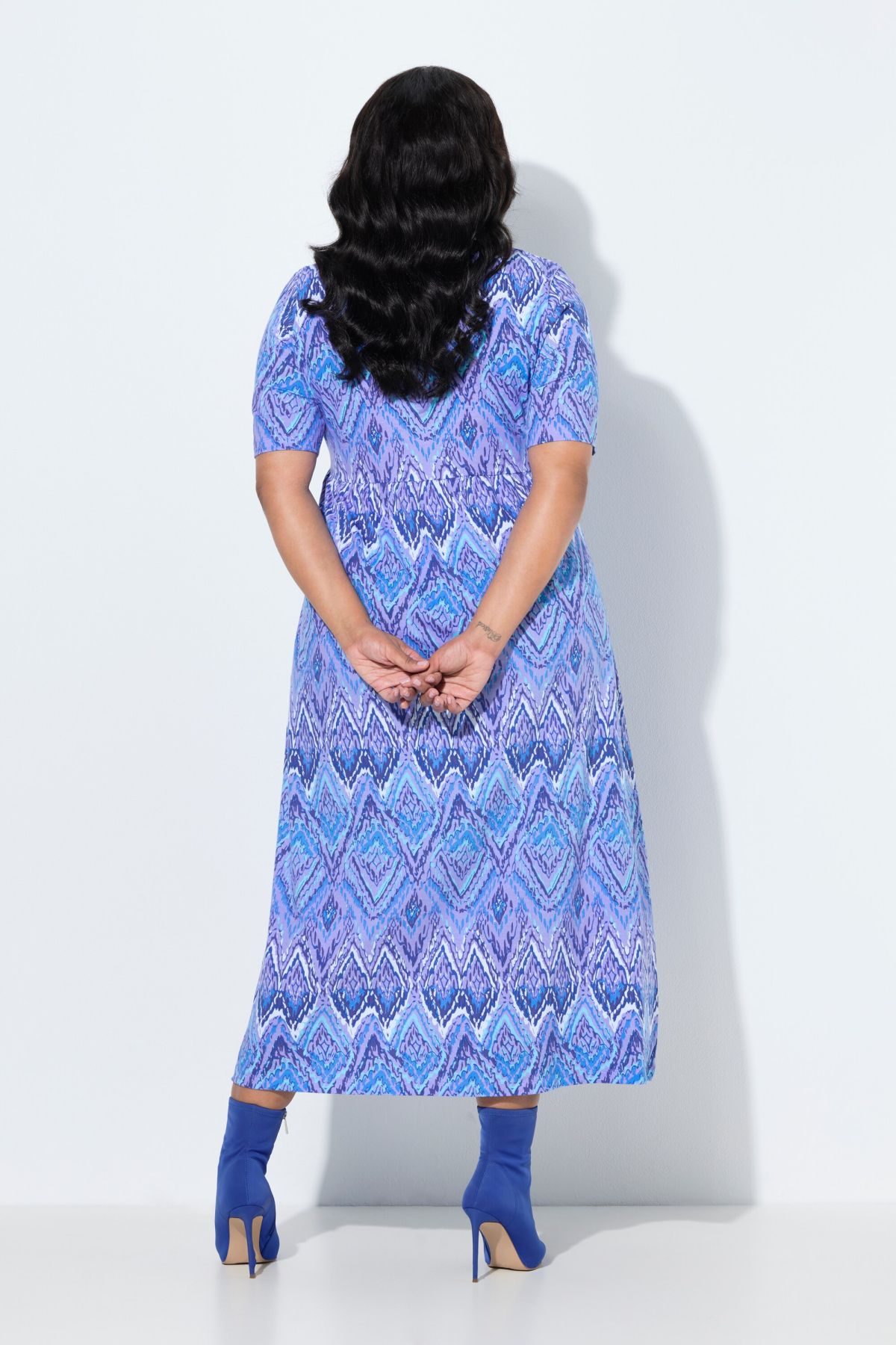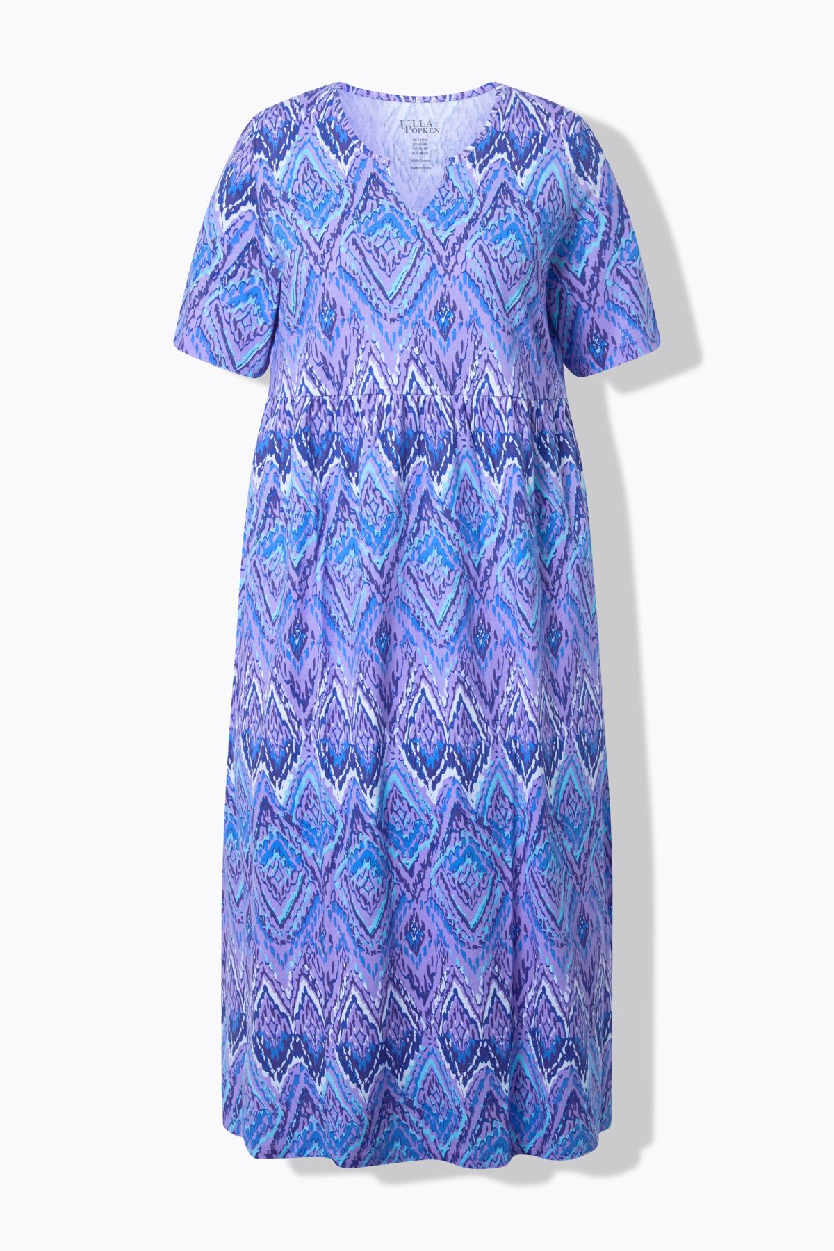 Jersey doux et confortable, imprimé tendance, Col tunisien très féminin, Coupe évasée confortable, couture empire élastique, Poches latérales réservées dans la couture, Pur coton, Long. env. 127 cm.