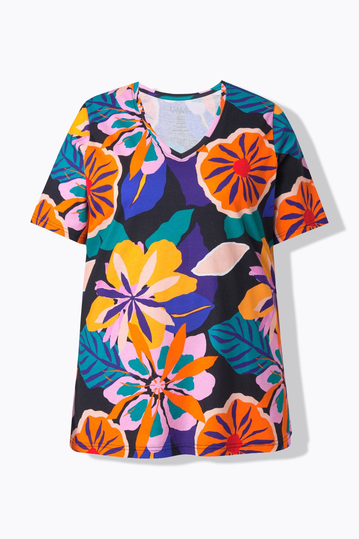 Charmant motif floral, Décolleté en V, Coupe confortable, Manches courtes, Pur coton, Long. selon taille env. 71-75 cm.