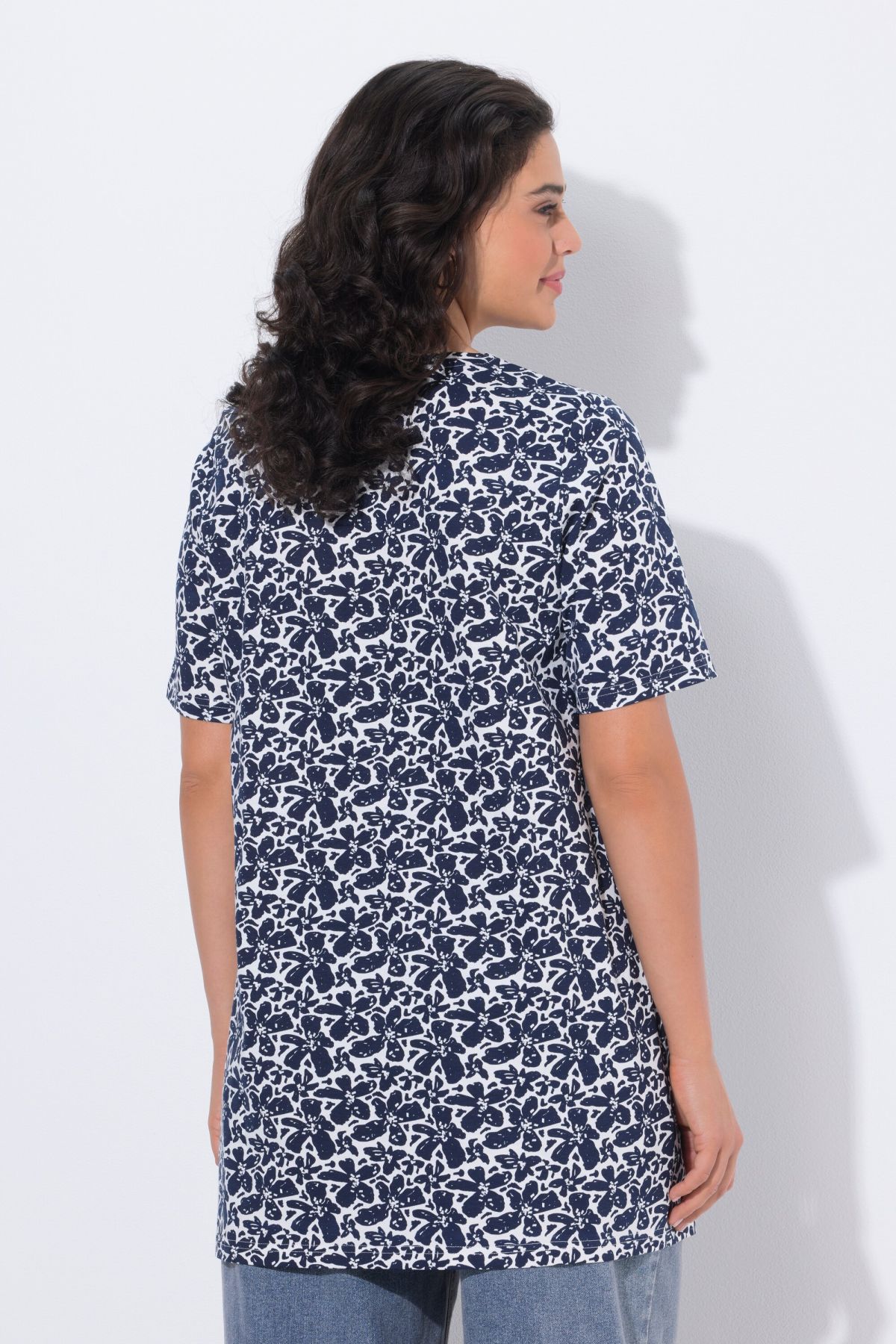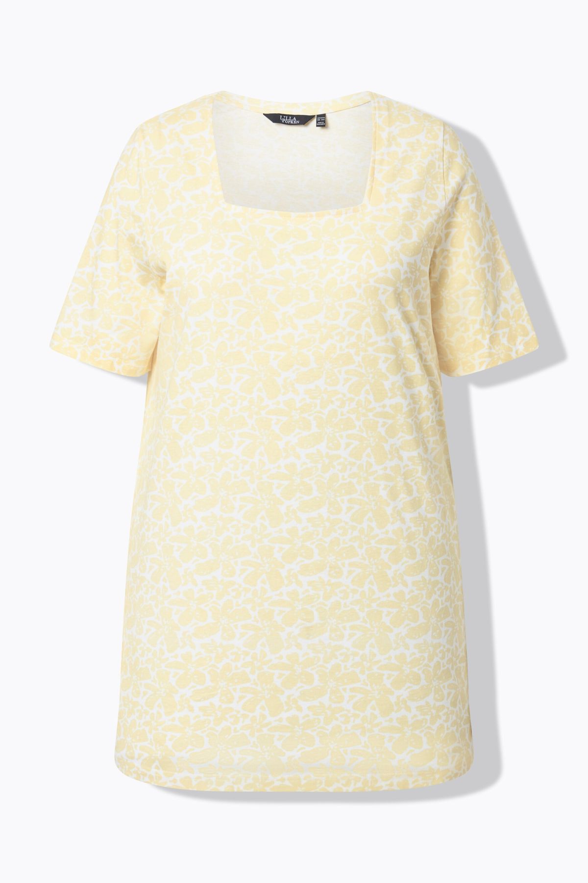 Coupe légèrement plus longue que la normale, Décolleté carré, Coupe évasée, base ample et confortable, Manches courtes, Pur coton, Long. selon taille env. 82-86 cm.