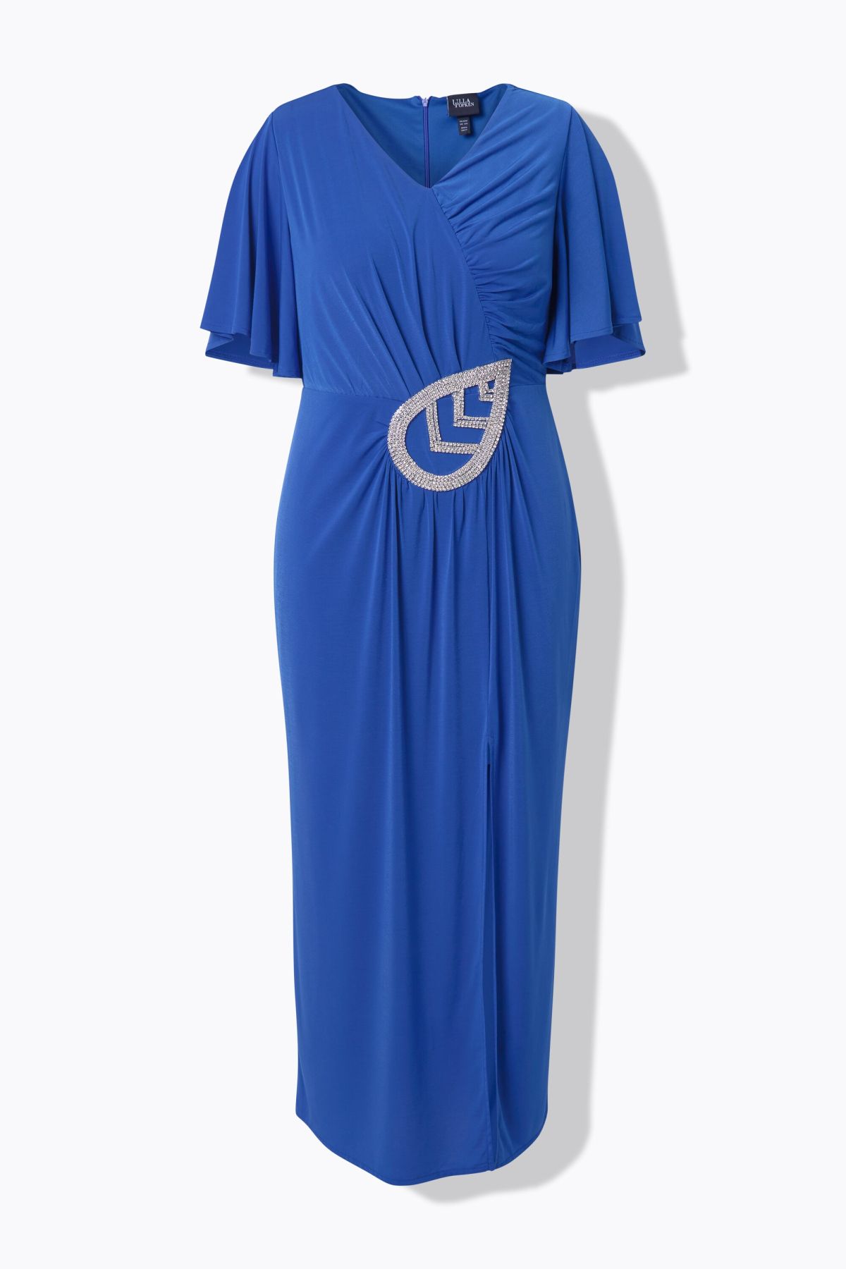 Drapé féminin, Décolleté en V, effet cache-cœur, Coupe évasée, base ample et confortable, Superbe application en petits pierres scintillantes sur le côté (au niveau de la taille), Manches courtes, Long. env. 140 cm.