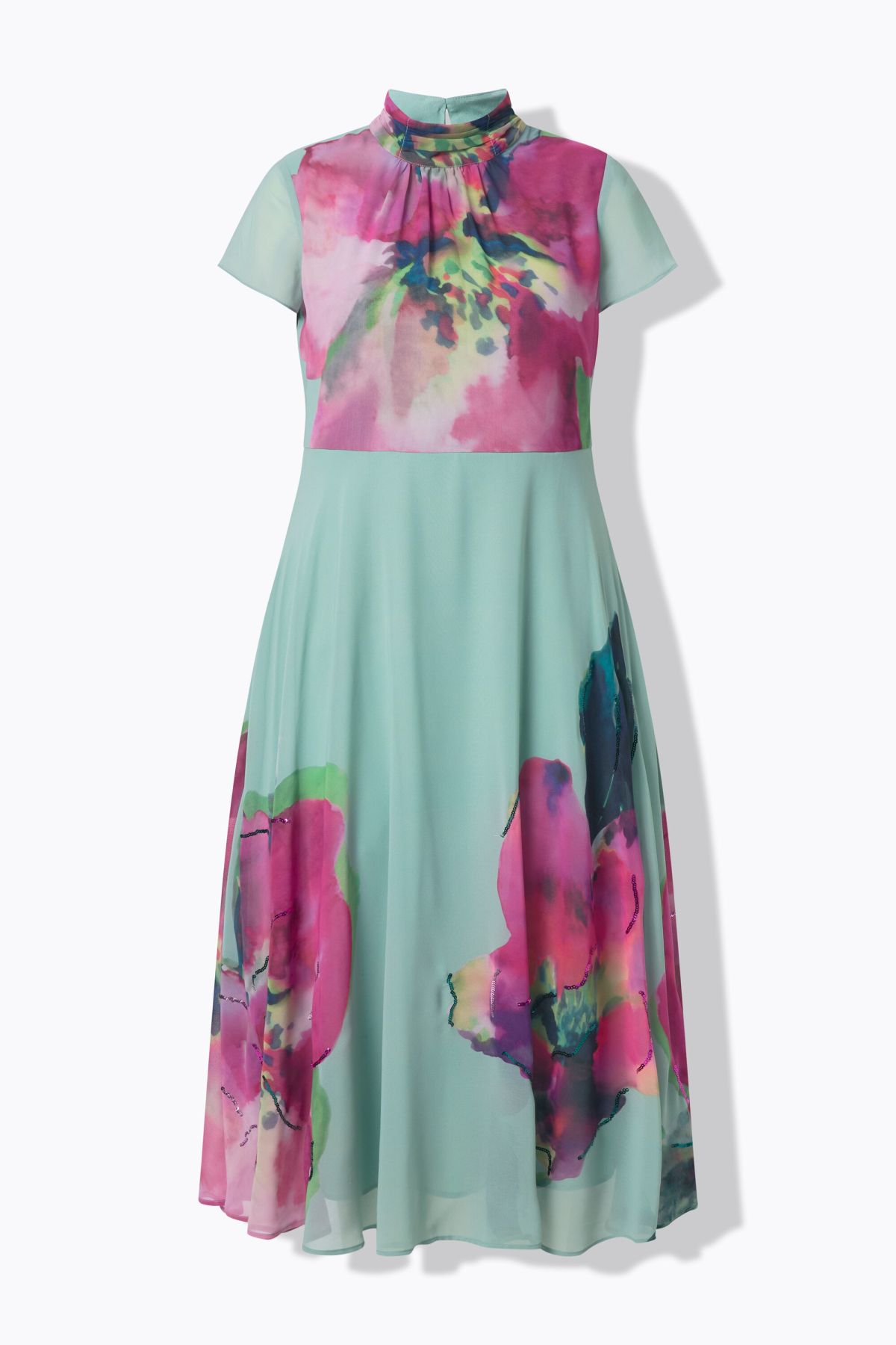 Mousseline aérienne avec paillettes et imprimé floral, Col montant avec fronces, Modèle sans manches, coupe confortable, Fond de robe en jersey opaque, Long. env. 126 cm.