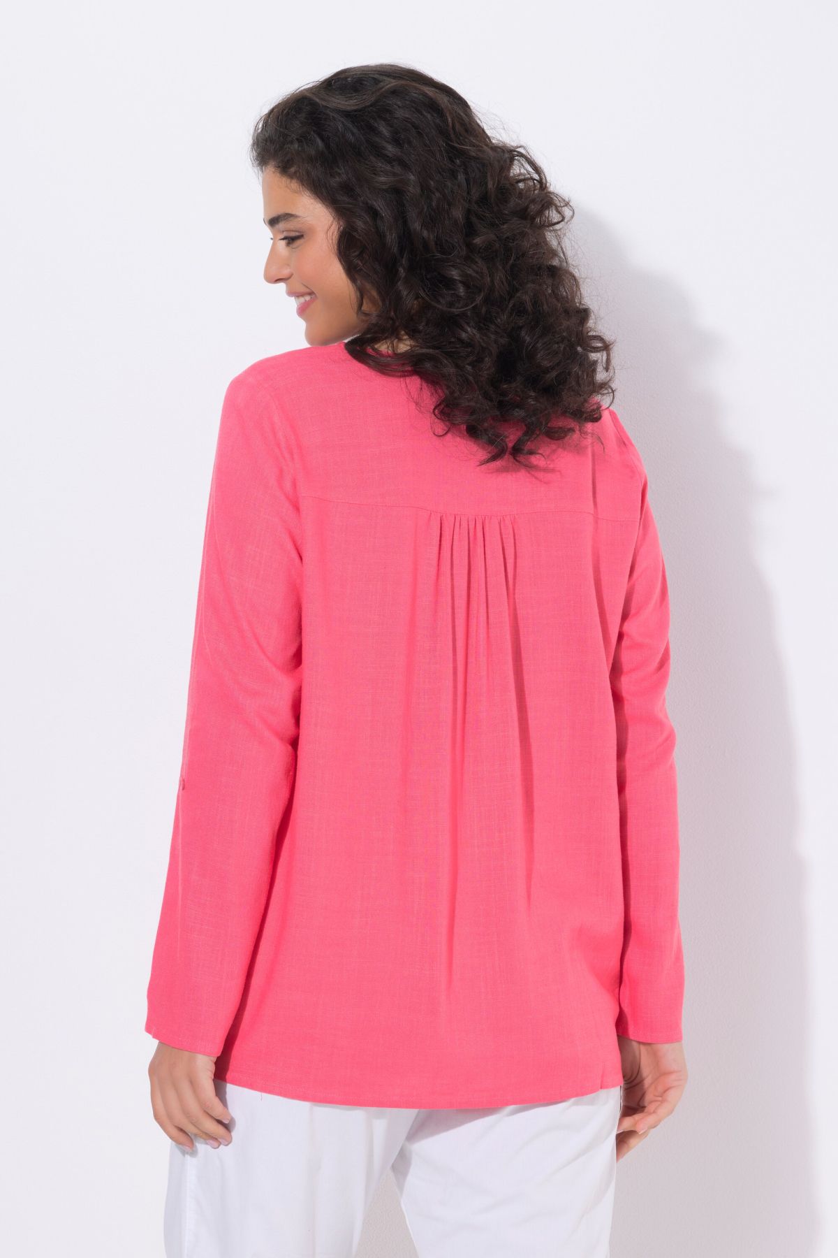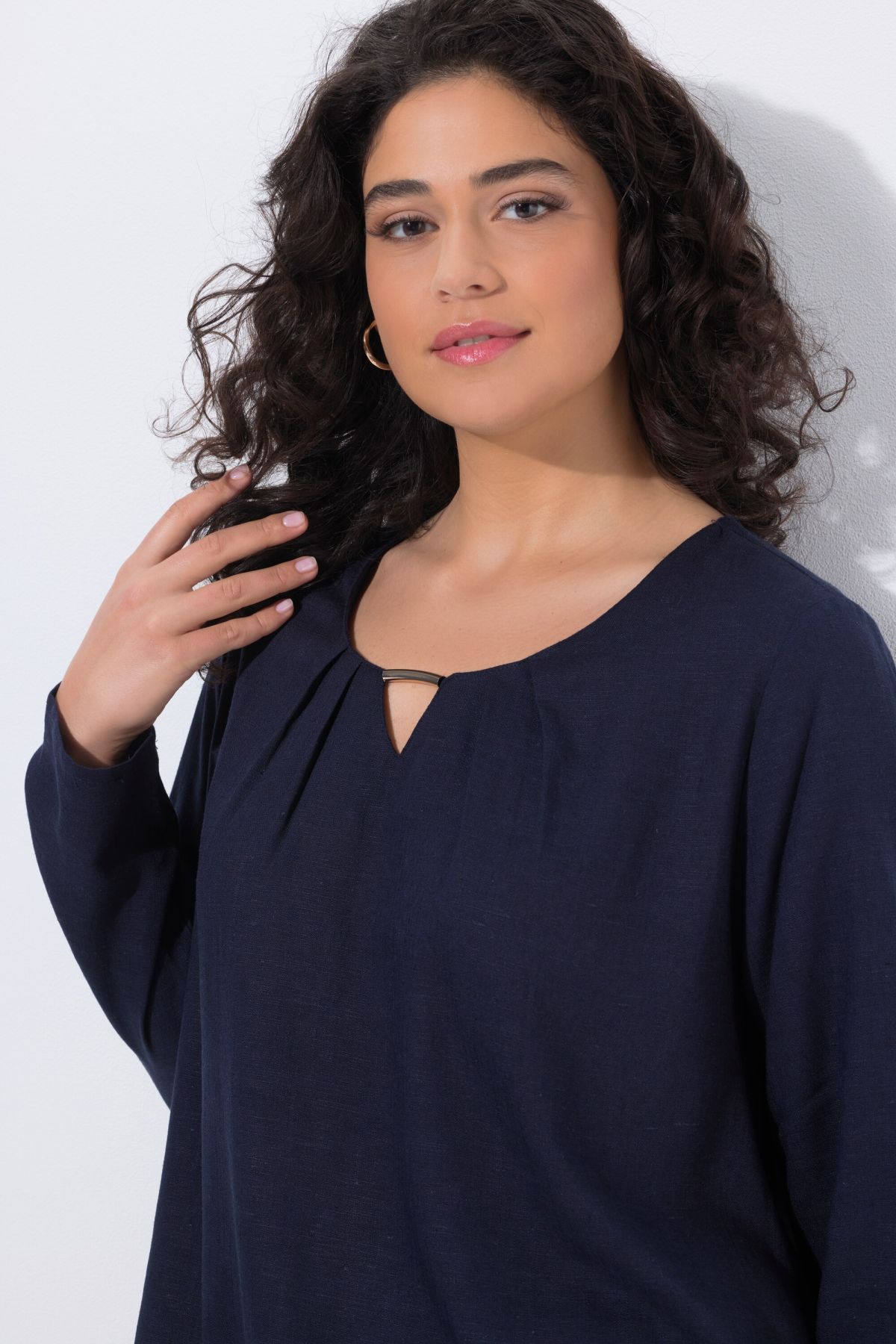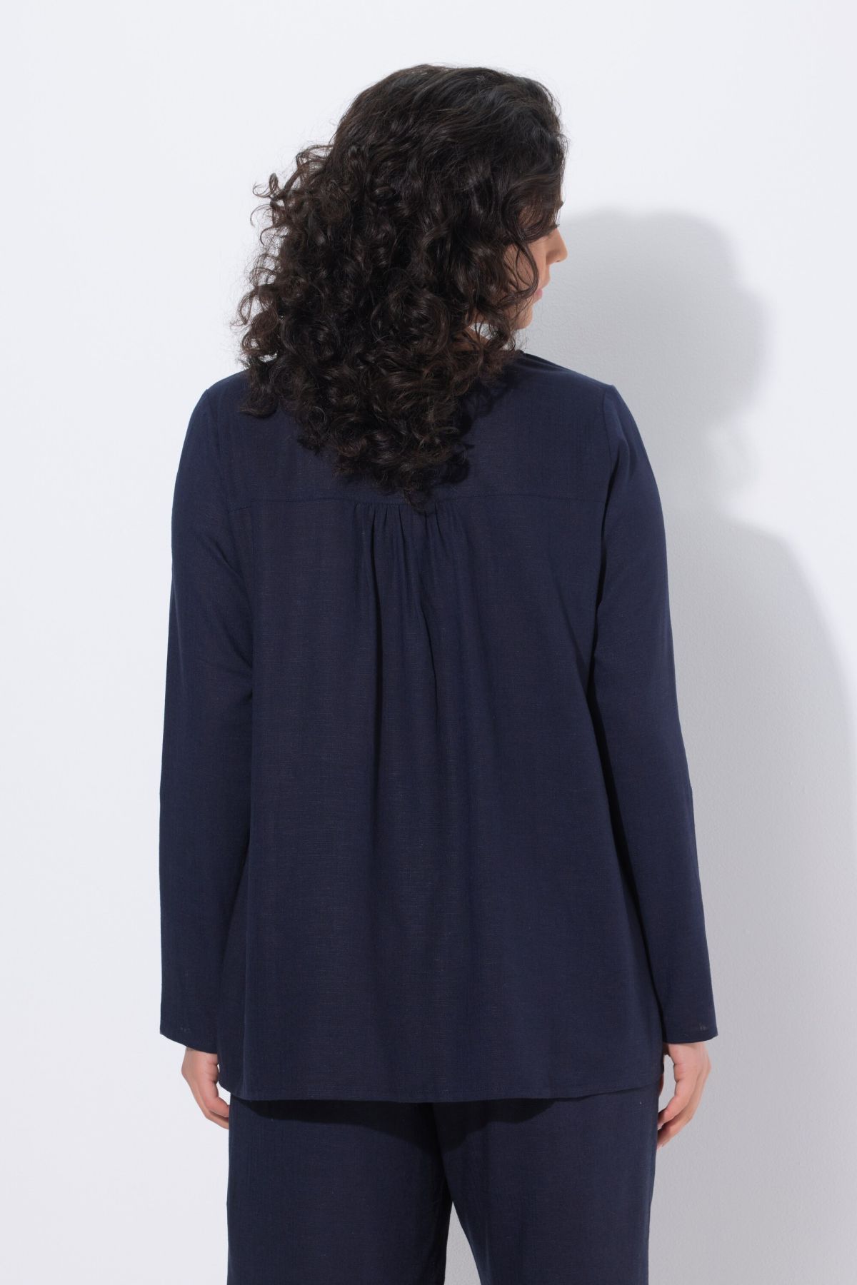 Barrette fantaisie, Décolleté rond, Coupe évasée confortable, avec pli dans le dos, Manches 3/4 avec pattes de retroussage, Lin mélangé de très grande qualité, Long. selon taille env. 72-76 cm.