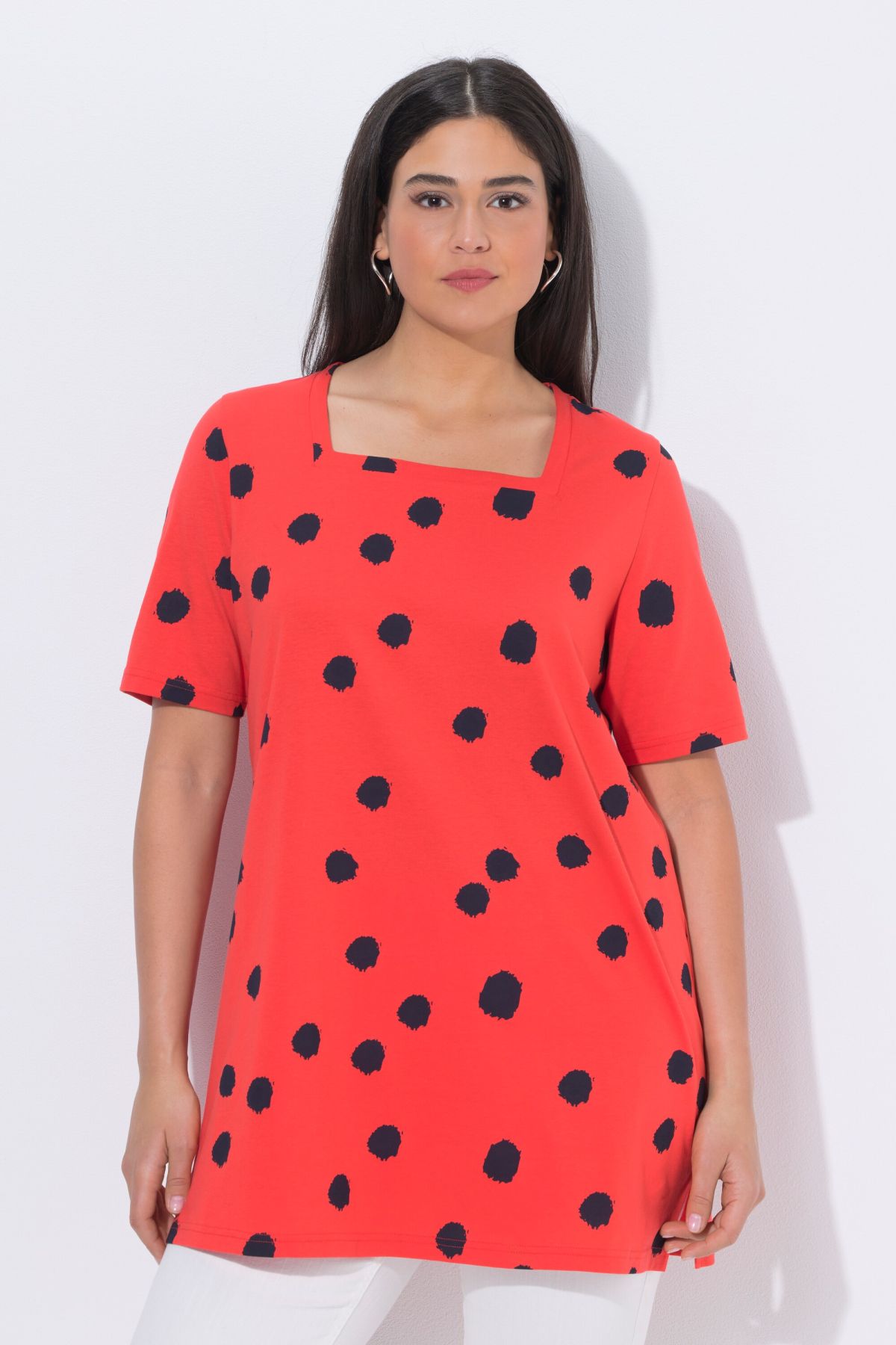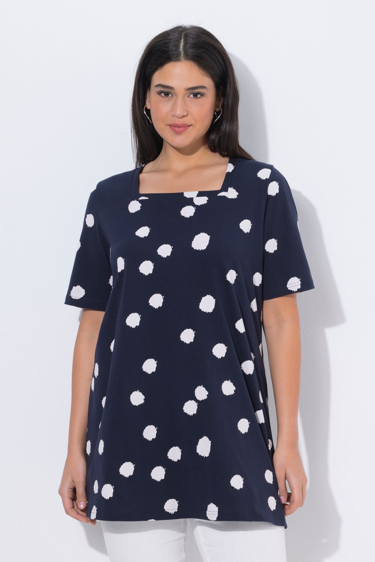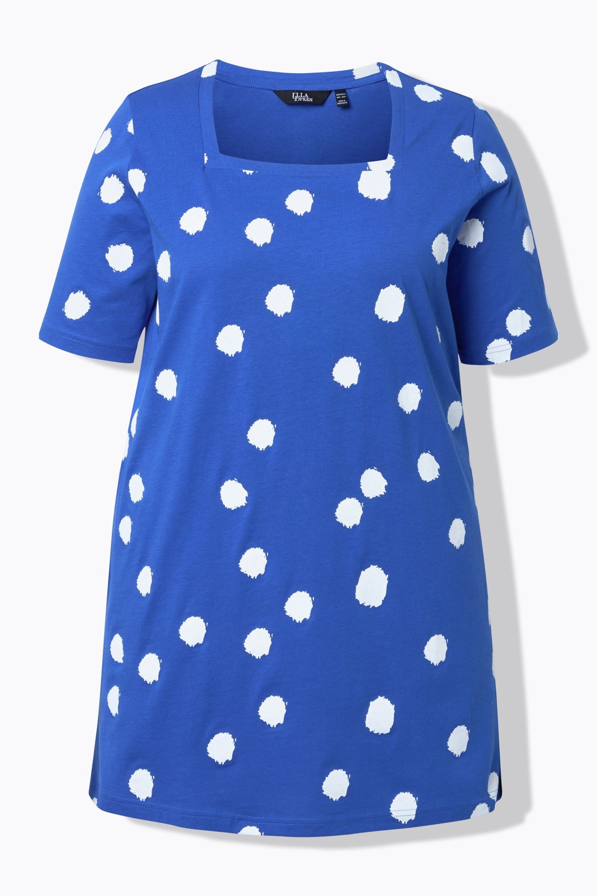 Motif à pois tendance, Décolleté carré, Coupe évasée plus longue que la normale, base agréablement large, Manches courtes, Pur coton, Long. selon taille env. 81-85 cm.