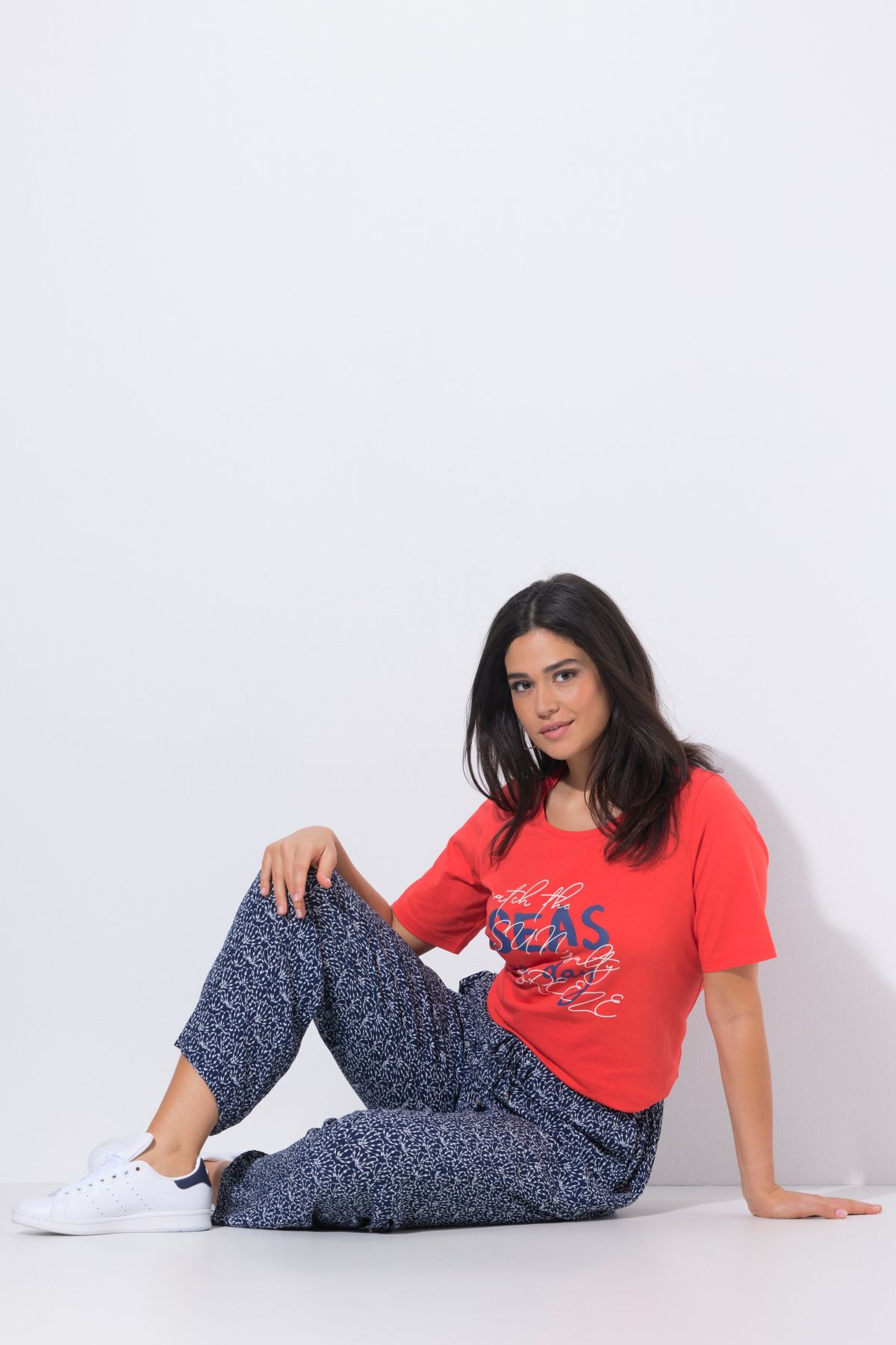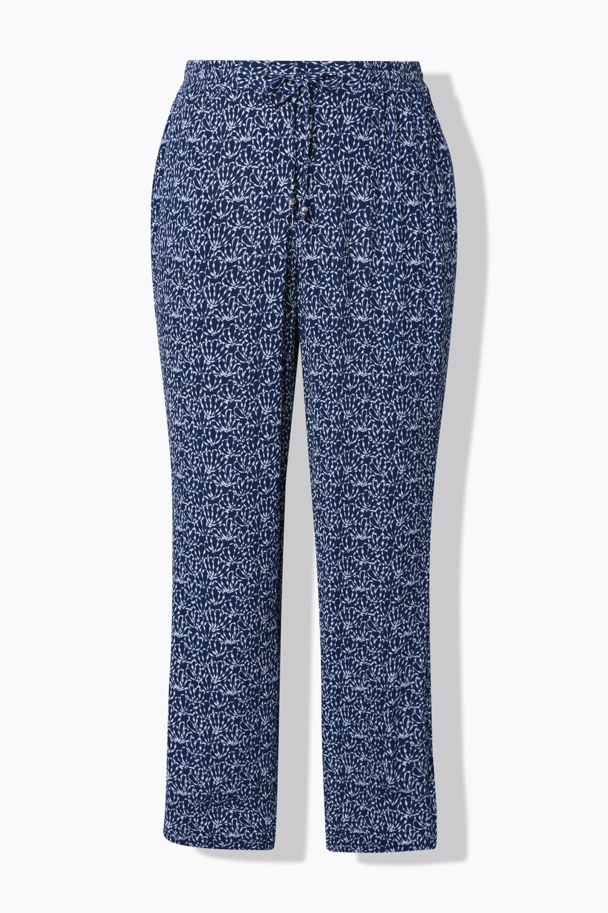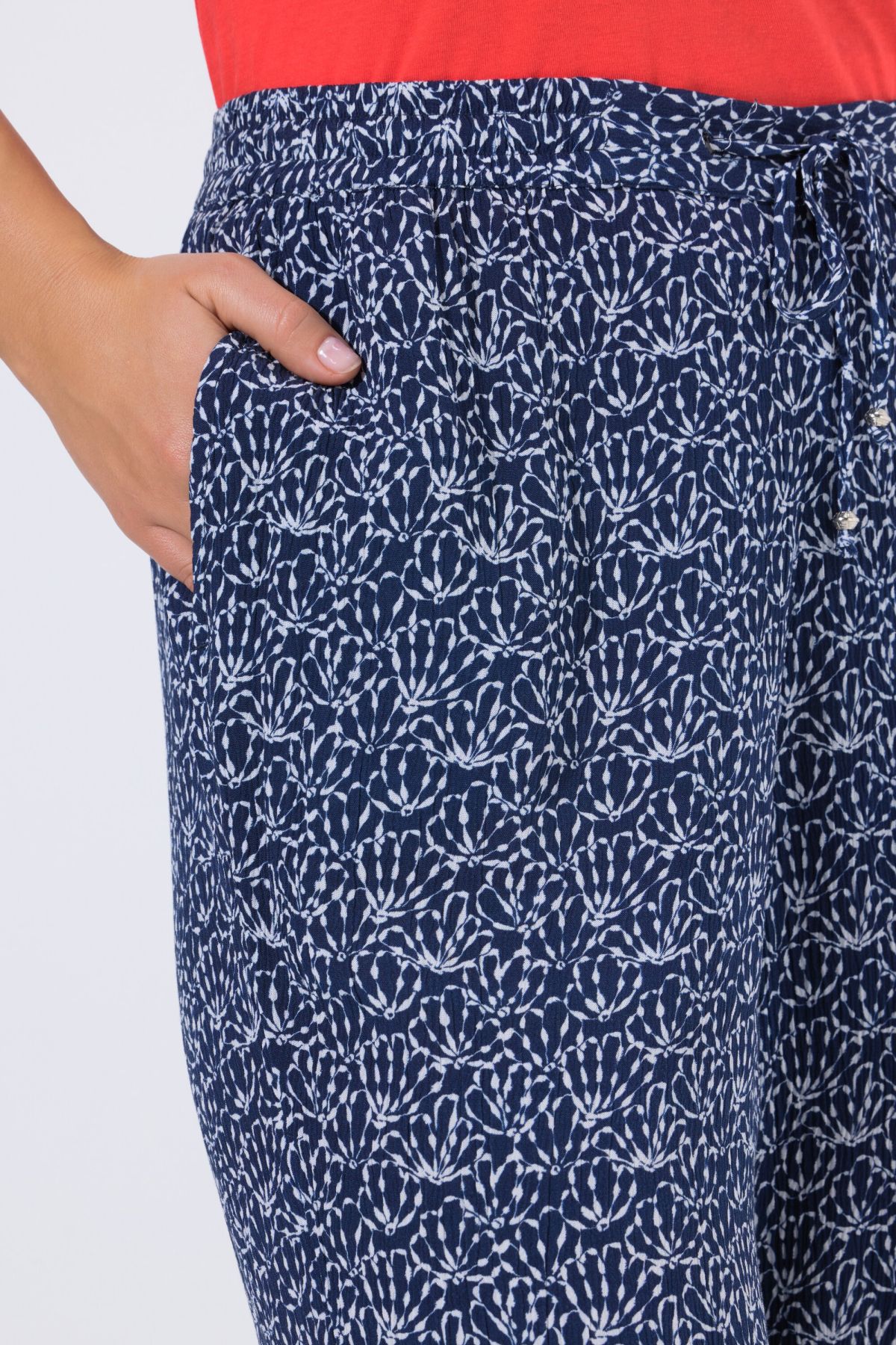 Tissu crêpe très simple d'entretien, imprimé tendance, Modèle Rose, jambe droite et large, Taille élastique confortable avec cordon de serrage, Deux poches sur les côtés, une poche à l'arrière, Viscose douce et confortable, au tombé fluide, Entrej. env. 7