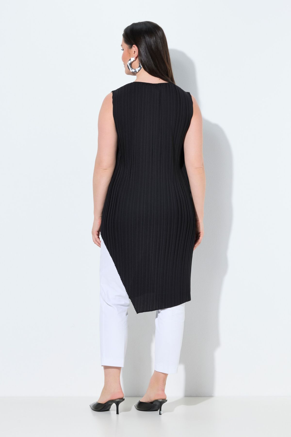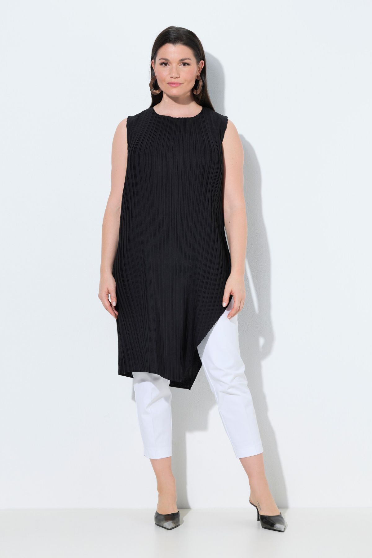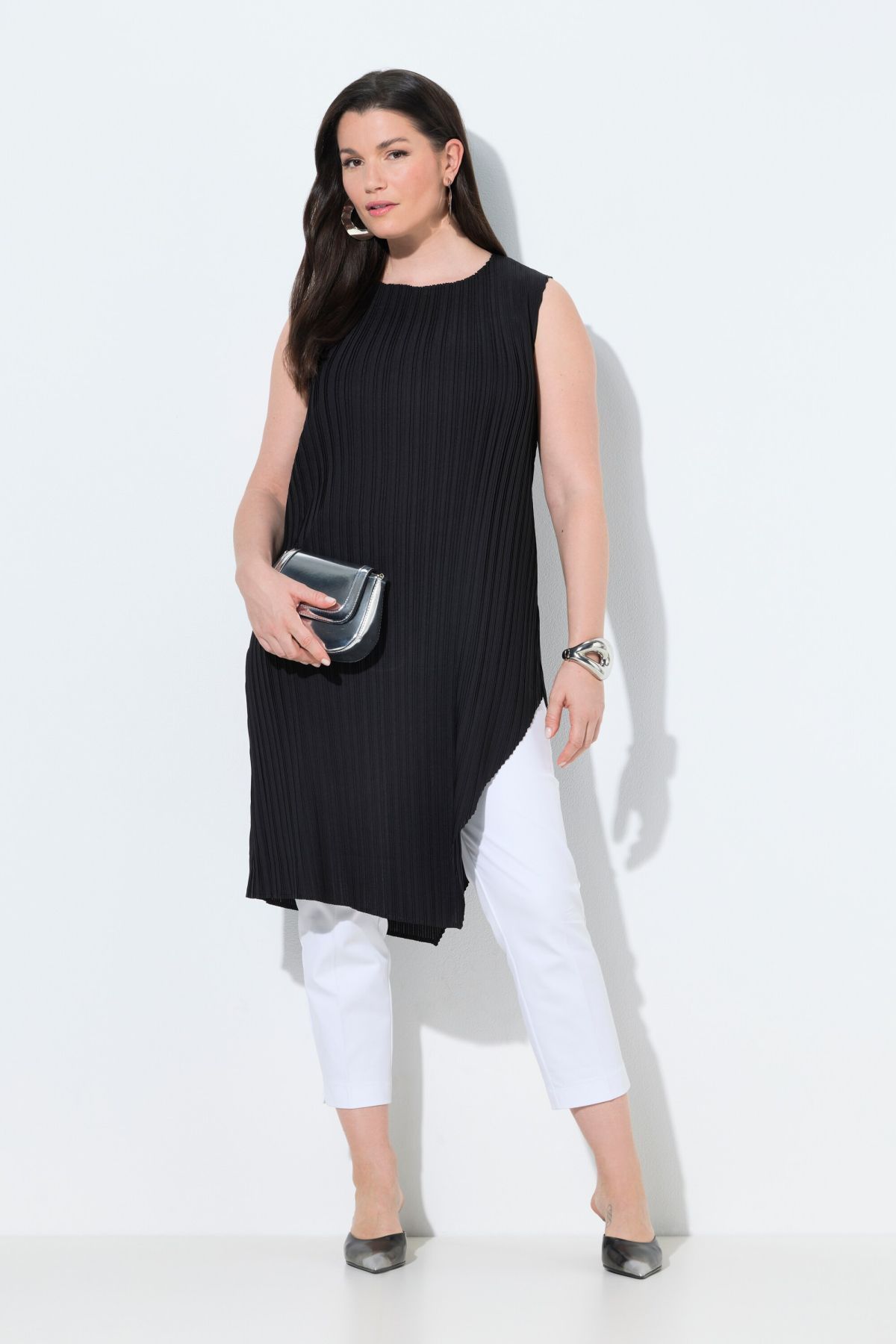 Plis élégants, Décolleté rond, Coupe Classic Fit, Profondes fente de chaque côté, Modèle sans manches, Long. env. 90 cm.