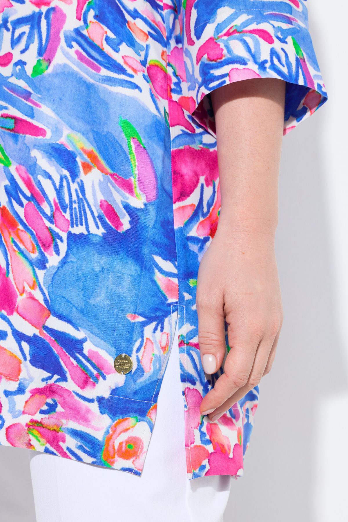 Superbe imprimé haut en couleurs, Col tunisien avec pli fantaisie, Coupe évasée confortable, longues fentes sur les côtés, Manches 3/4 avec manchettes, Viscose douce et confortable, au tombé fluide, Long. selon taille env. 82-86 cm.