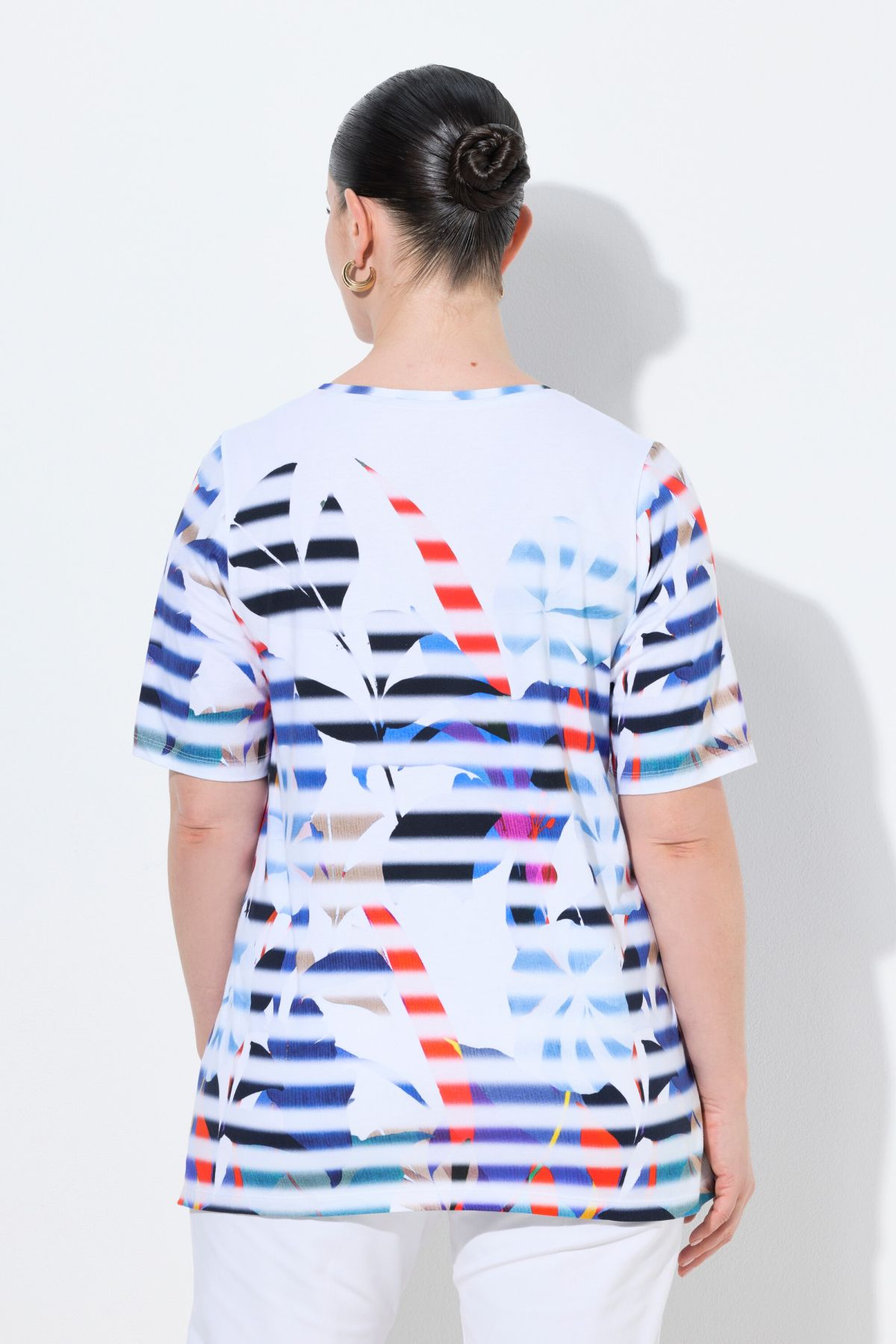 Jersey de coton doux et confortable, motif à rayures avec fleurs, Col rond, Coupe évasée, base ample et confortable, Manches courtes, Coton Pima de grande qualité, avec teneur en élasthanne, Long. selon taille env. 72-76 cm.