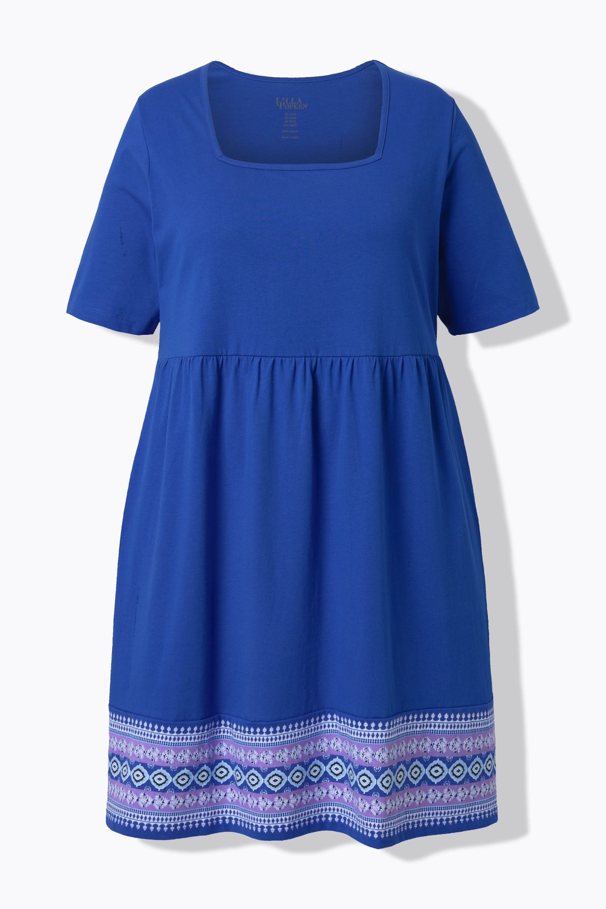 Imprimé tendance à la base, Décolleté carré, Coupe évasée confortable, plus longue que la normale, Manches courtes, Pur coton, Long. env. 91 cm.