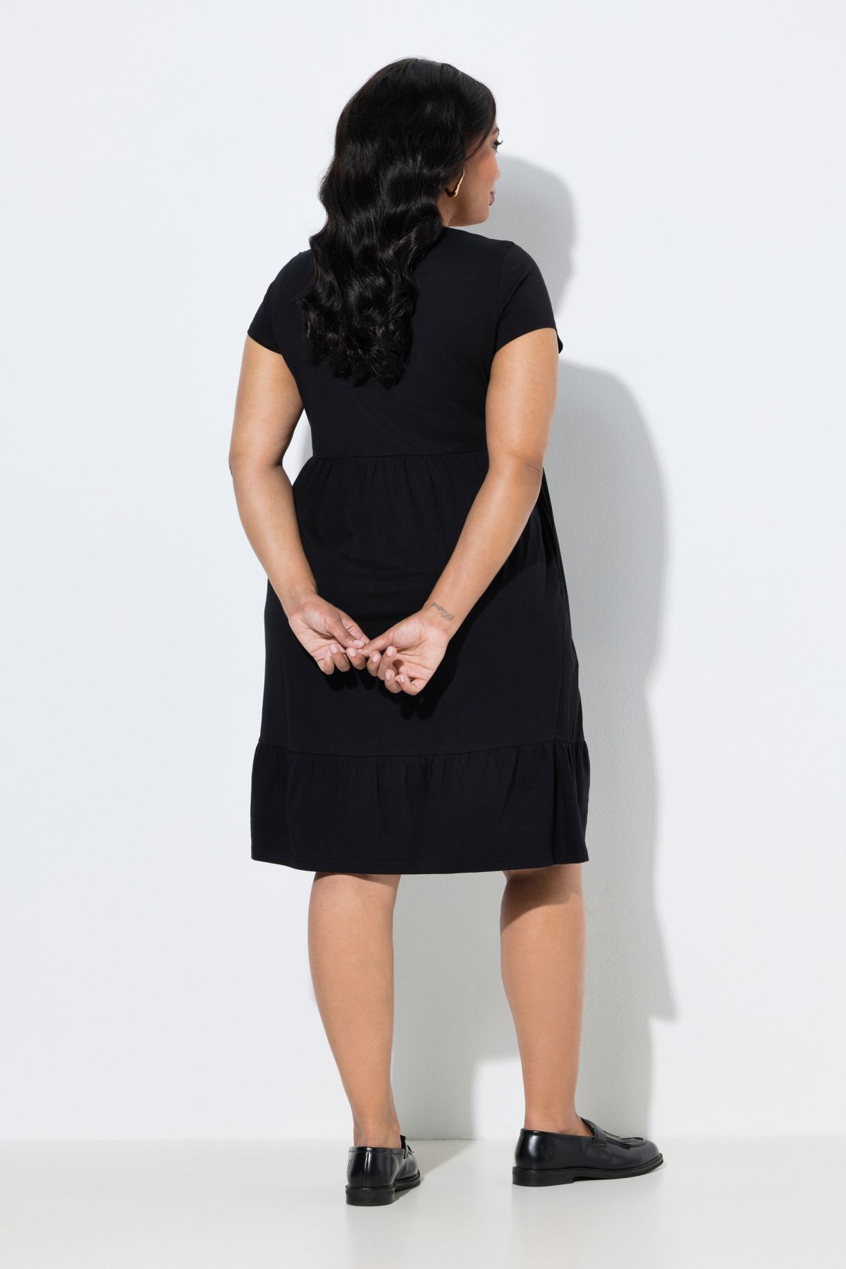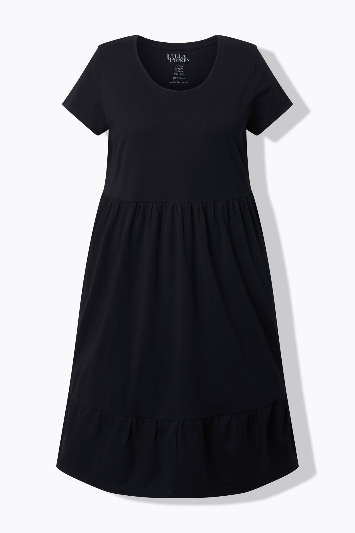 Jersey doux et confortable, Décolleté rond, Coupe évasée, volant à la base et poches sur les côtés, Manches papillon courtes et amples, Pur coton, Long. env. 100-105 cm.