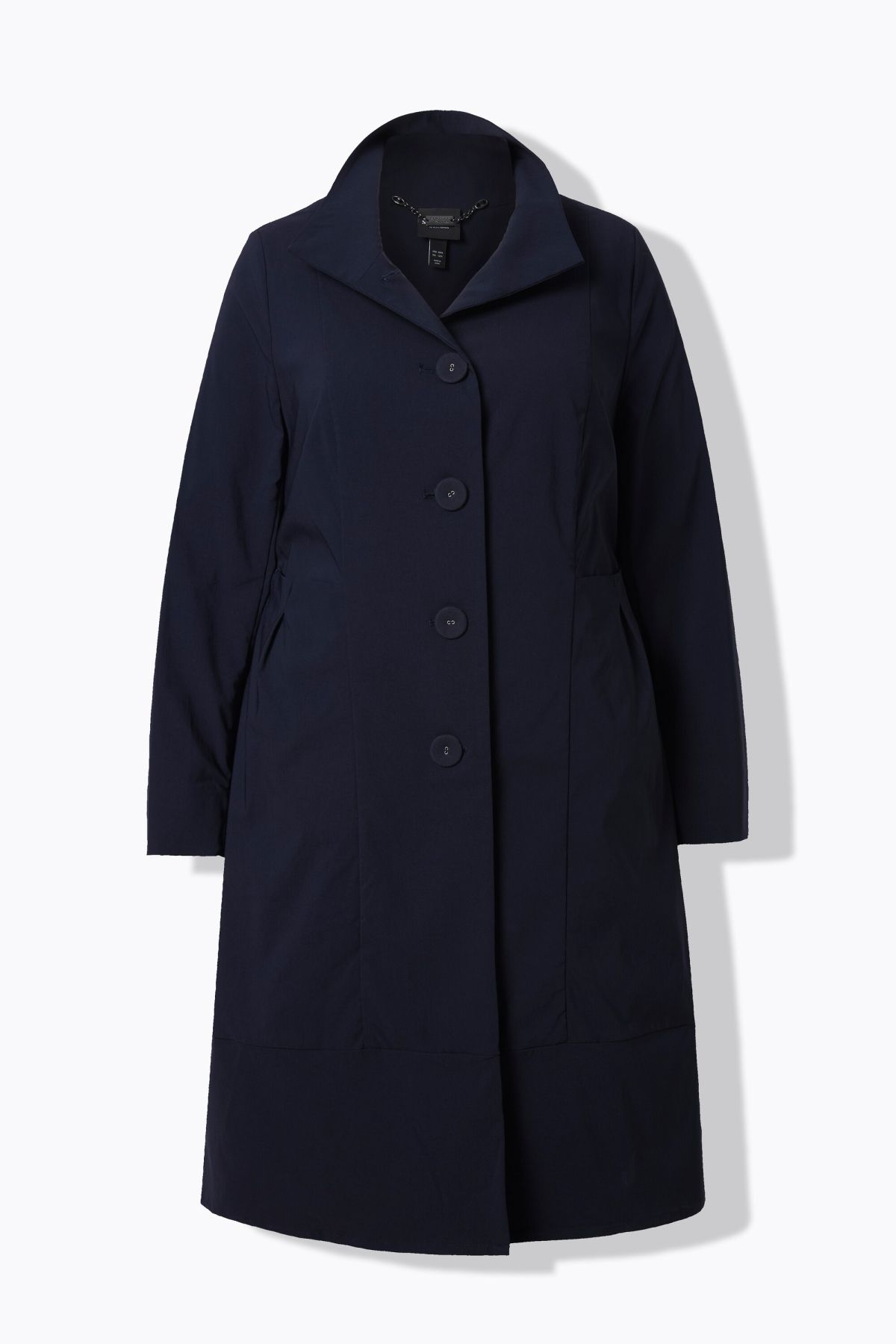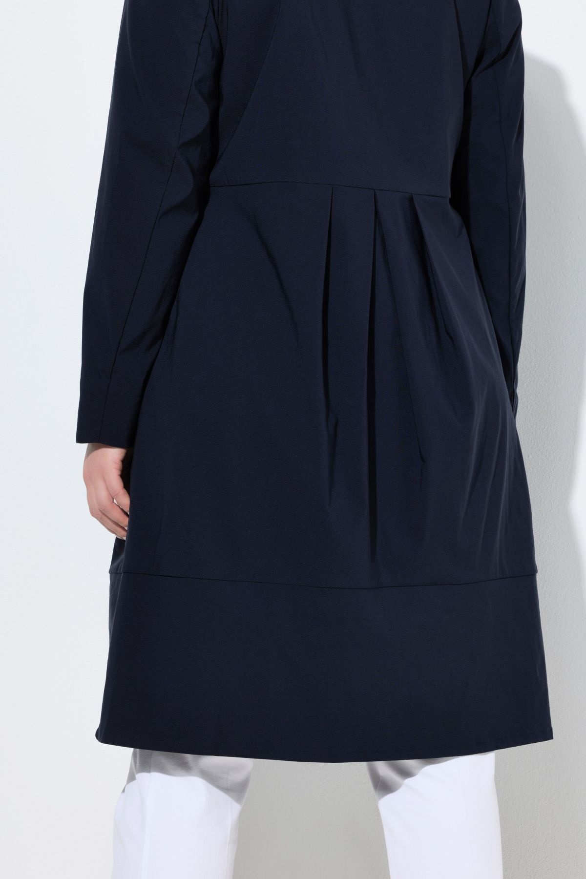Tissu agréablement élastique, pratiquement infroissable et toujours impeccable, Style tendance avec grand col montant, Coupe évasée, base ample et confortable, Deux poches, Finitions intérieures avec passepoils en satin chatoyant, Long. env. 105 cm.
