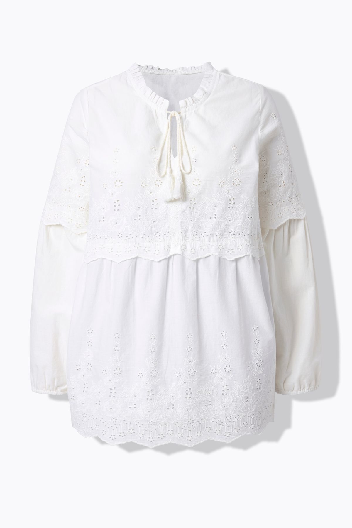 Blouse brodée, col avec ruché et manches longues, coupe évasée