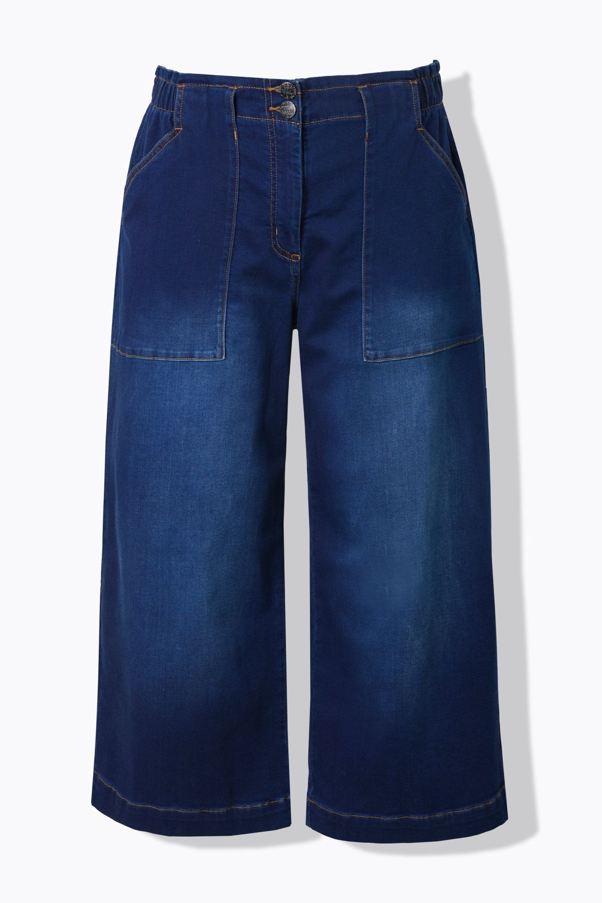 Denim extensible, doux et confortable, Modèle Rose, jambe droite et large, Deux poches plaquées, Passants pour ceinture, bouton et fermeture à glissière, Coton naturel enrichi en élasthanne, Entrej. env. 64 cm.