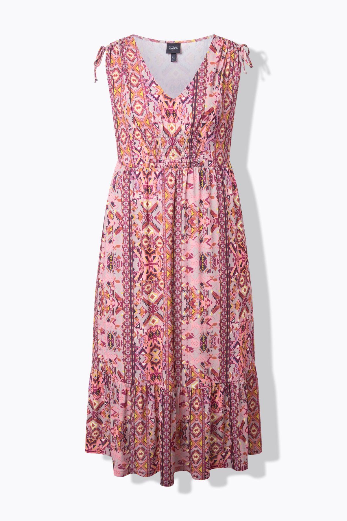 Imprimé graphique tendance, Décolleté en V, Empiècement smocké élastique, Épaules basses, avec petits cordons à froncer, Base volantée, Long. env. 132 cm.