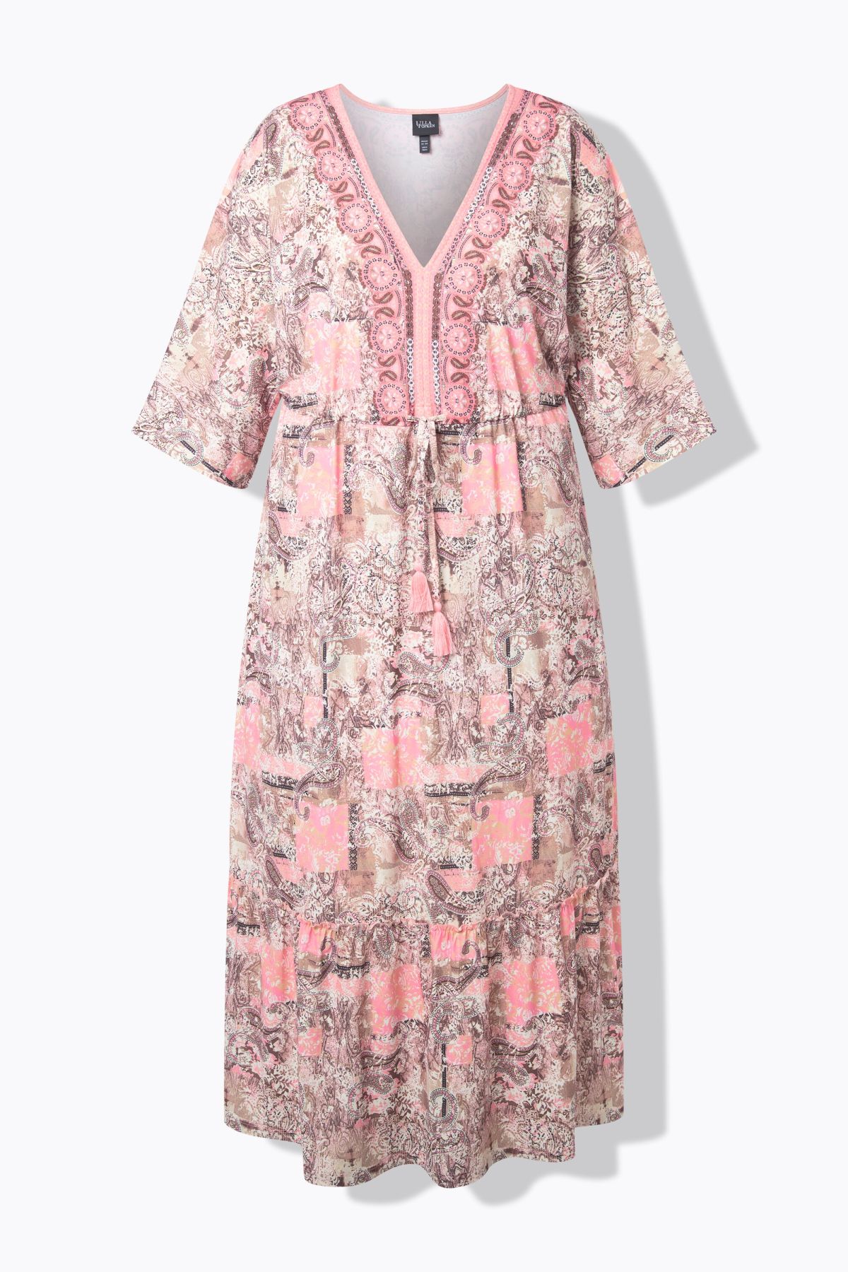 Jersey élastique, imprimé tendance, Décolleté en V, Coupe confortable, cordon de serrage coulissant dans la taille, Manches 3/4 amples, Volant à la base avec ruché, Long. selon taille env. 134 cm
