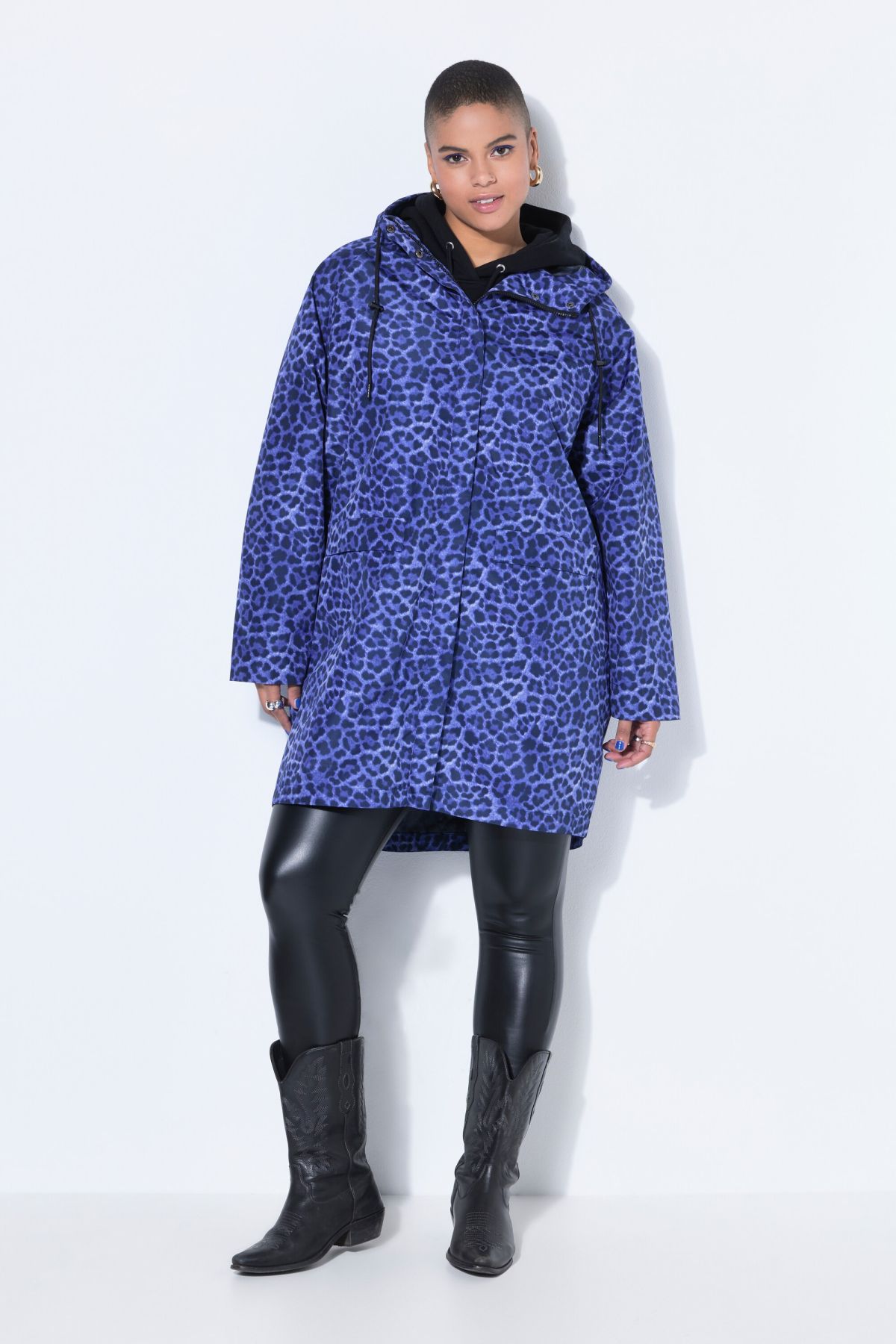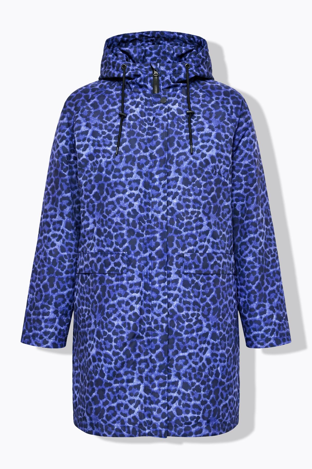 Imperméable à imprimé léopard. Toutes les coutures sont soudées. Coupe ample et droite à col droit et capuche à cordon. Fermeture éclair à double sens invisible, poches plaquées. Imperméable grâce au rabat. Base arrondie au dos. Dos env. 7 cm plus long. Manches longues raglan à boutons-pression pour le réglage.