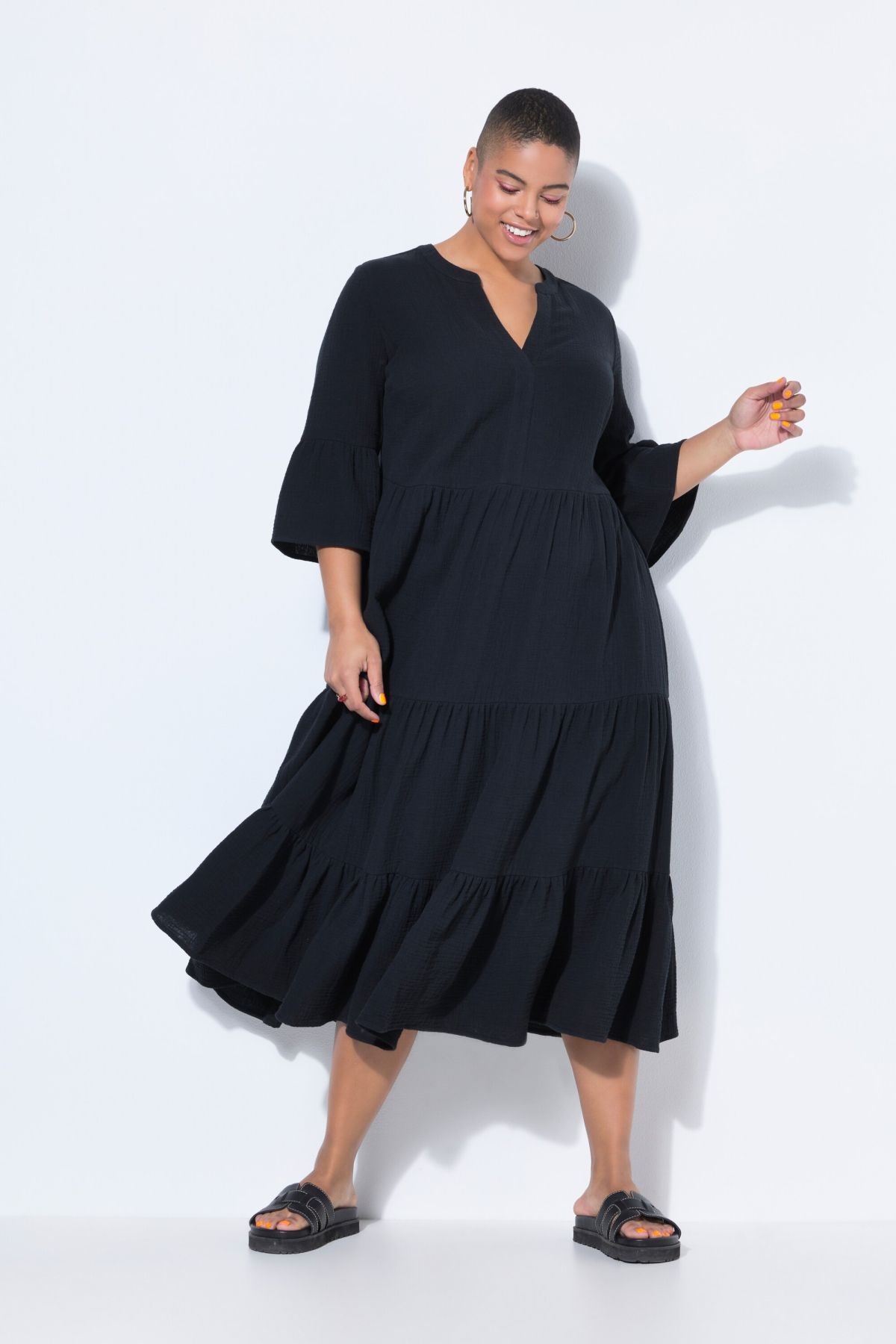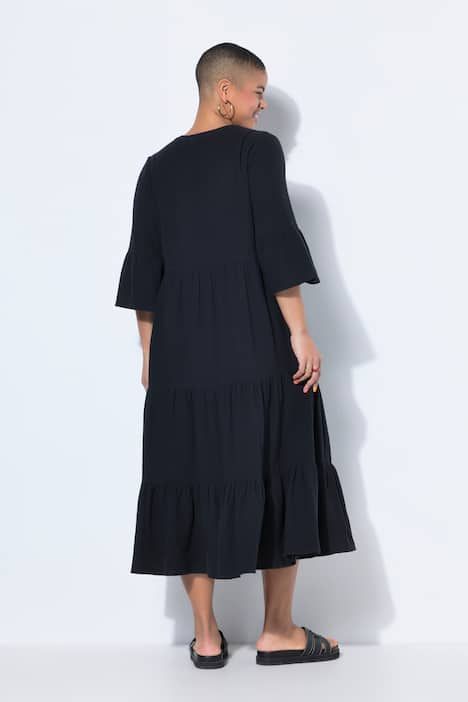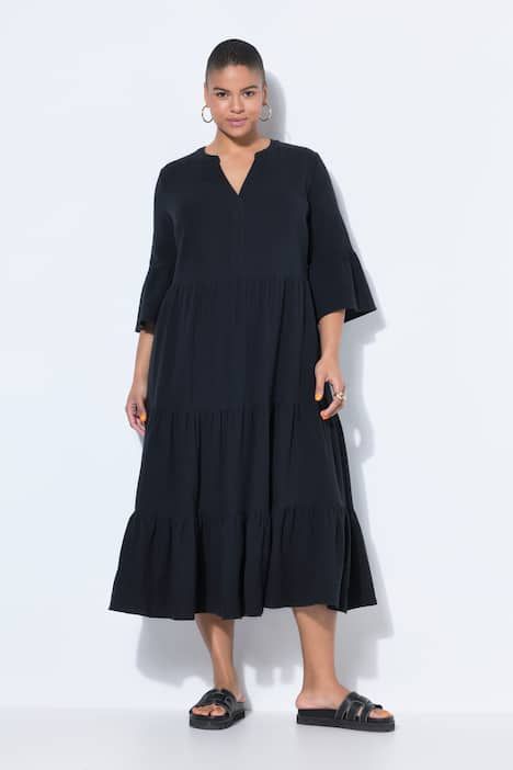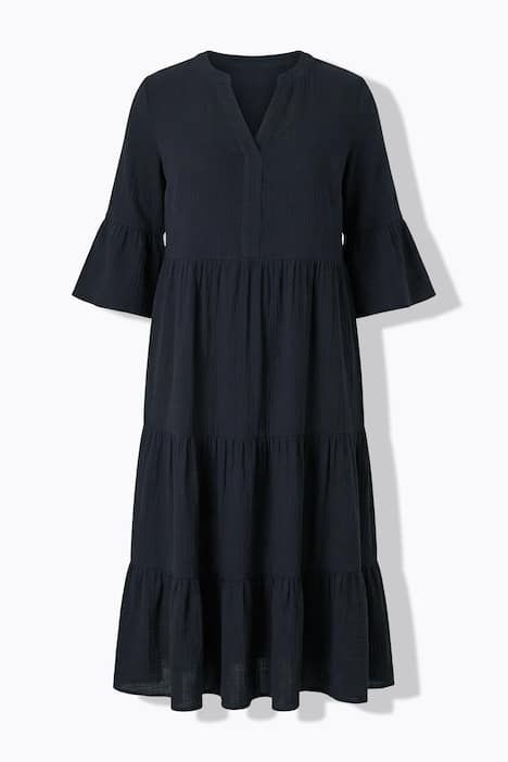 Coupe trapèze, Mousseline douce et confortable, Longueur maxi, Col montant ouvert, Volant double, manches 3/4 avec ruché, Long. env. 126 cm.