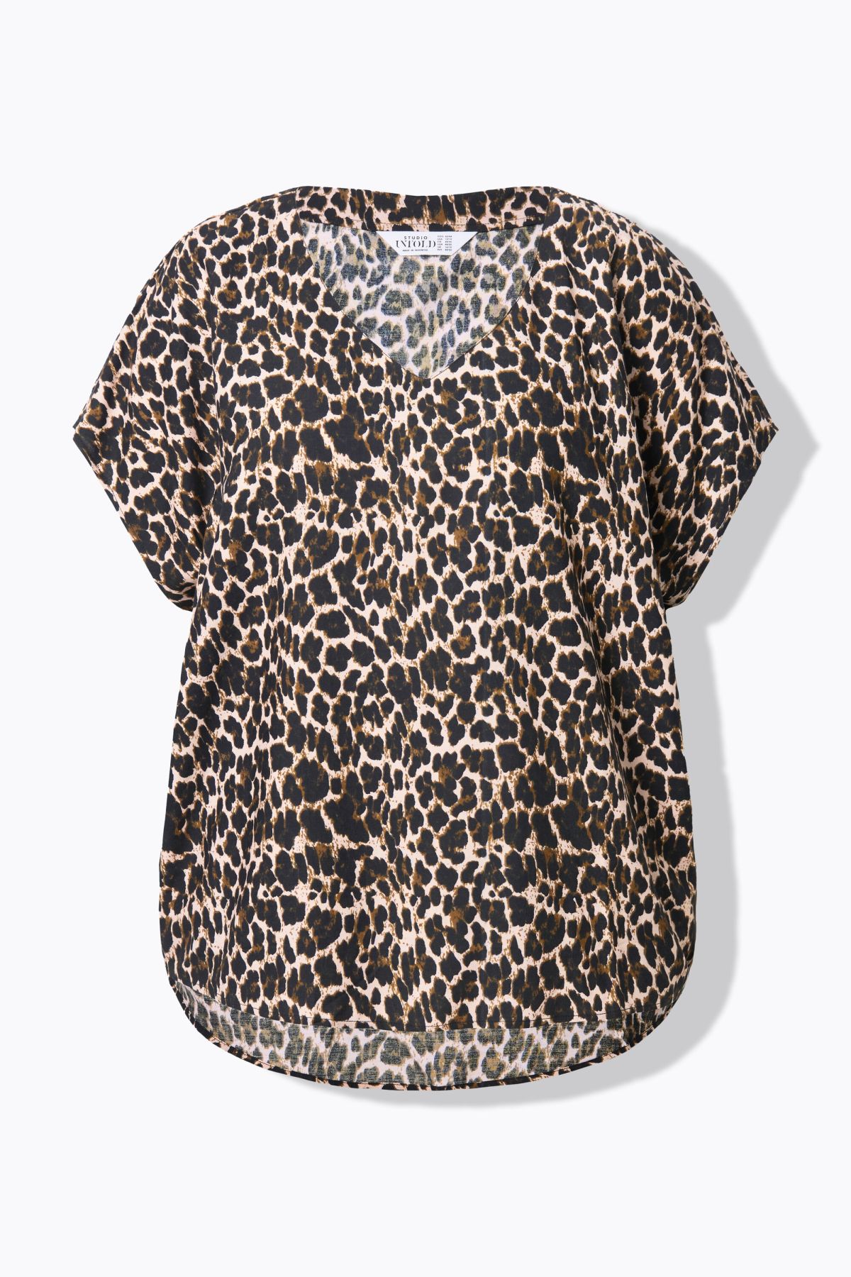 Coupe oversize, Imprimé léopard, Décolleté en V, Épaules basses, Base arrondie, plus longue dans le dos, Long. entrej. env. 74-78 cm.