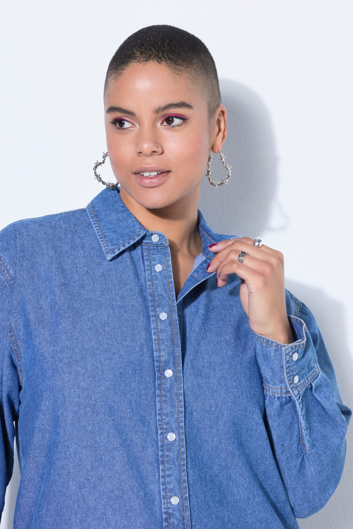 Coupe oversize, En jean souple, Col chemise, Manches longues et amples, avec poignets, Volant à la base, Long. selon taille env. 100 cm.
