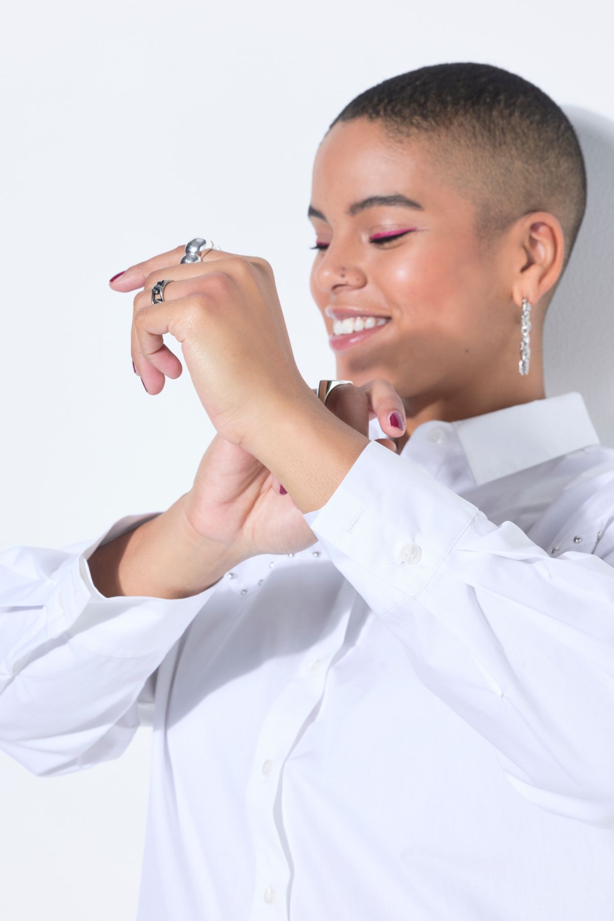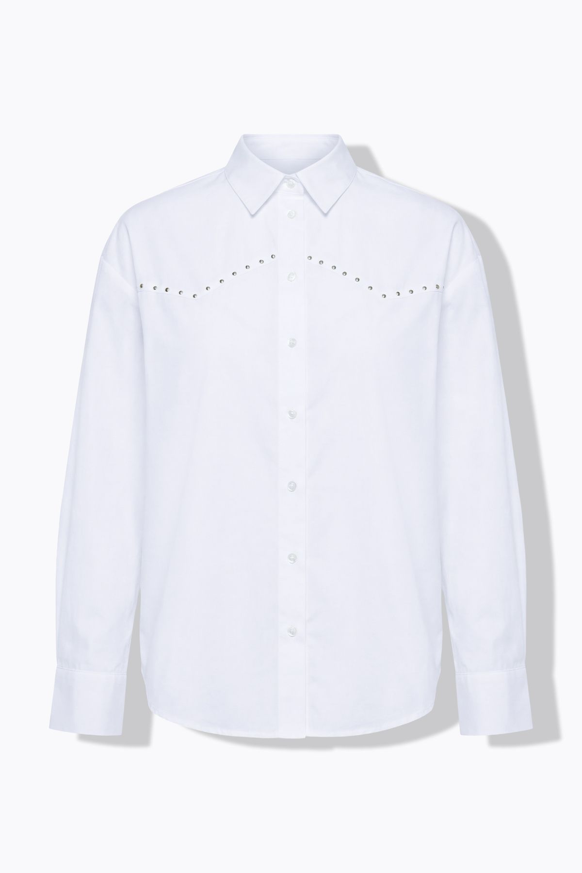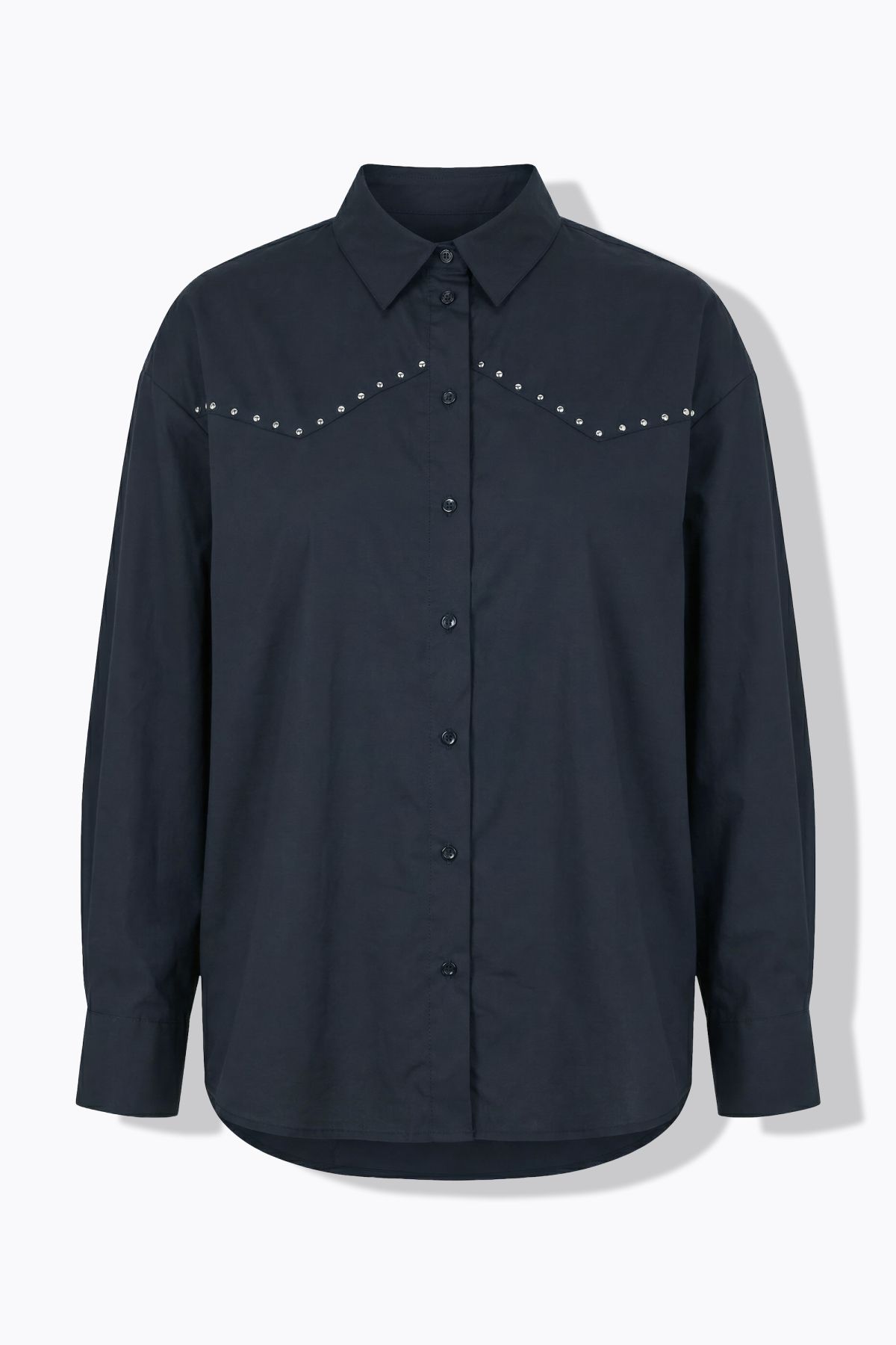 Coupe oversize, Rivets fantaisie devant, Col chemise, Manches longues avec poignetq, Base arrondie, Long. selon taille env. 76-80 cm.