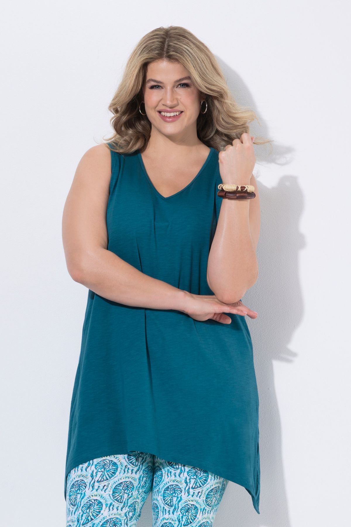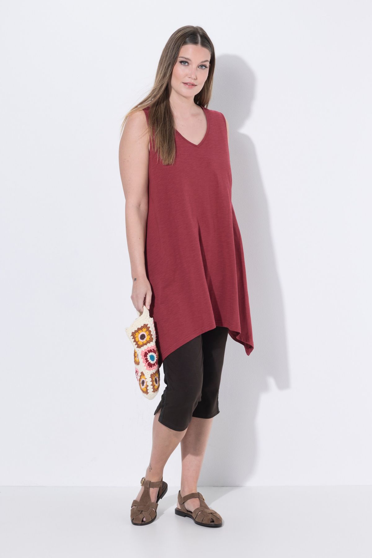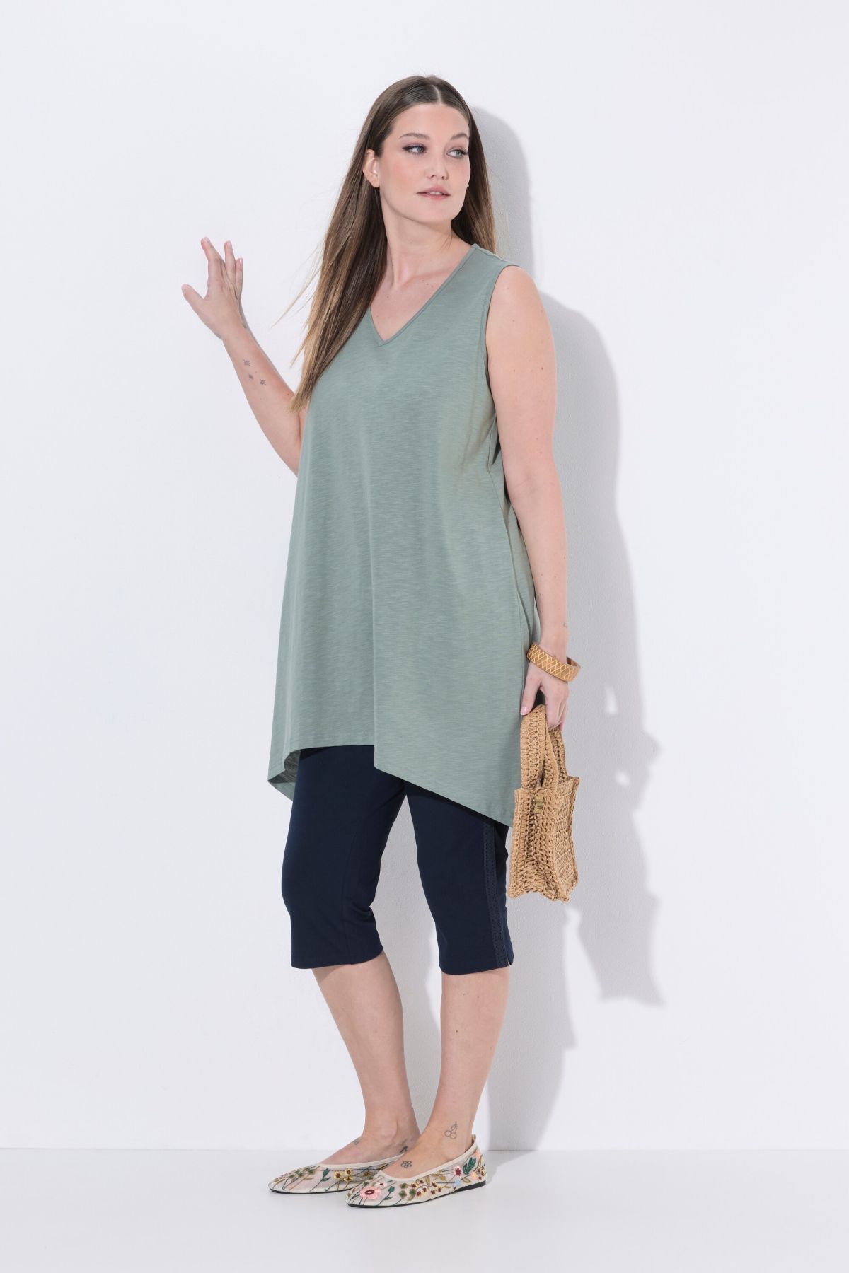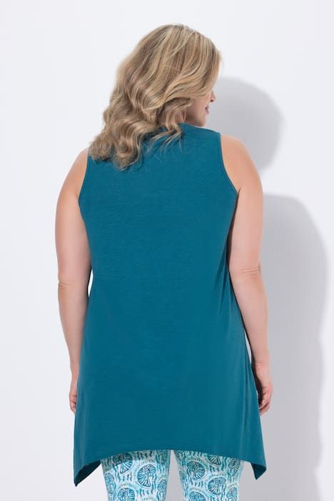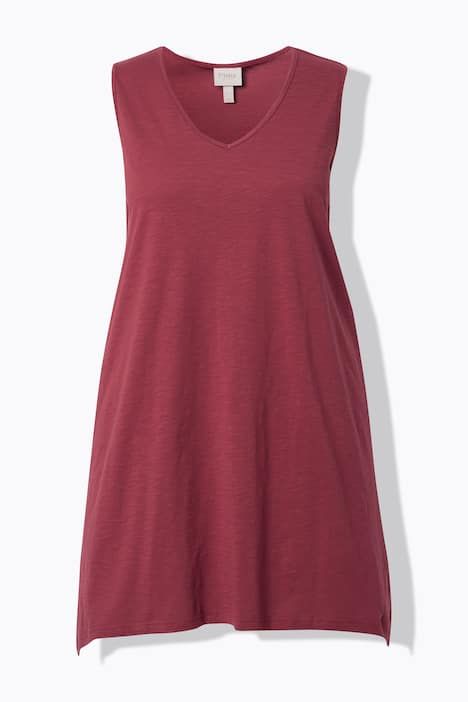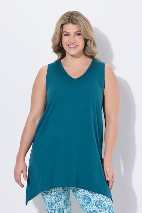 Débardeur long avec base en pointe des deux côtés. Décolleté en V. Coton bio. Coupe évasée