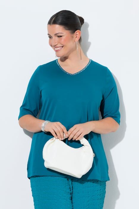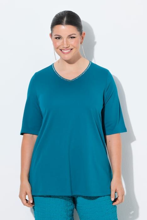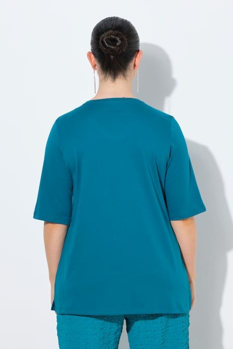 Coton doux de haute qualité, Décolleté en V à bordure raffinée, Manches courtes, Coupe évasée, base ample et confortable, Fentes sur les côtés pour une plus grande liberté de mouvement, Long. entrej. env. 72-76