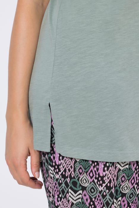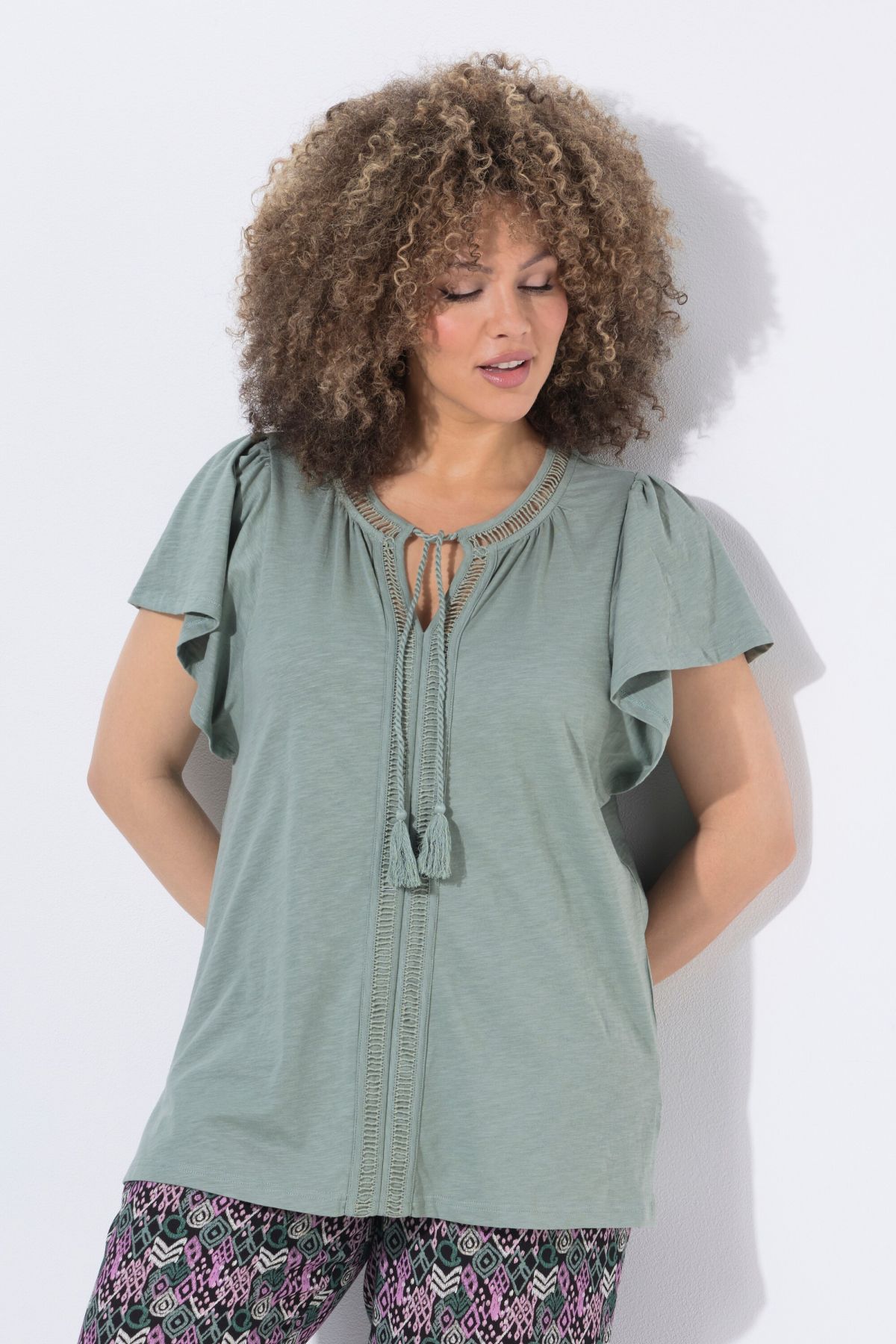 T-shirt col tunisien et manches courtes chauve-souris. Galons fantaisie.