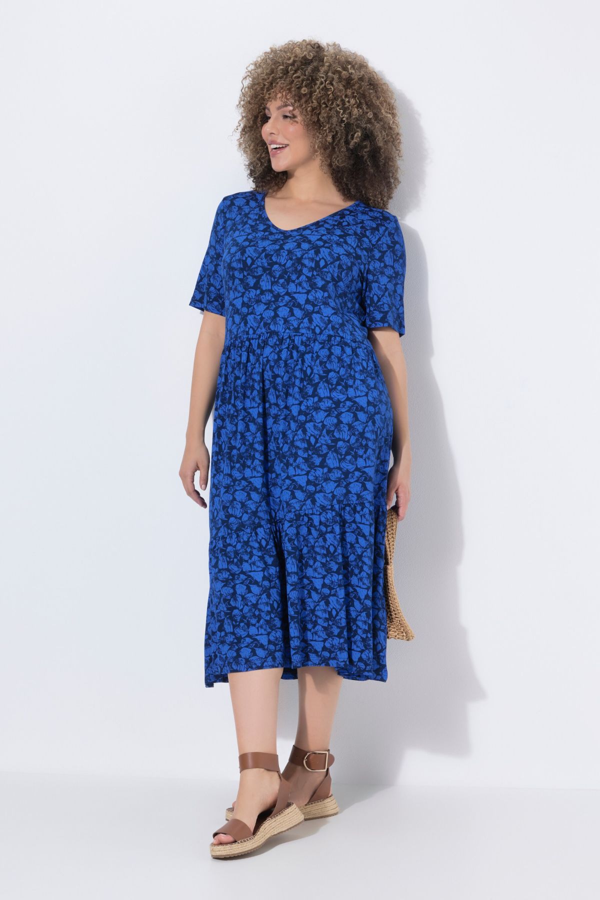 Imprimé tendance, Décolleté en V arrondi, Coupe évasée avec volants asymétriques, Manches courtes, Jersey de viscose doux et confortable, enrichi en élasthanne, Long. env. 110-114 cm.