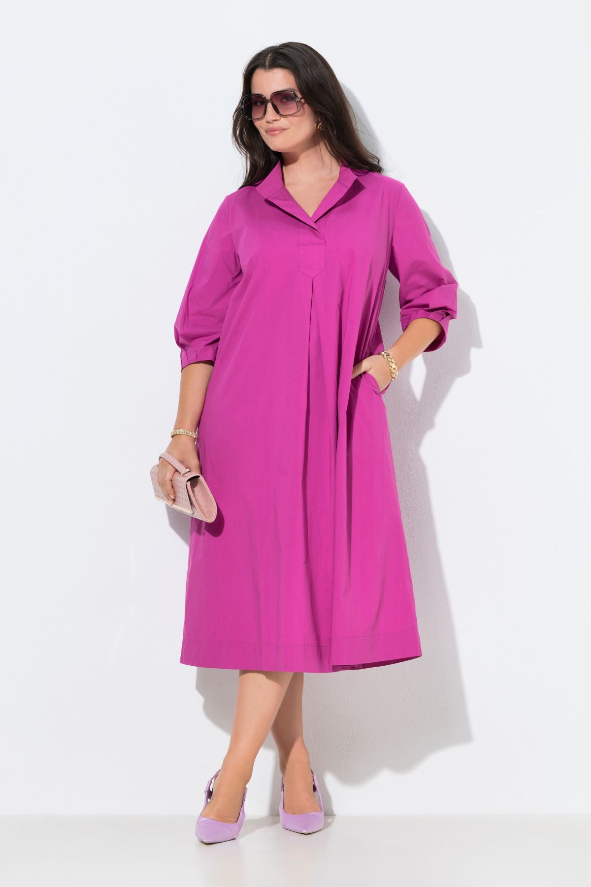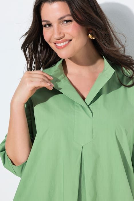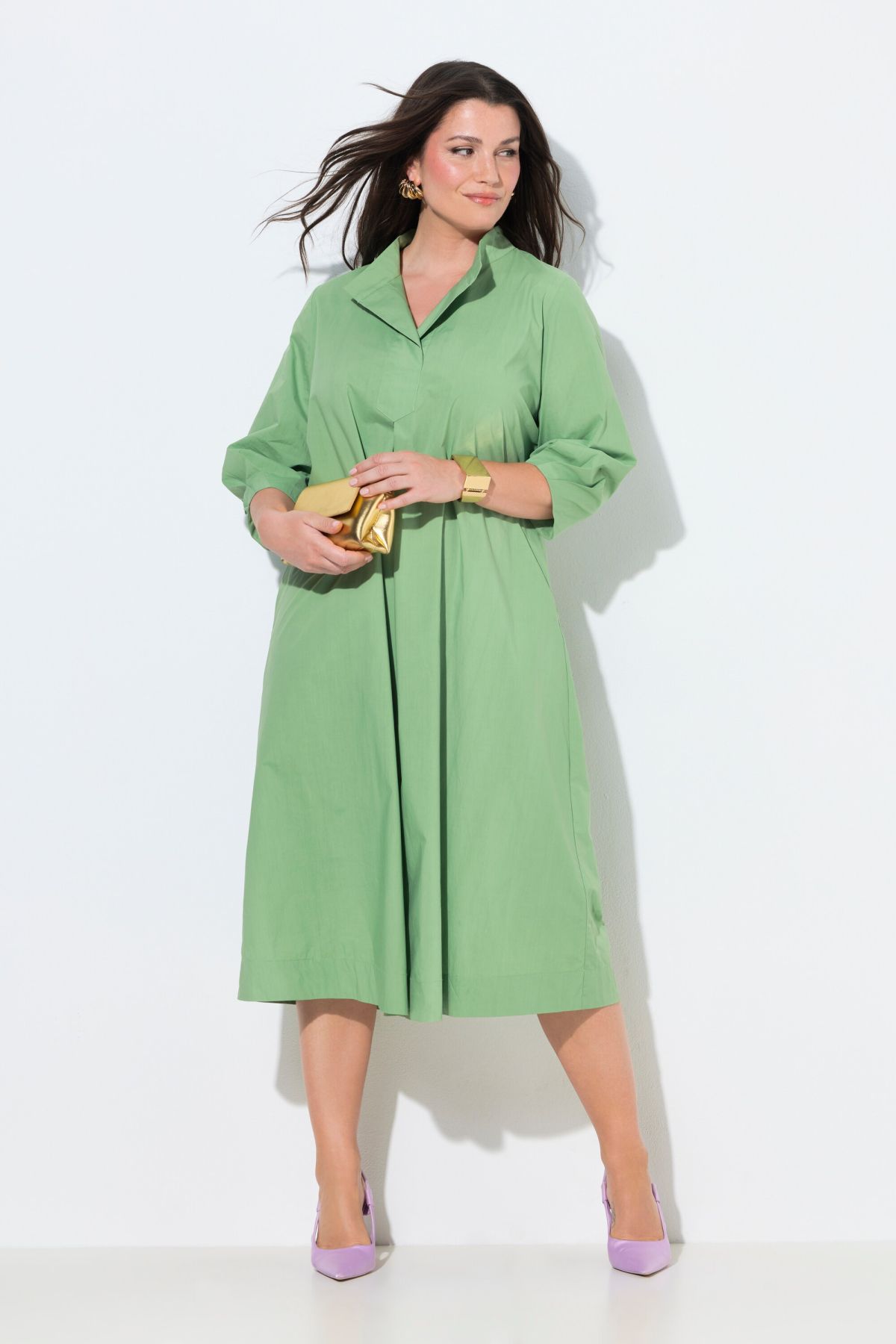 Tissu Papertouch haut de gamme, Col montant tendance, décolleté en V, Coupe évasée confortable à joli pli creux, Poches latérales réservées dans la couture, Pur coton, Long. env. 120 cm.