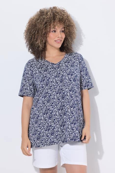 Motif poissons raffiné, Col en V à plis fantaisie, Coupe évasée, base ample et confortable, Manches courtes, Jersey flammé finement texturé, doux et confortable, Long. selon taille env. 72-76 cm.