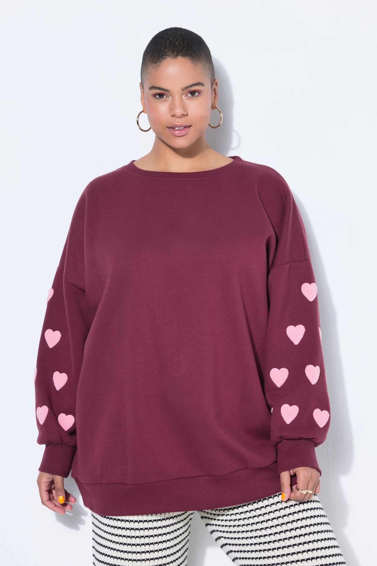Coupe ultra-oversize, Molleton doux et confortable, Cœurs en tissu éponge sur les bras, Col rond, Finitions bords-côtes, Long. selon taille env. 76-80 cm.