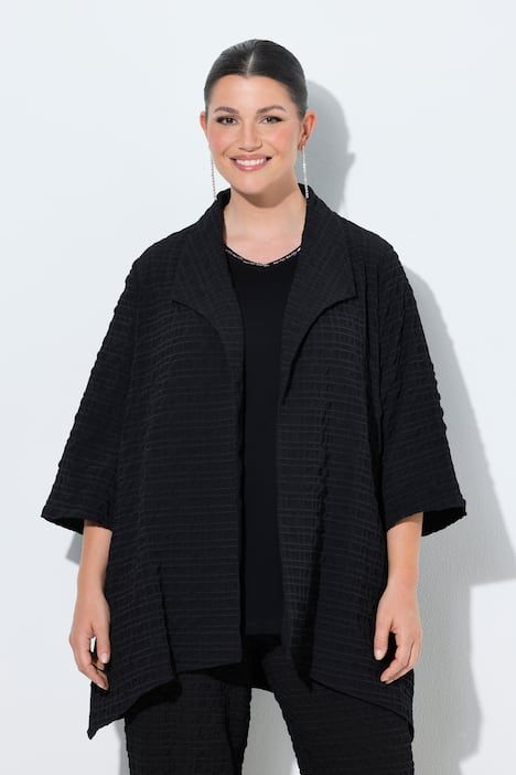 Matière texturée de grande qualité, contenant de la laine, Petit col pelle à tarte, Coupe évasée ouverte, sans fermeture, Détail tendance : base se terminant en pointe de chaque côté, Manches 3/4, Long. env. 82-86 cm.